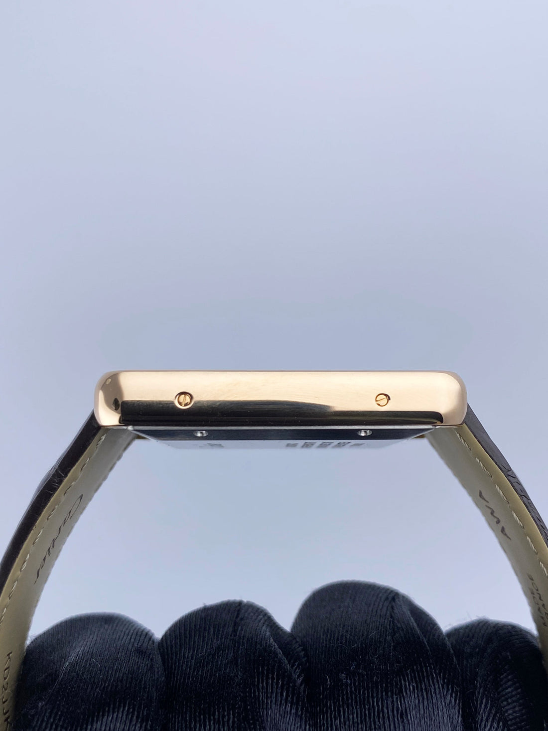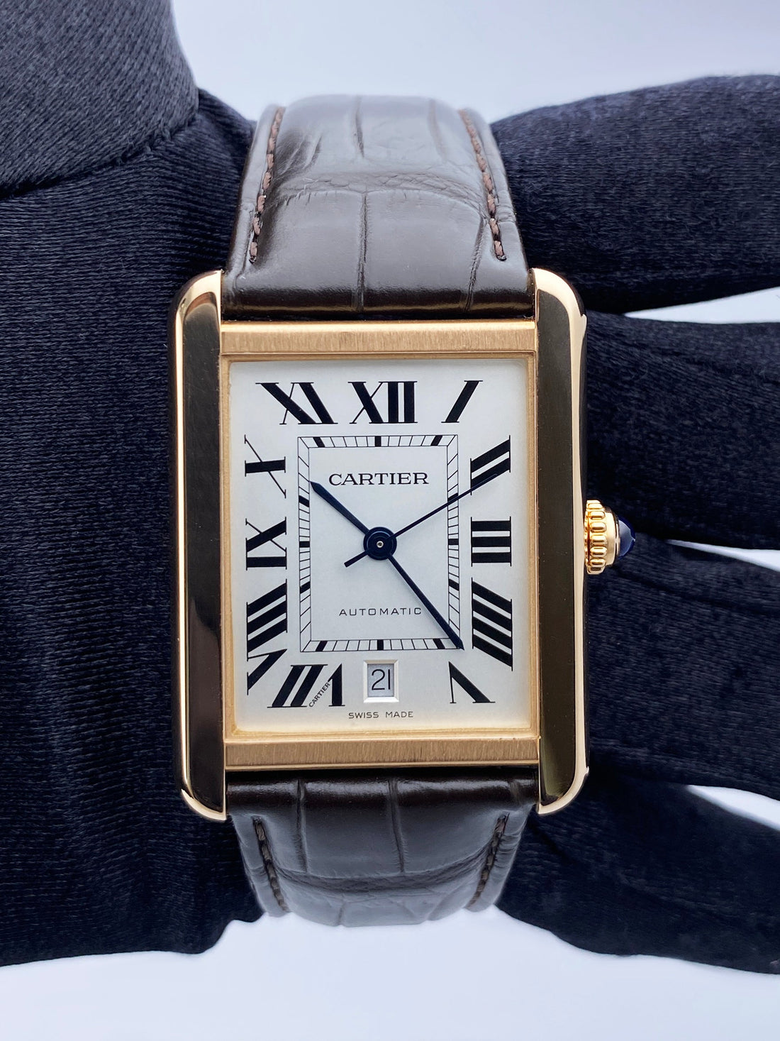 Cartier Tank Solo XL W5200026 Mens Watch. 31mm 18K rose gold case with smoothed 18K rose gold bezel. Silver dial with blue steel hands and Roman numeral hour markers. Minute markers around an inner dial. Date display at the 6 o'clock position. Brown leather strap with 18K rose gold buckle. Will fit up to a 7-inch wrist. Sapphire crystal. Stainless steel case back. Automatic self-winding movement. This watch comes with original Box and Papers. Circa: 2019.