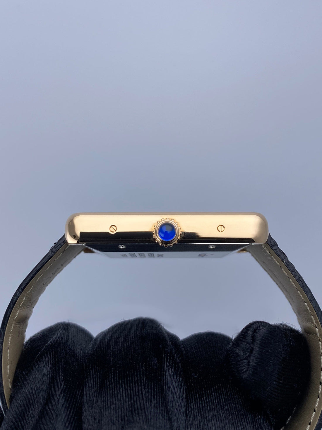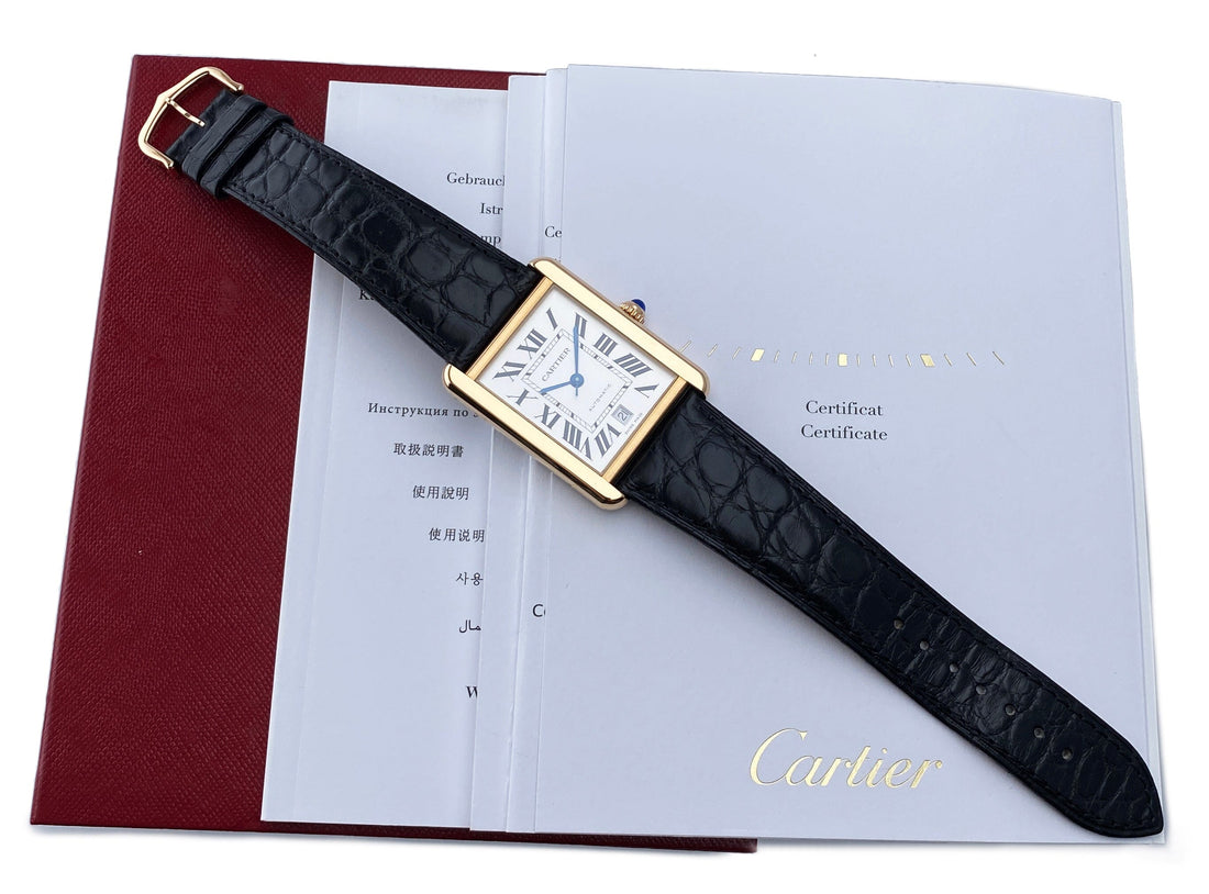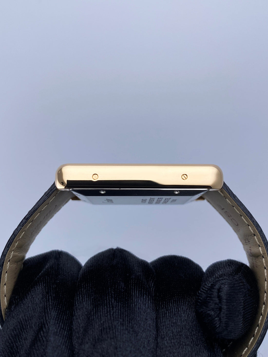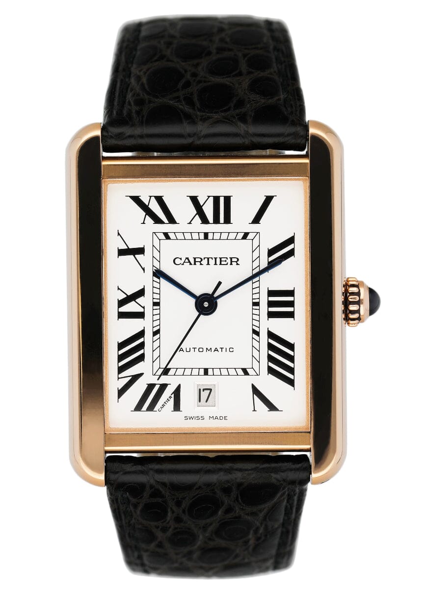 Cartier Tank Solo XL W5200026 / Mens Watch. 31mm 18K rose gold case with smoothed 18K rose gold bezel. Silver dial with blue steel hands and Roman numeral hour markers. Minute markers around an inner dial. The date is displayed at the 6 o'clock position. Black leather strap with 18K rose gold buckle. Will fit up to a 7.5-inch wrist. Sapphire crystal. Stainless steel case back. Automatic self-winding movement. This watch comes with original Box and Papers.