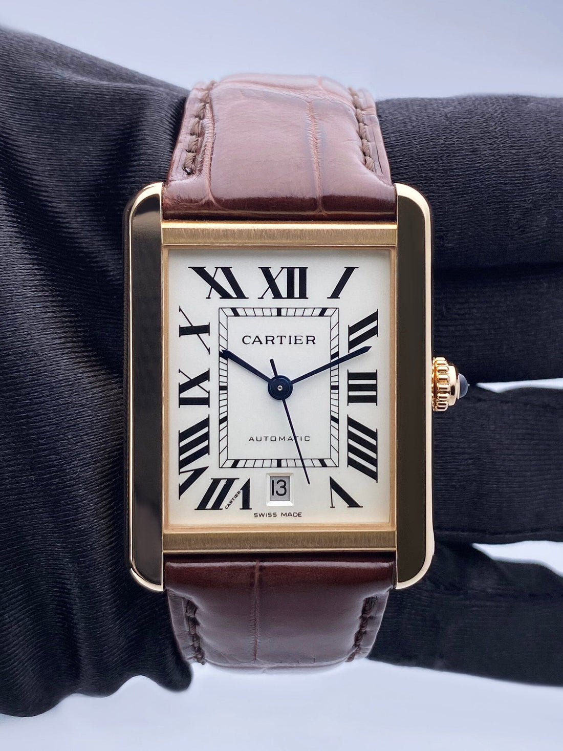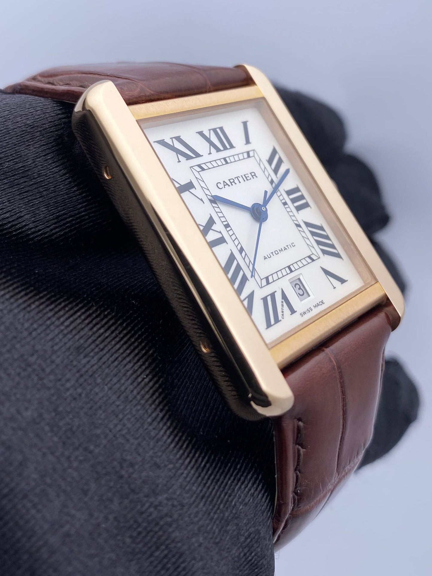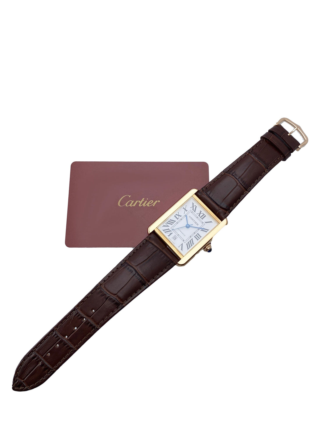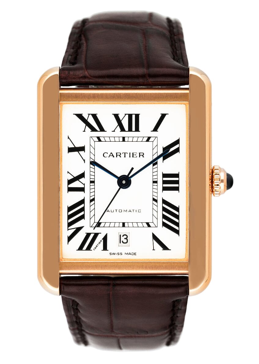 Cartier Tank Solo XL W5200026 / 3799 Mens Watch. 31mm 18K rose gold case with smoothed 18K rose gold bezel. Silver dial with blue steel hands and Roman numeral hour markers. Minute markers around an inner dial. The date is displayed at the 6 o'clock position. Brown leather strap with 18K rose gold buckle. Will fit up to a 7-inch wrist. Sapphire crystal. Stainless steel case back. Automatic self-winding movement. This watch comes with original Box and Papers.