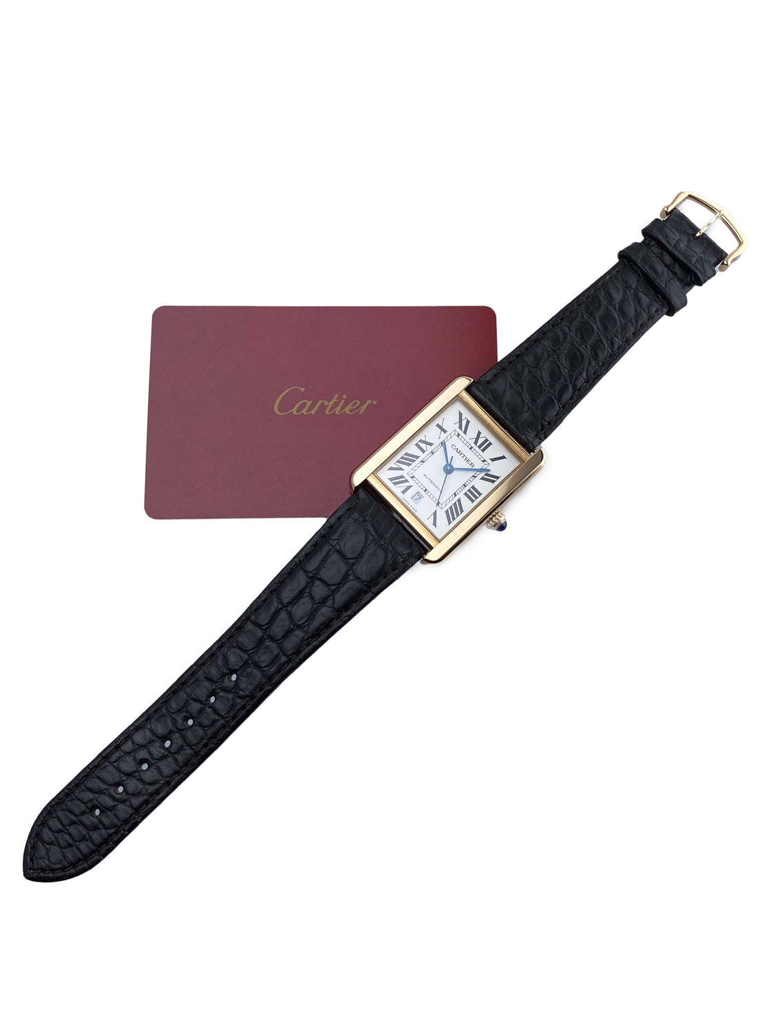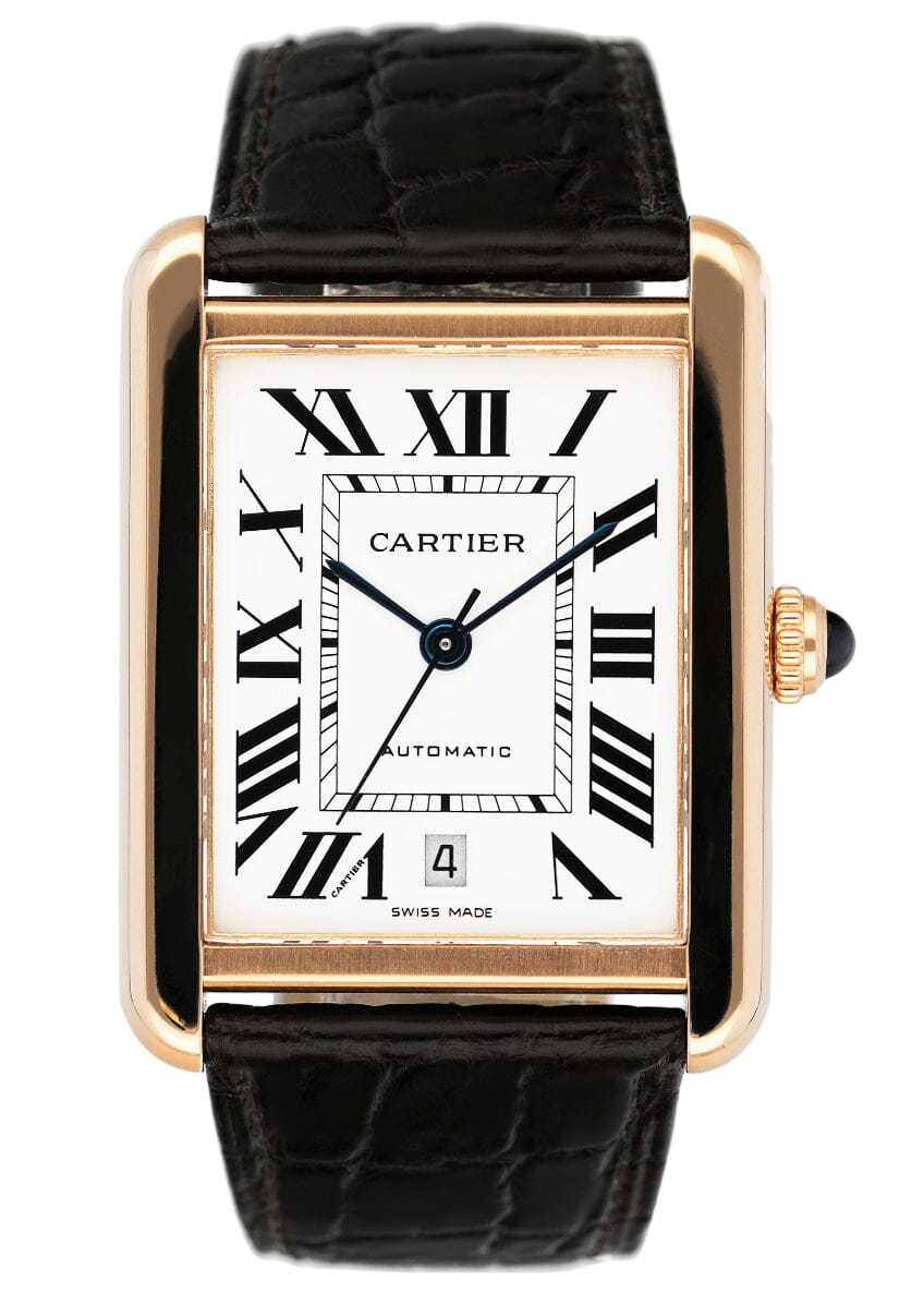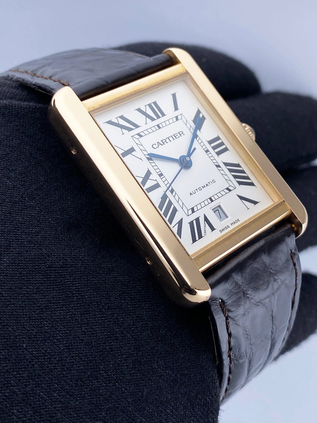 Cartier Tank Solo XL W5200026 / 3799 Mens Watch. 31mm 18K rose gold case with smoothed 18K rose gold bezel. Silver dial with blue steel hands and Roman numeral hour markers. Minute markers around an inner dial. The date is displayed at the 6 o'clock position. Brown leather strap with 18K rose gold buckle. Will fit up to a 7.5-inch wrist. Sapphire crystal. Stainless steel case back. Automatic self-winding movement. This watch comes with original Box and Papers.