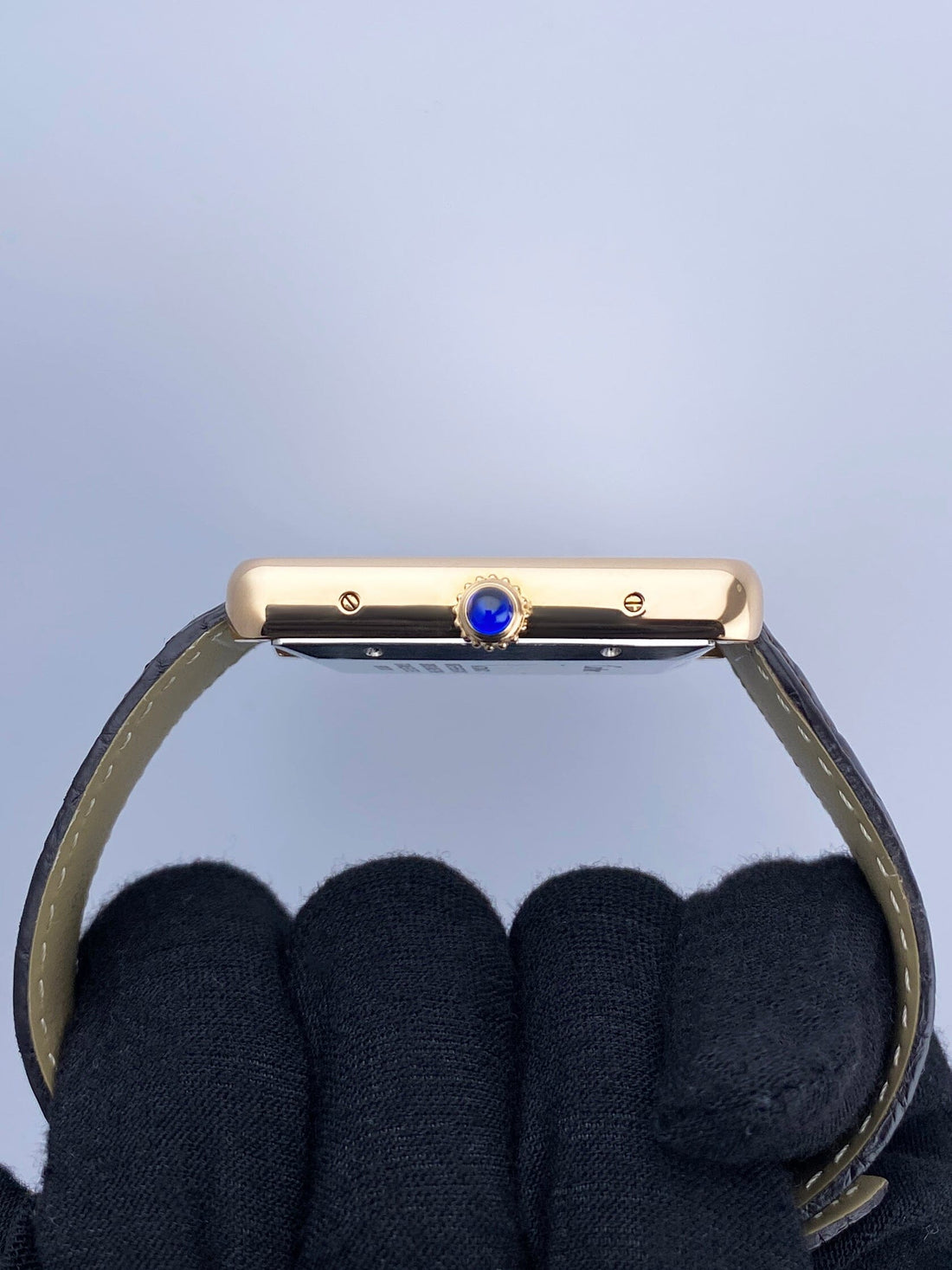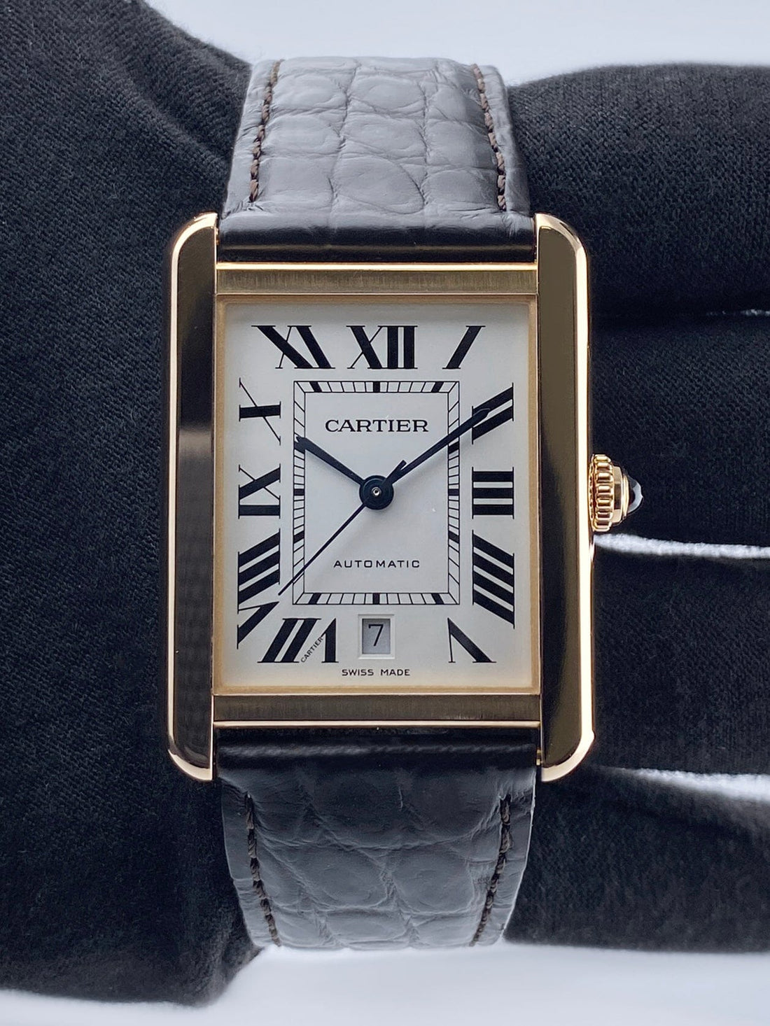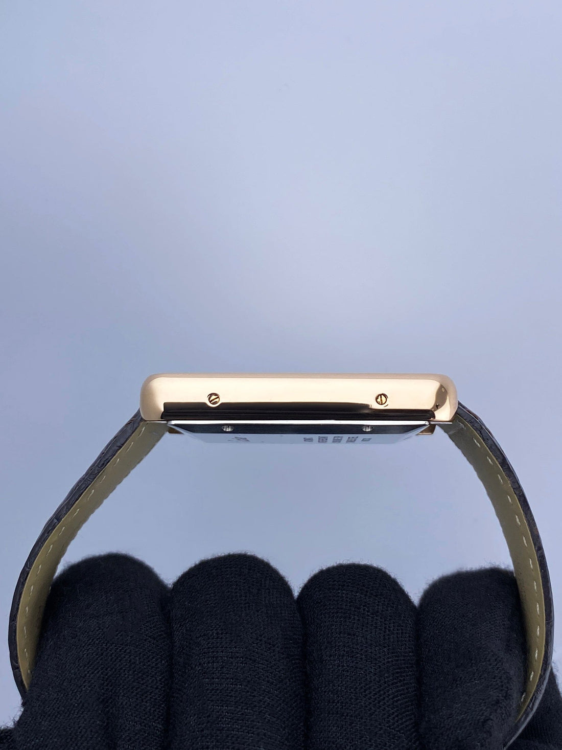Cartier Tank Solo XL W5200026 / 3799 Mens Watch. 31mm 18K rose gold case with smoothed 18K rose gold bezel. Silver dial with blue steel hands and Roman numeral hour markers. Minute markers around an inner dial. The date is displayed at the 6 o'clock position. Brown leather strap with 18K rose gold buckle. Will fit up to a 7.5-inch wrist. Sapphire crystal. Stainless steel case back. Automatic self-winding movement. This watch comes with original Box and Papers.