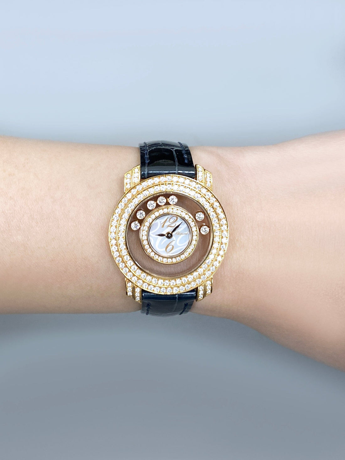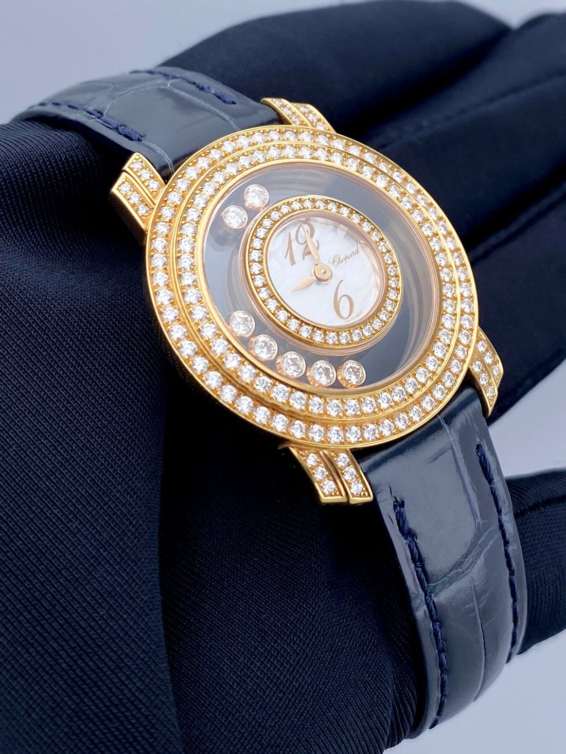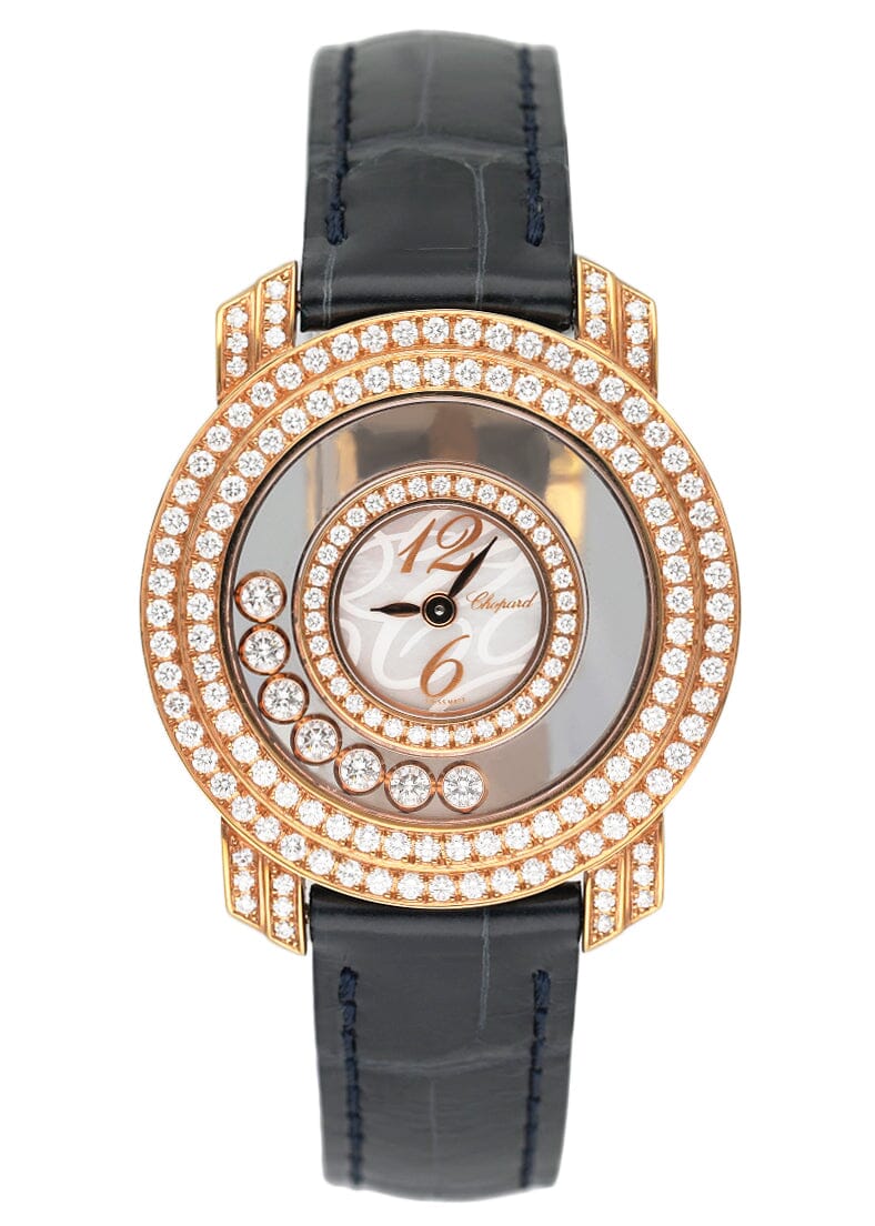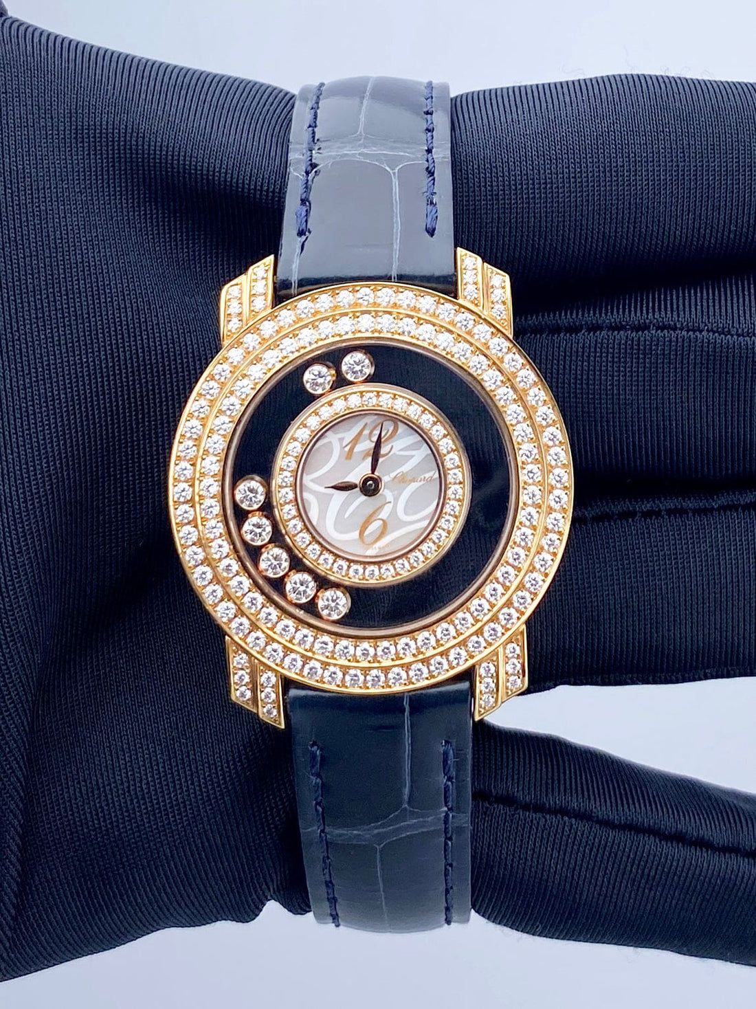 Chopard Happy Diamonds 209245-5001 Ladies Watch. 30mm 18K rose gold case with factory diamond. 18K rose gold bezel with factory diamond. Mother of Pearl at center of dial. Pink hands. 7 floating factory diamonds. Black leather strap with 18K rose gold with factory diamond buckle. Will fit up to a 7-inch wrist. Sapphire crystal. Transparent sapphire cyrstal case back. Quartz: battery powered movement.