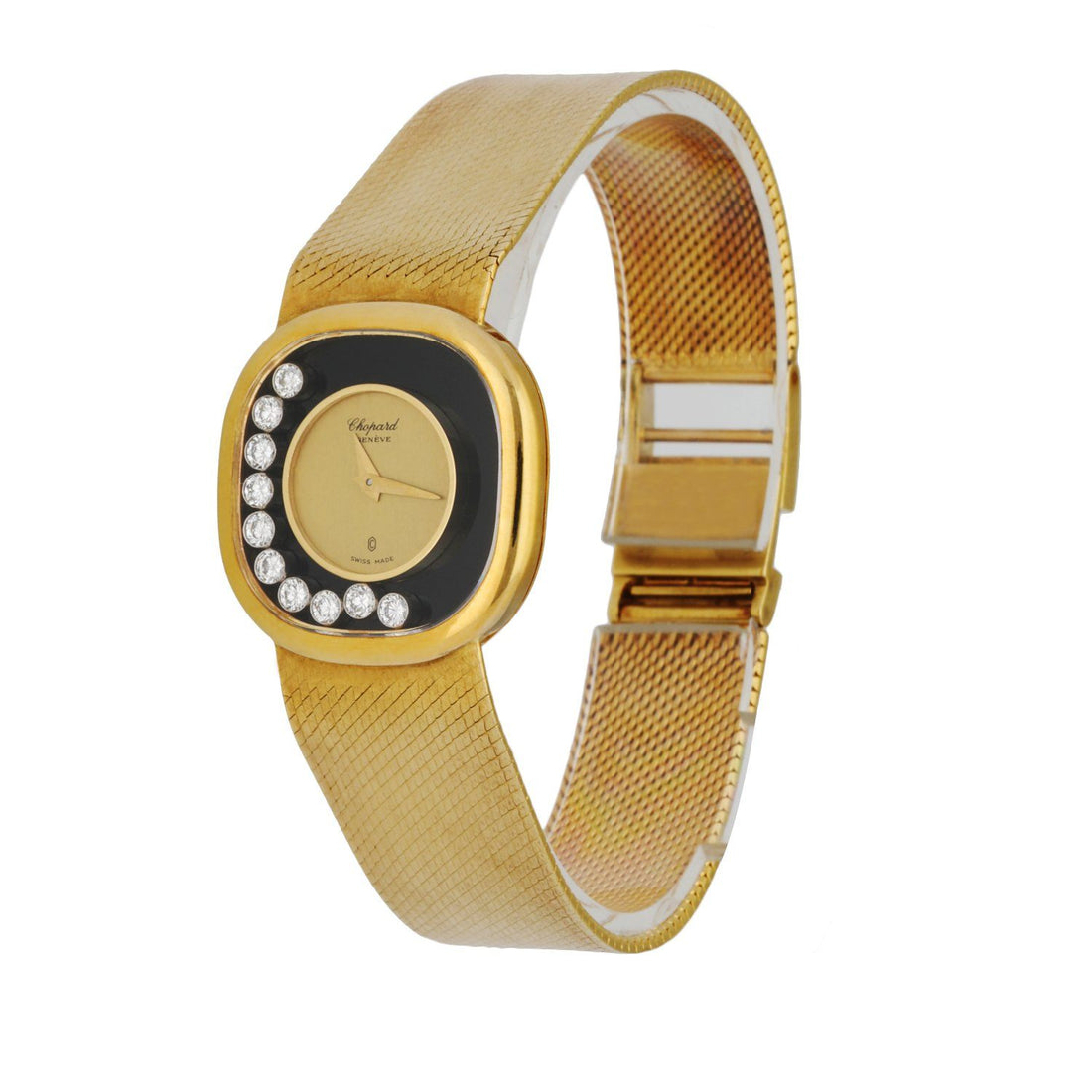 Chopard Happy Diamond 5157 Ladies Watch. 25mm 18K yellow gold case. Black dial with 10 floating original factory diamonds and inner champagne dial with gold hands. 18K yellow gold bracelet with jewelry clasp. Will fit up to 6.5-Inch wrist. Sapphire crystal. 18K yellow gold case back. Quartz battery powered movement.