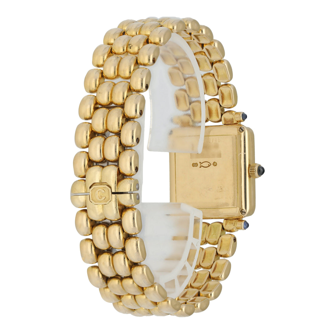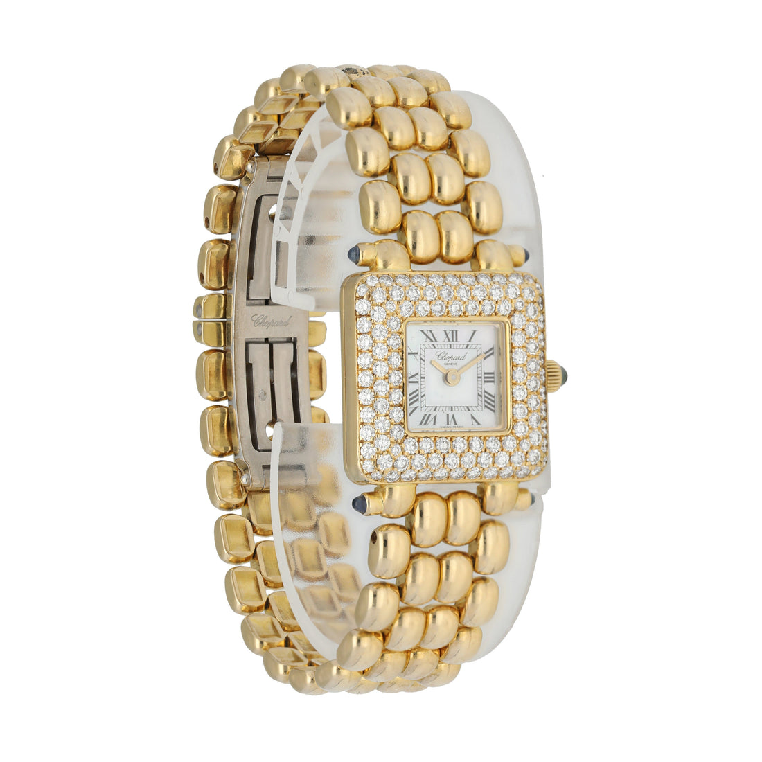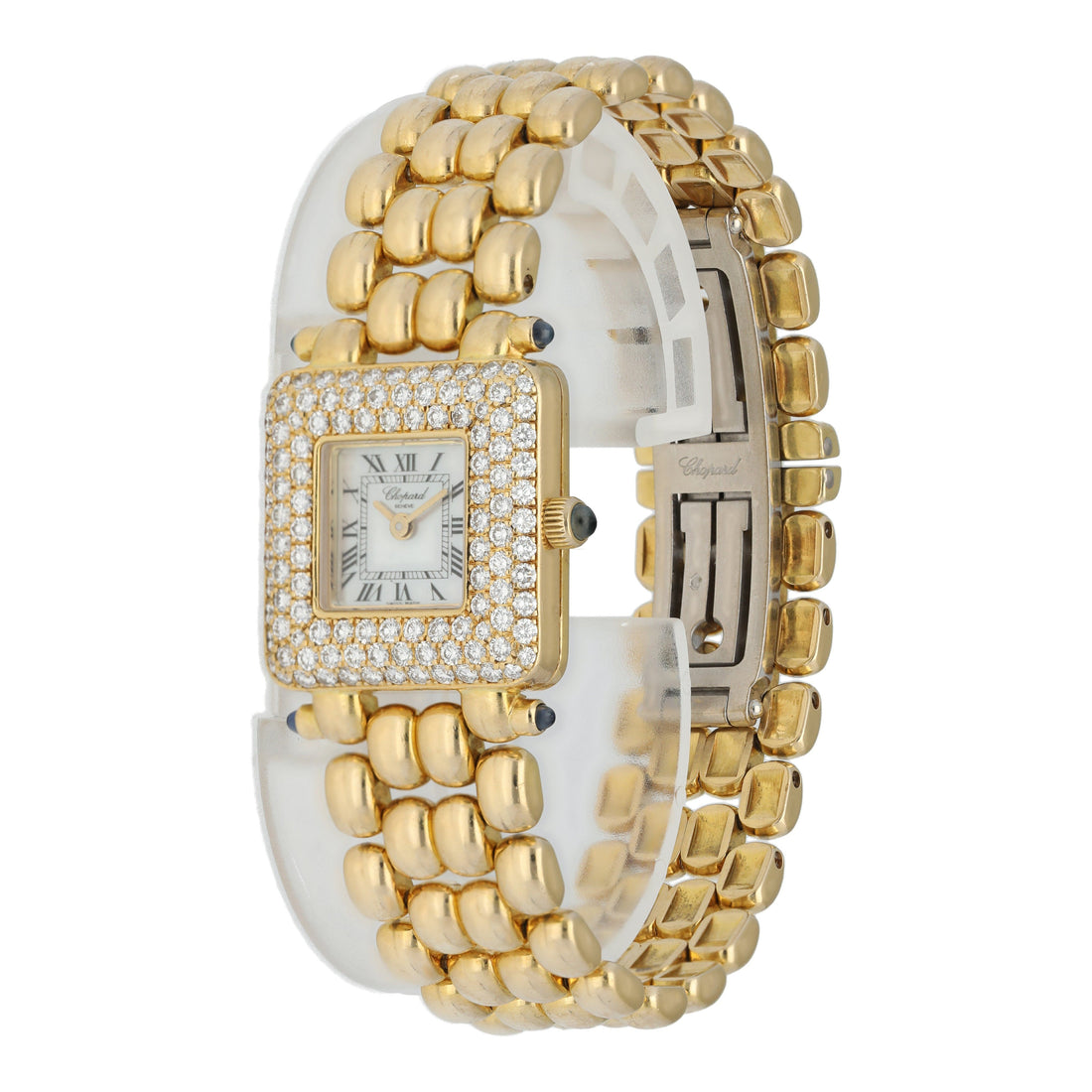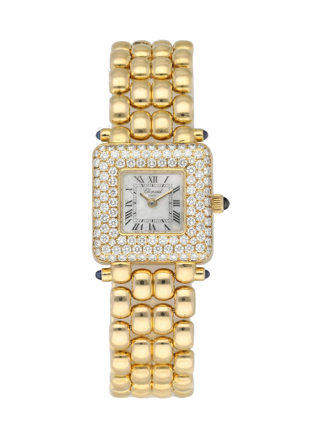 Chopard Happy Sport 10/6115-23 18k Yellow Gold Ladies Watch. 22mm 18k Yellow gold case. Yellow Gold Stationary diamond bezel. Mother-of-Pearl dial with gold hands and roman numeral hour markers. Minute markers on the inner dial. Yellow Gold Bracelet with Hidden Butterfly Clasp. Will fit up to a 6.5-inch wrist. Sapphire Crystal, yellow gold case back. Quartz: Battery powered movement. This watch is backed by our two year warranty.