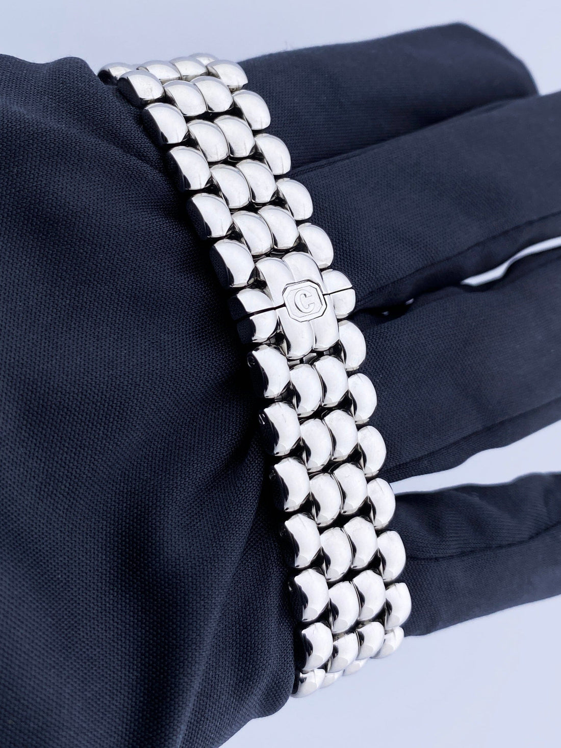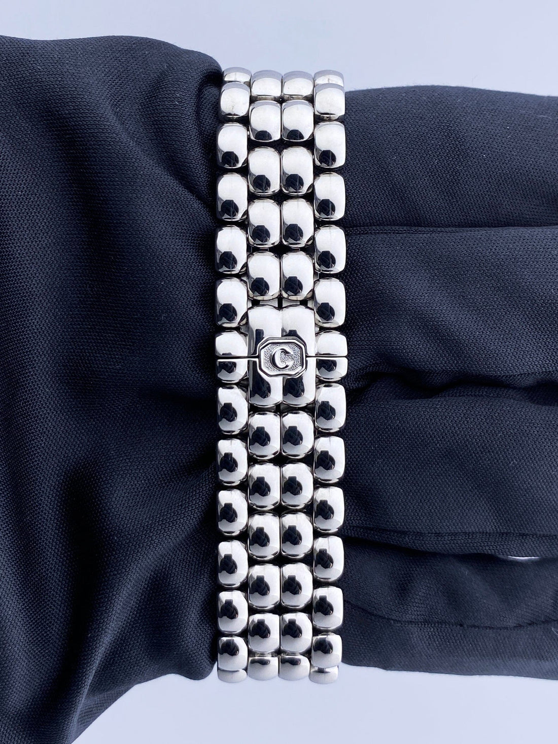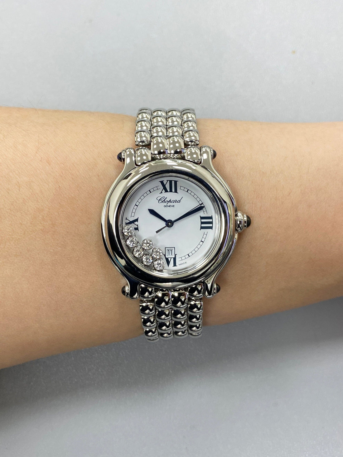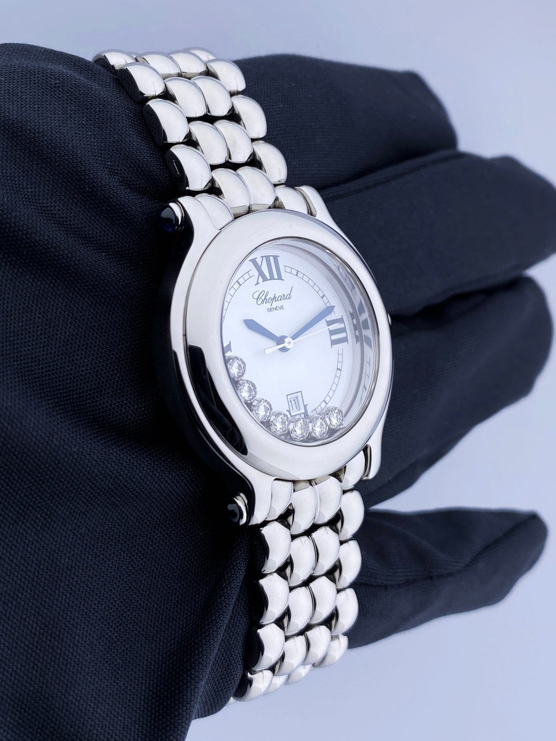 Chopard Happy Sport 27/8236-23 Floating Diamonds Ladies Watch. 32mm Stainless steel case. Stainless steel fixed bezel. White dial with Blue steel hands and Roman numeral hour markers. 7 of floating diamond. Minute markers on the inner dial. Date display at the 6 o'clock position. Stainless steel bracelet with hidden butterfly clasp. Will fit up to a 6-inch wrist. Sapphire crystal. Stainless steel case back. Quartz movement.