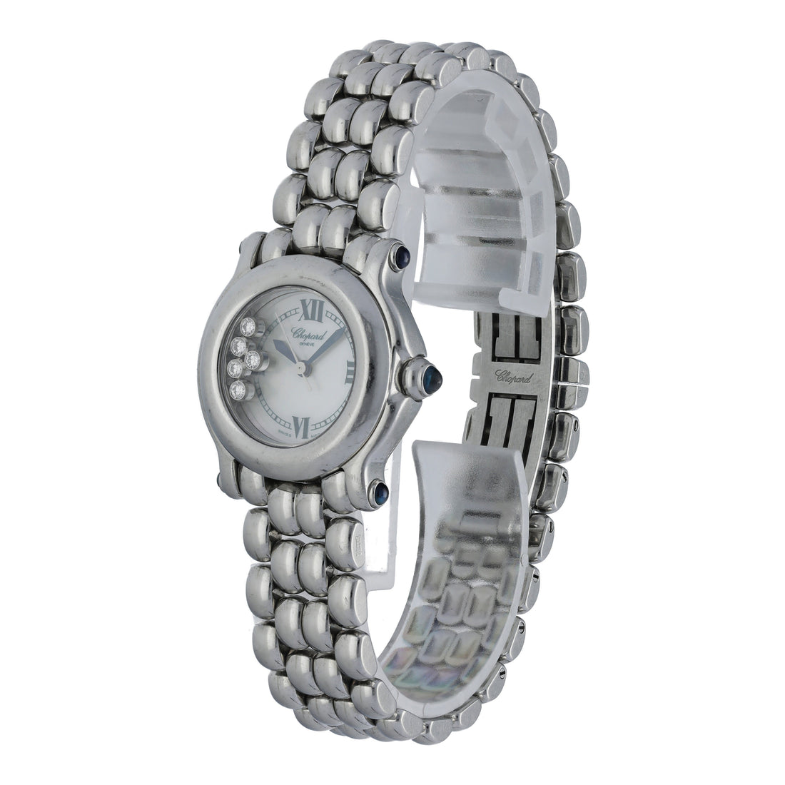 Chopard Happy Sport 27/8250-23 Ladies Watch. 26mm Stainless Steel case. White dial with blue steel hands, roman numeral hour markers, and 5 floating diamonds. Minute markers on the outer dial. Stainless Steel Bracelet with Hidden Deployment Clasp. Will fit up to a 6.25 inch wrist. Sapphire Crystal, Stainless steel case back. Quartz battery self movement. This watch is backed by our two year warranty.