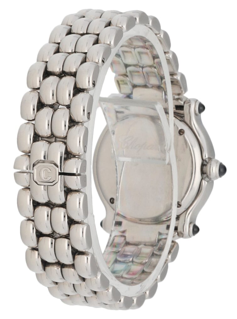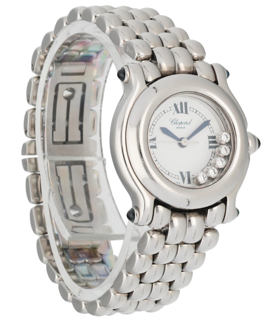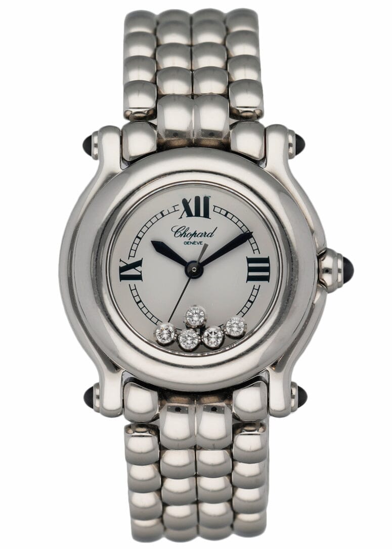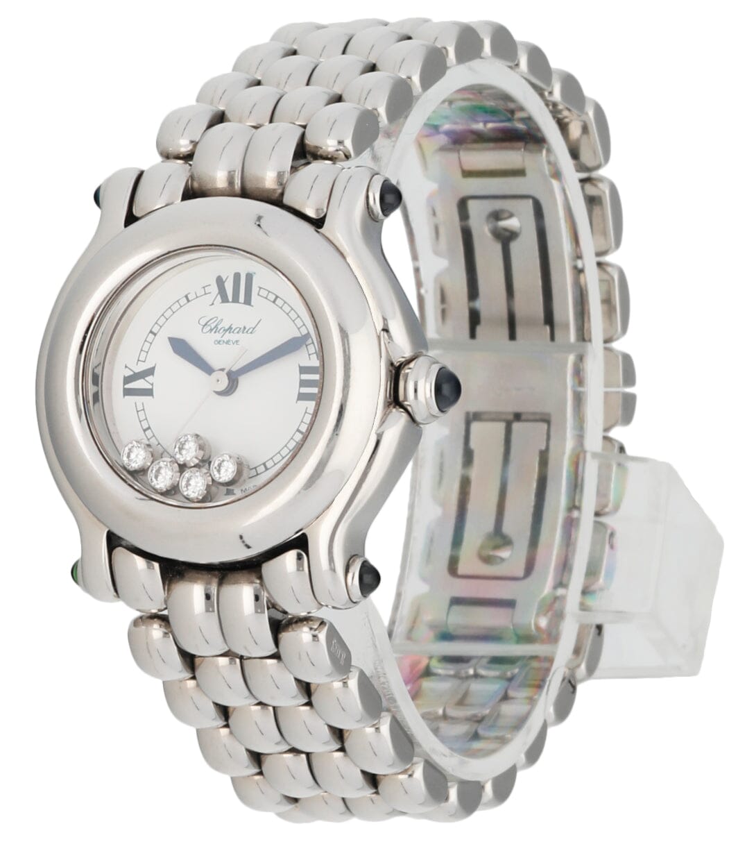 White dial with blue steel hands, roman numeral hour markers, and 5 floating diamonds. Minute markers on the outer dial. Stainless steel bracelet with hidden butterfly Clasp. Will fit up to a 6-inch wrist. Sapphire Crystal, Stainless steel case back. Quartz battery self movement. This watch is backed by our two year warranty.