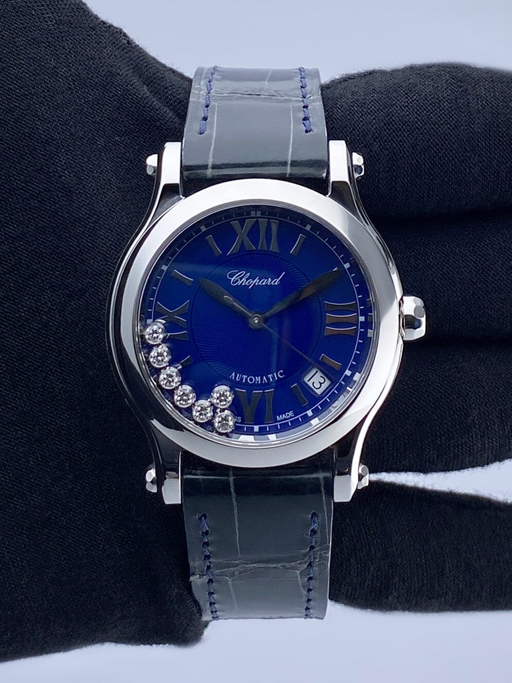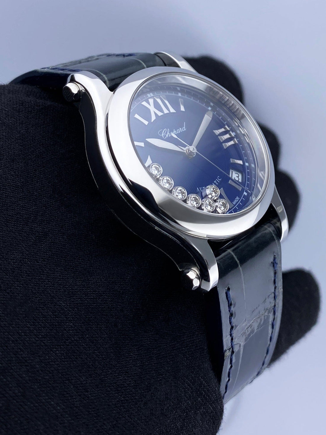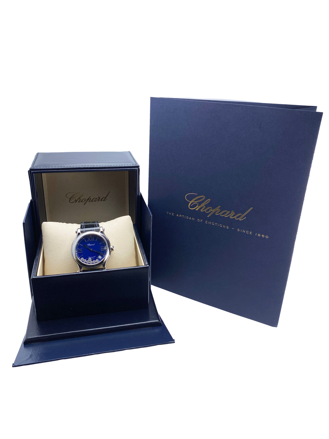 Chopard Happy Sport 278559-3008 Ladies Watch. 36mm stainless steel case. Stainless steel smooth bezel. Blue dial with steel hands and Roman numeral & index hour markers. The original factory diamonds set of 7 floating round shape. Minute markers on the outer dial. Date display between 4 and 5 o'clock. Blue leather strap with stainless steel buckle. Will fit up to a 7.5-inch wrist. Sapphire crystal. Transparent sapphire crystal case back. Automatic self-winding movement. This watch comes with original Box and Papers.