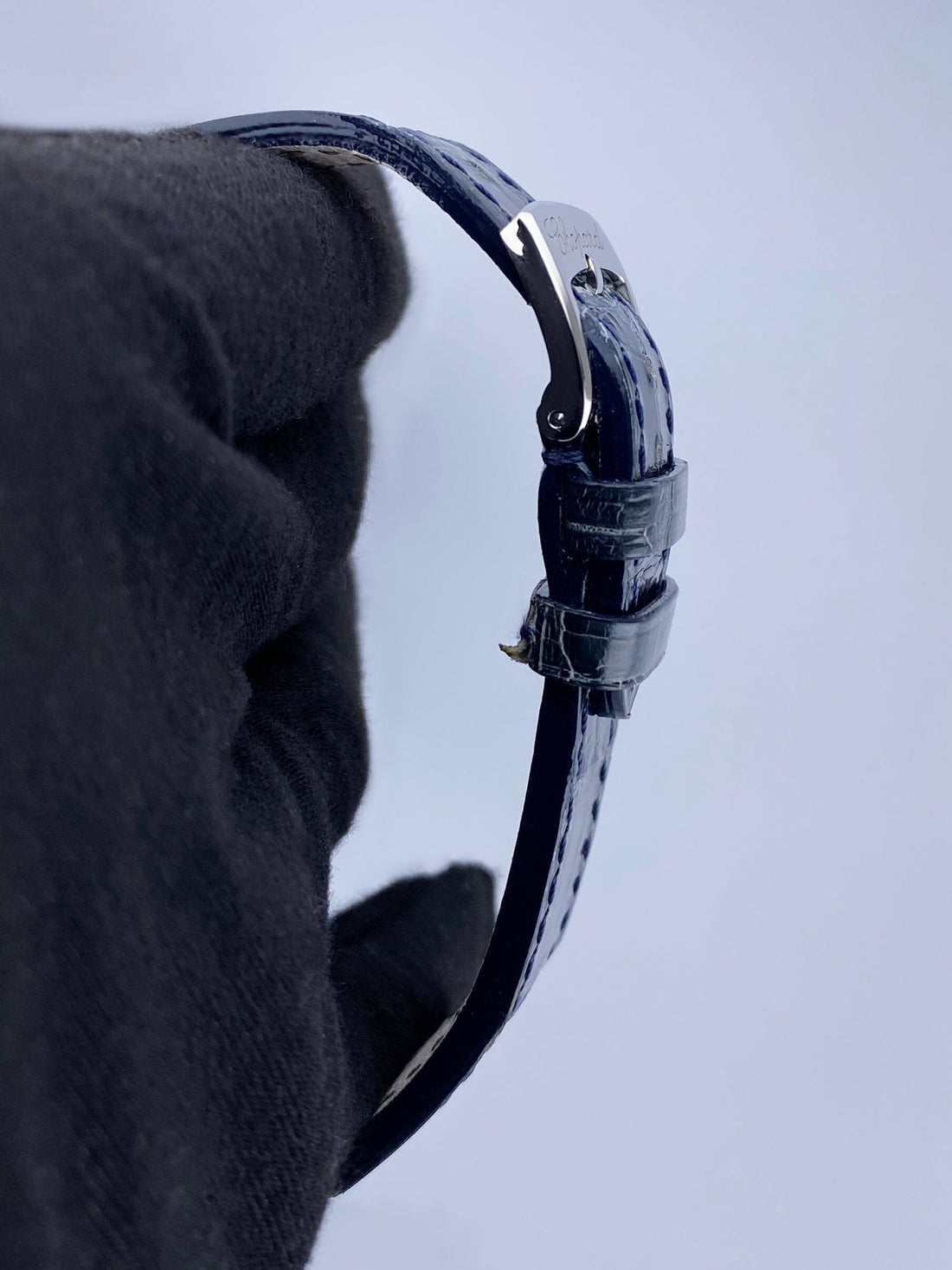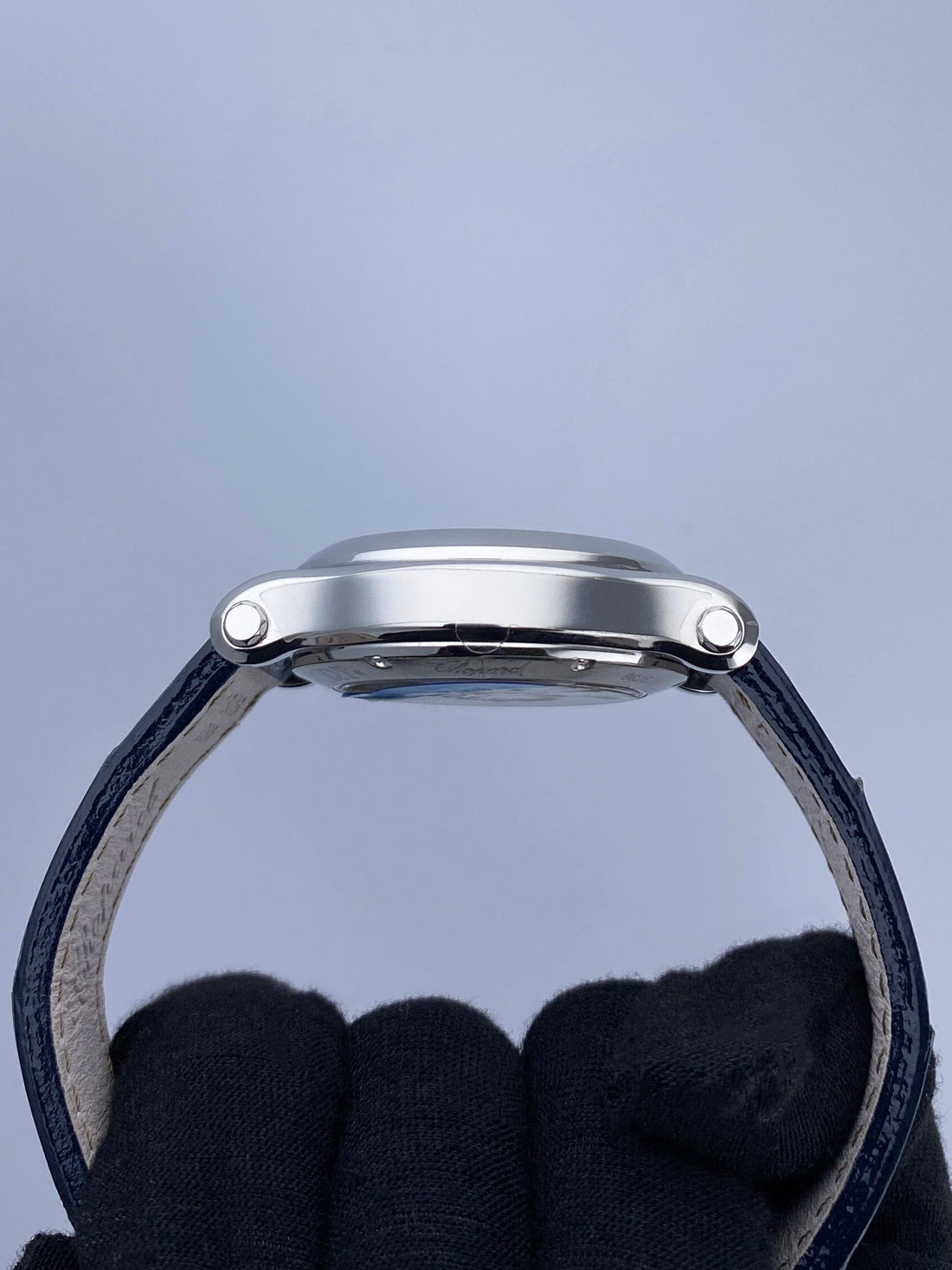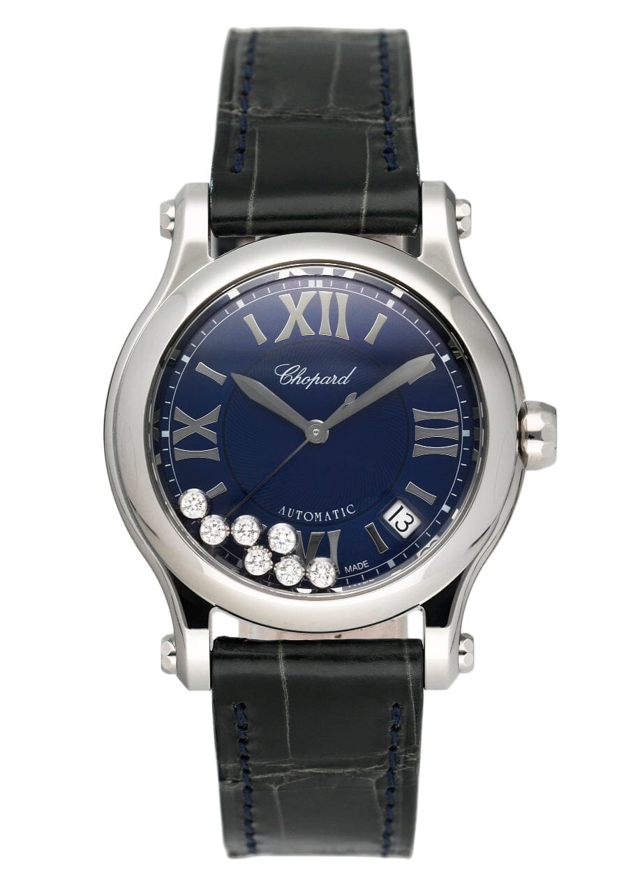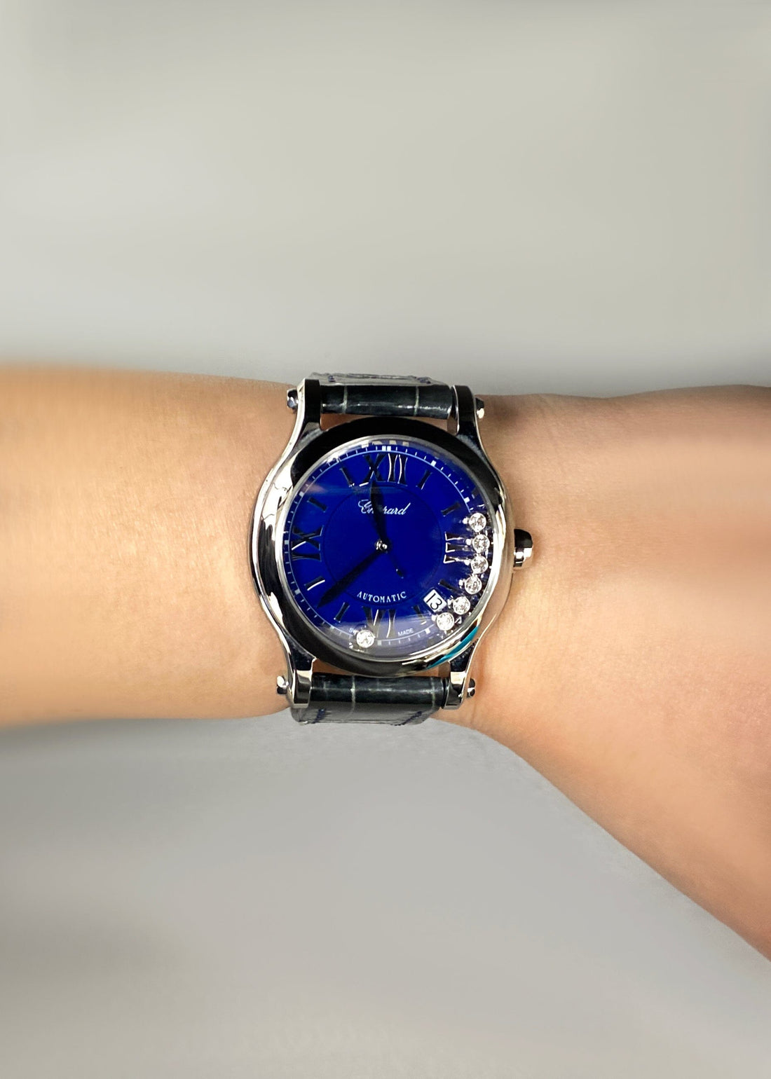 Chopard Happy Sport 278559-3008 Ladies Watch. 36mm stainless steel case. Stainless steel smooth bezel. Blue dial with steel hands and Roman numeral & index hour markers. The original factory diamonds set of 7 floating round shape. Minute markers on the outer dial. Date display between 4 and 5 o'clock. Blue leather strap with stainless steel buckle. Will fit up to a 7.5-inch wrist. Sapphire crystal. Transparent sapphire crystal case back. Automatic self-winding movement. This watch comes with original Box and Papers.