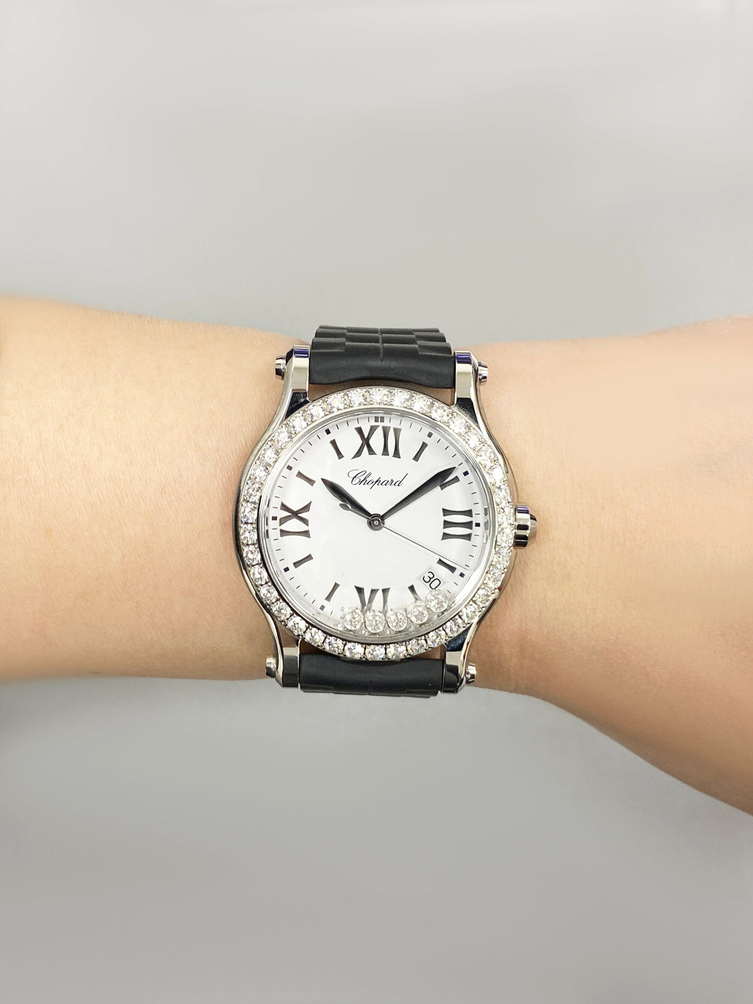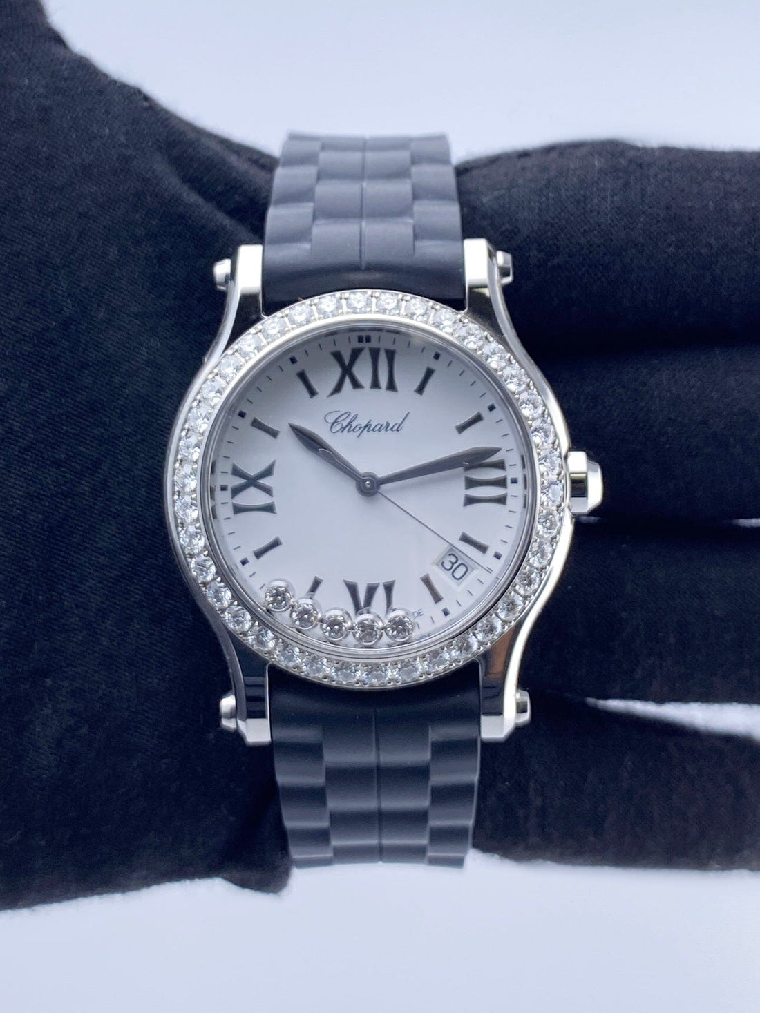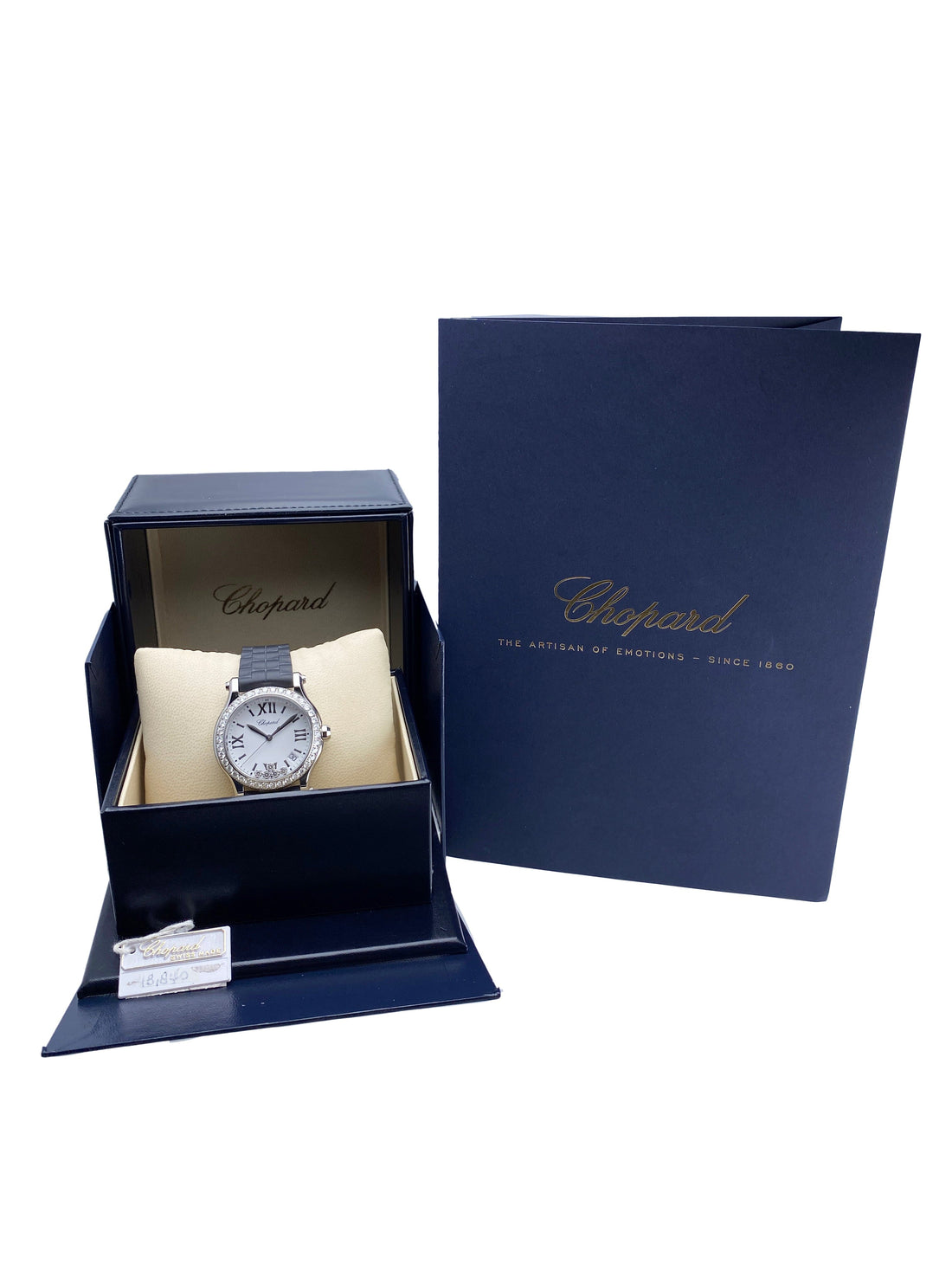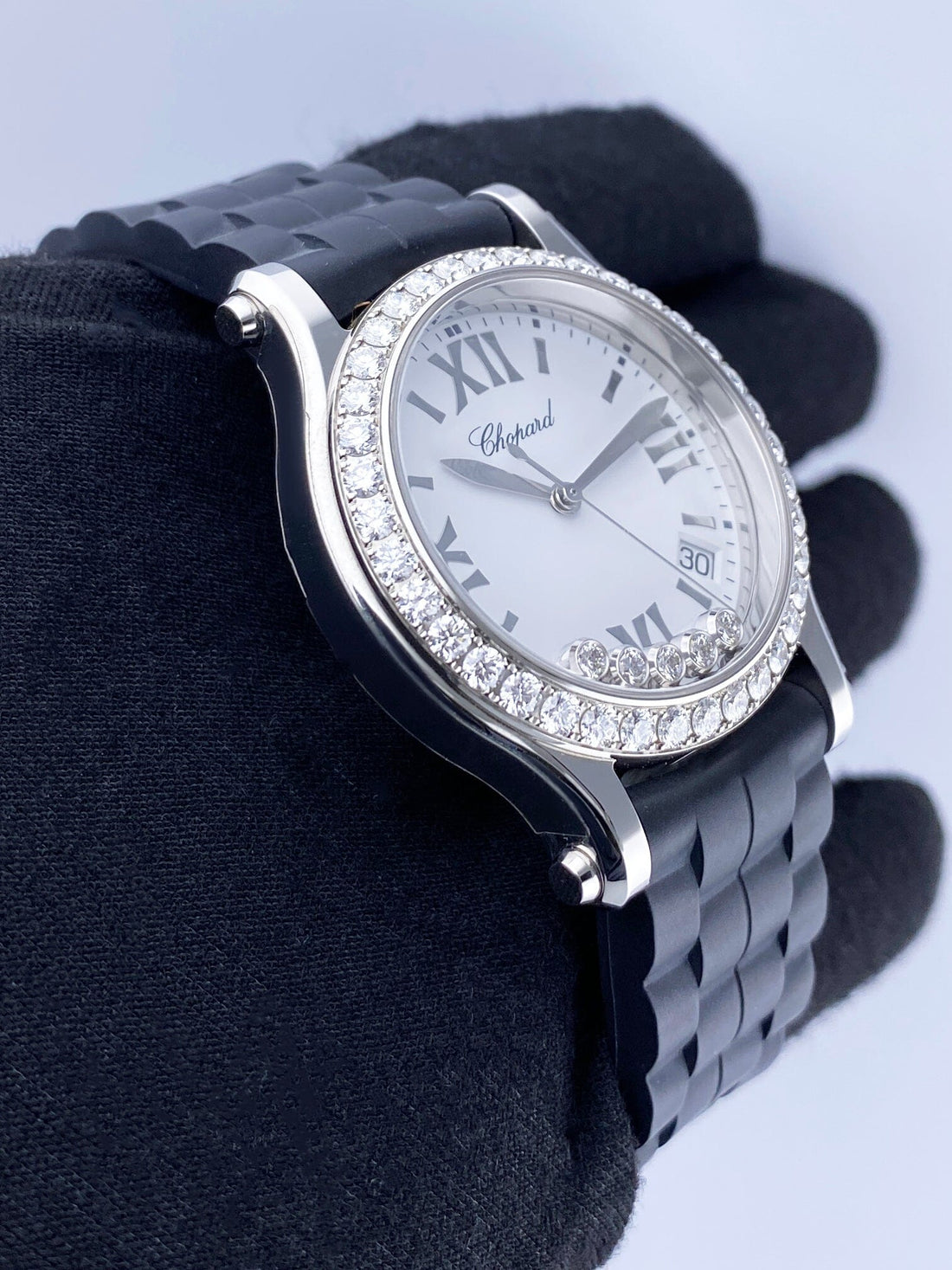 Chopard Happy Sport 278582-3003 Ladies Watch. 36mm stainless steel case. Stainless steel bezel with factory diamond. White dial with steel hands and Roman numeral & index hour markers. The original factory diamonds set of 5 floating round shape. Minute markers on the outer dial. Date display between 4 and 5 o'clock. Black rubber strap with stainless steel buckle. Will fit up to a 7-inch wrist. Sapphire crystal. Stainless steel case back. Quartz battery powered movement. This watch comes with original Box and Papers.