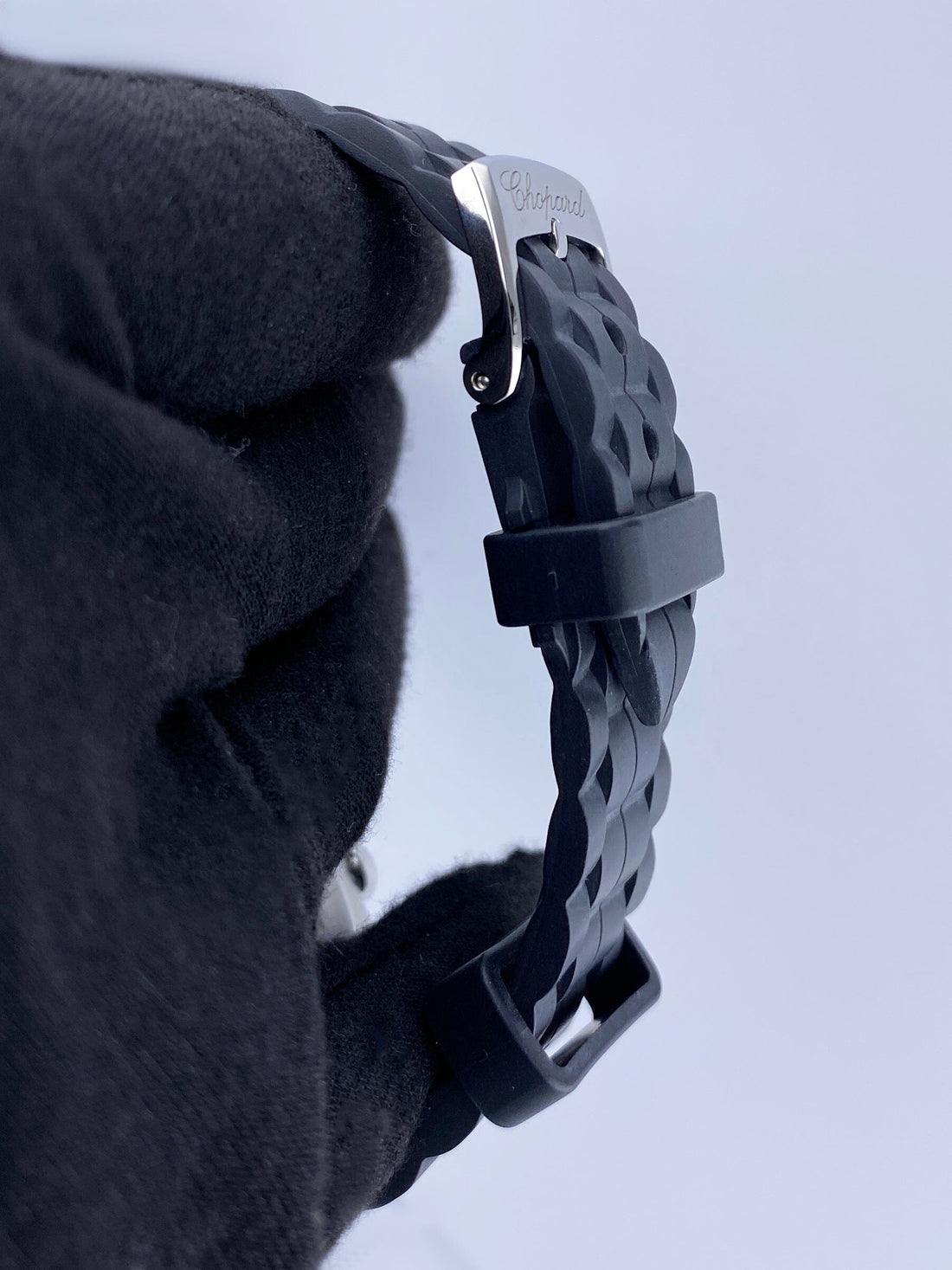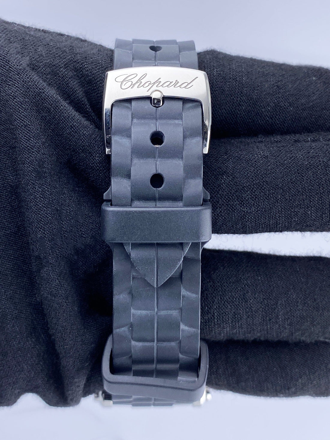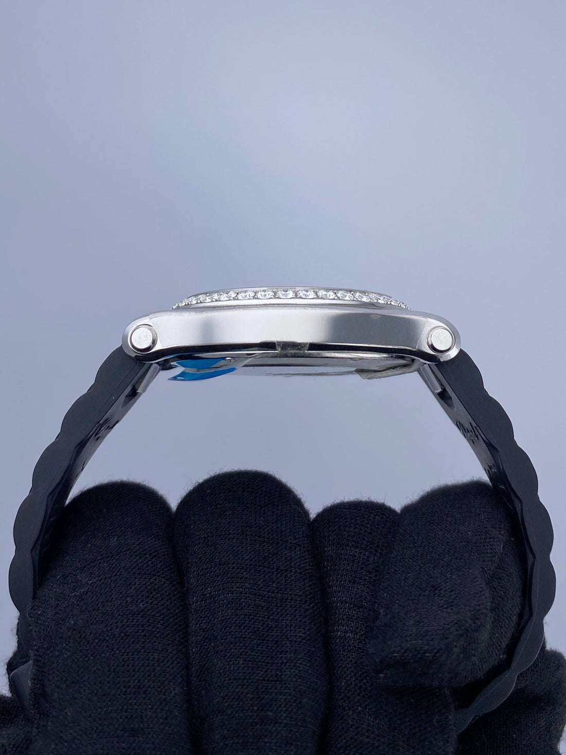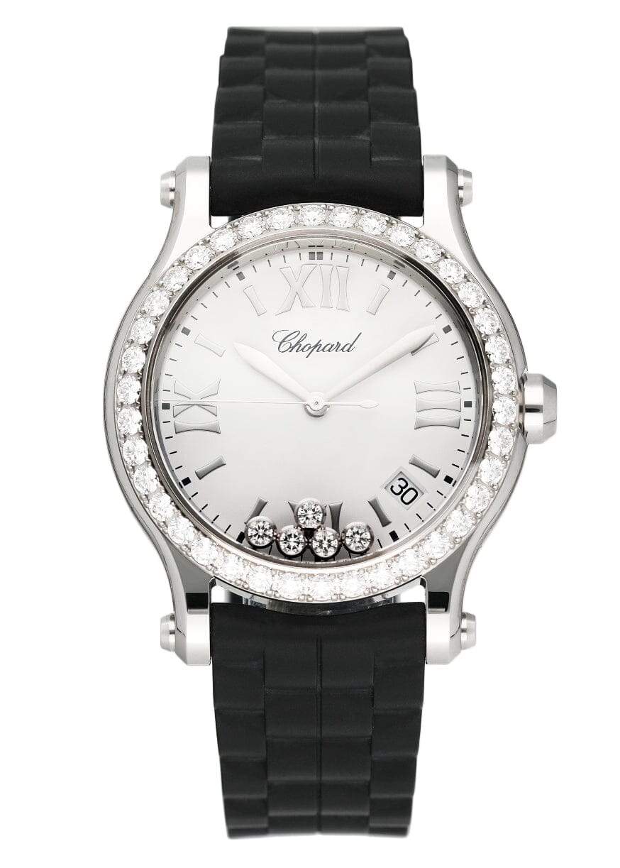 Chopard Happy Sport 278582-3003 Ladies Watch. 36mm stainless steel case. Stainless steel bezel with factory diamond. White dial with steel hands and Roman numeral & index hour markers. The original factory diamonds set of 5 floating round shape. Minute markers on the outer dial. Date display between 4 and 5 o'clock. Black rubber strap with stainless steel buckle. Will fit up to a 7-inch wrist. Sapphire crystal. Stainless steel case back. Quartz battery powered movement. This watch comes with original Box and Papers.