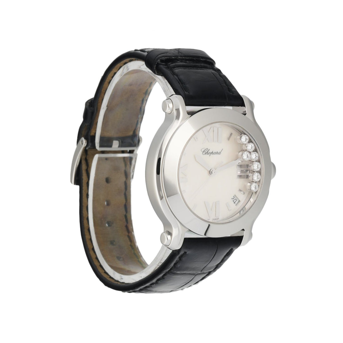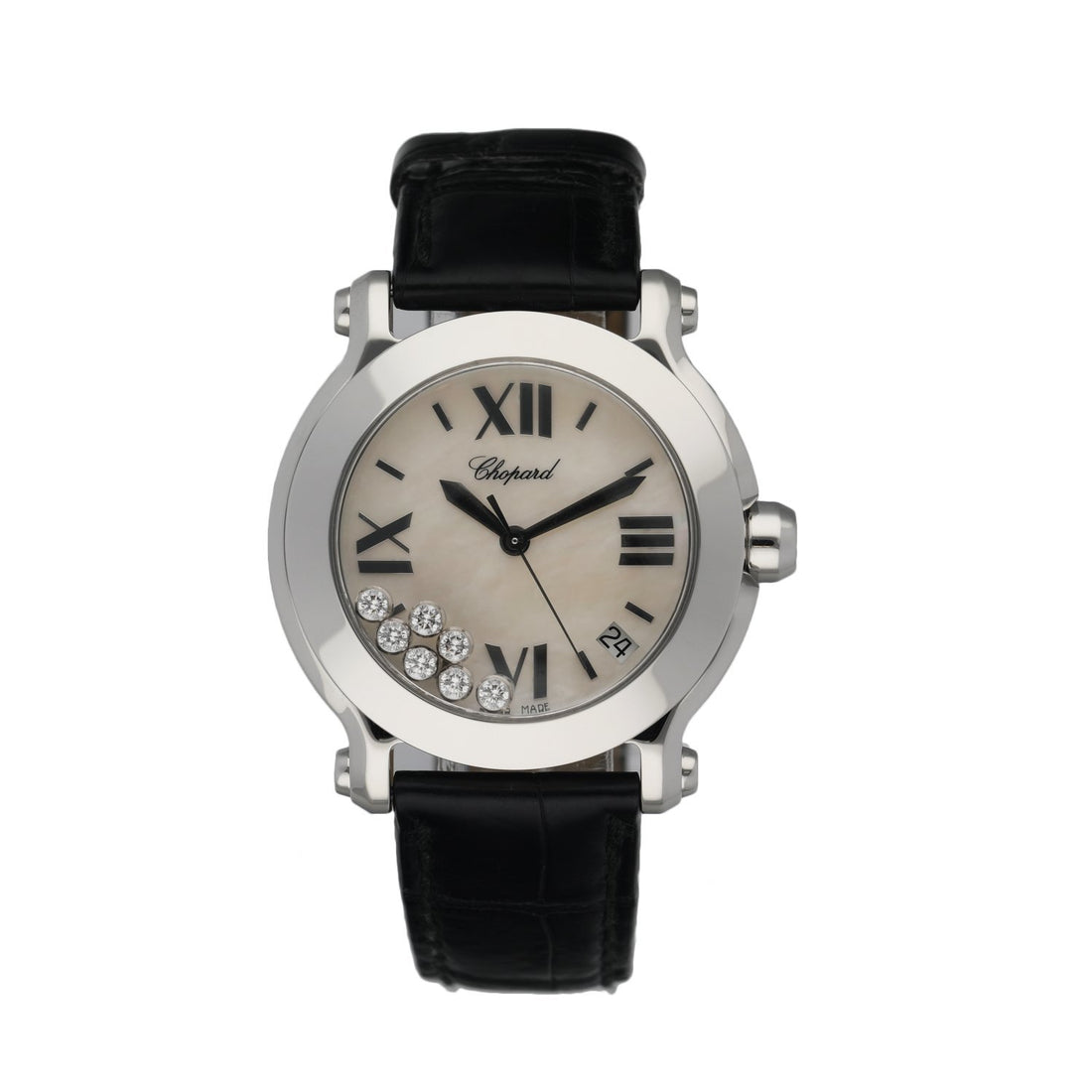 Chopard Happy Sport 8475 ladies watch. 35mm stainless steel case with stainless steel smooth bezel. Mother of pearl dial with steel hands and Roman numeral hour marker; and 7 floating happy diamonds. Date display between 4 & 5 o'clock position. Black leather strap with stainless steel buckle. Will fit up to 7-inch wrist. Quartz battery powered movement. This watch comes with original papers and receipt.