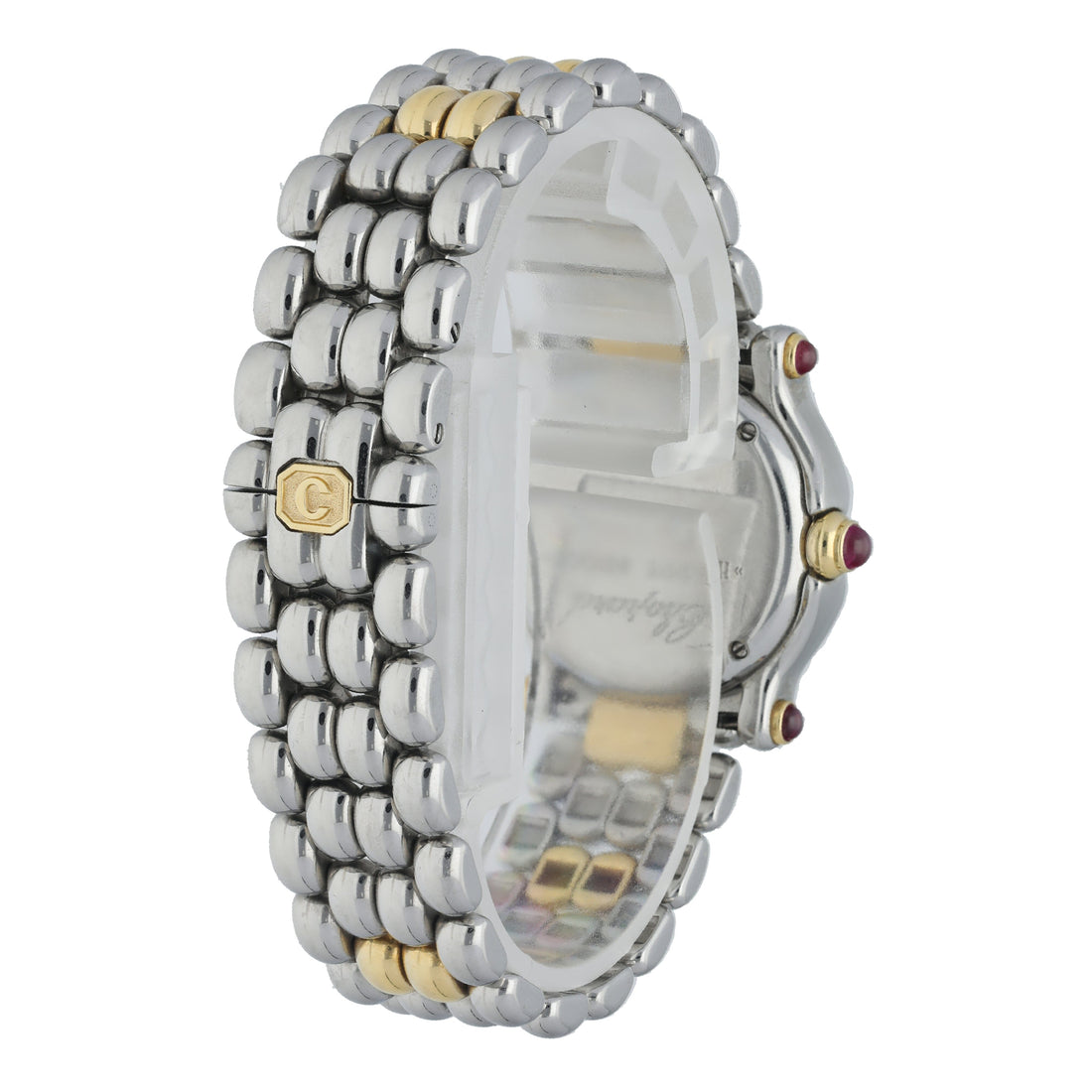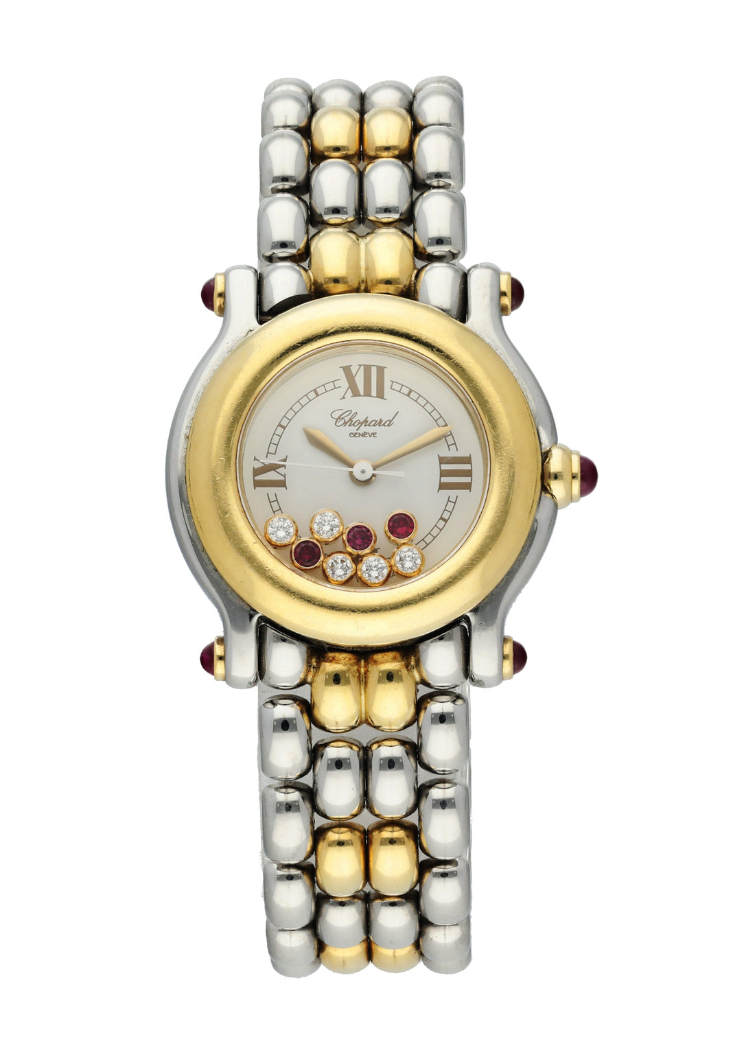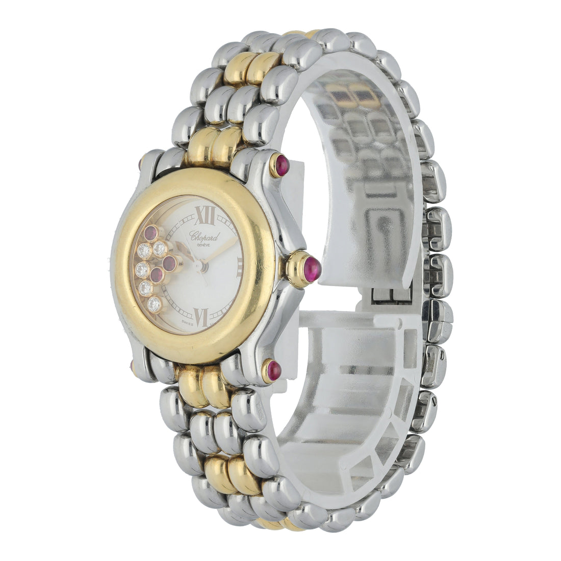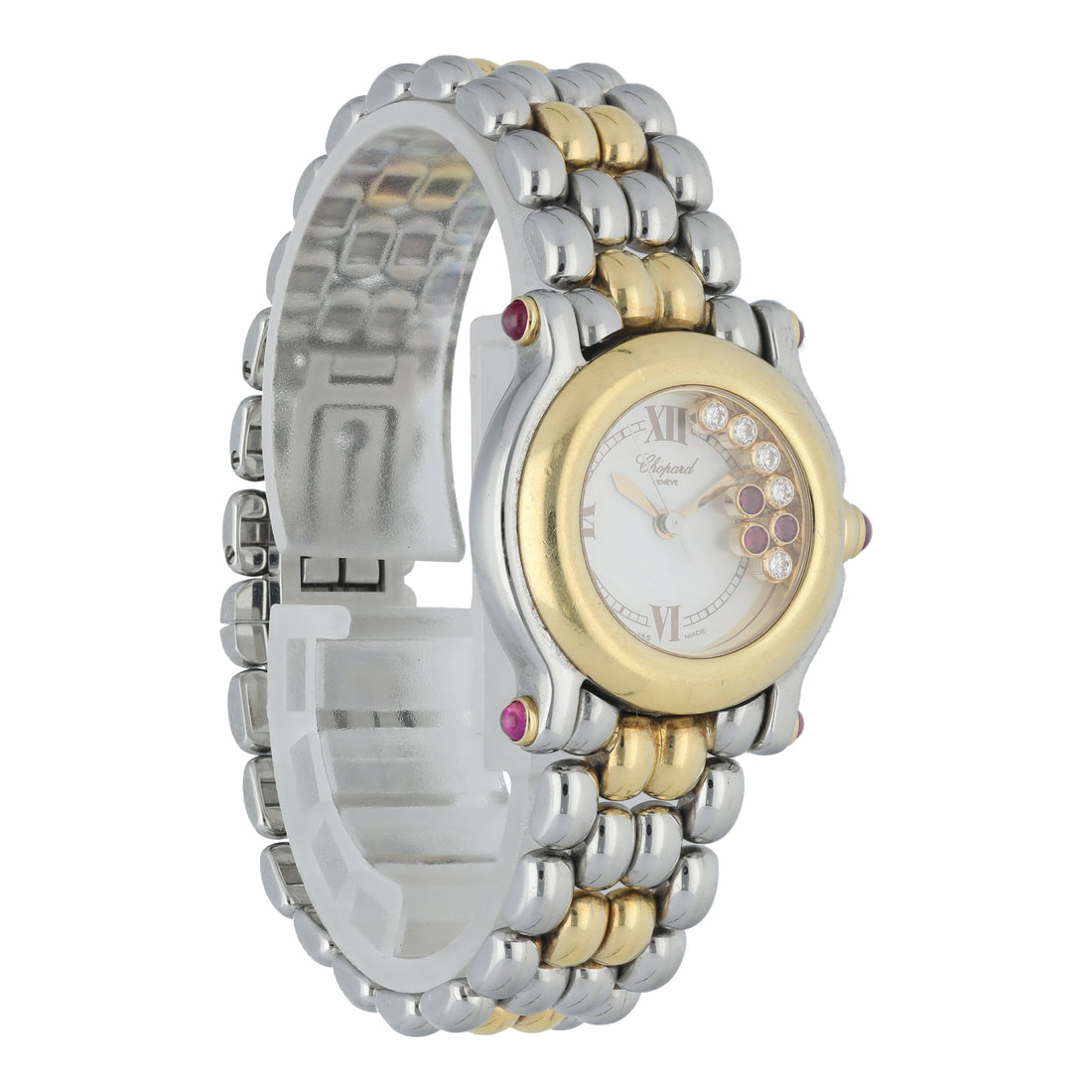 Chopard happy sport happy diamond 8246 Ladies Watch. 26mm stainless steel case with yellow Gold bezel. White dial with gold hands and gold-tone Roman numeral hour markers. Floating pink and white diamonds in yellow gold settings. Stainless steel and yellow gold bracelet with butterfly clasp. Will fit up to a 6-inch wrist. Quartz battery powered movement. This watch is backed by our two year warranty.