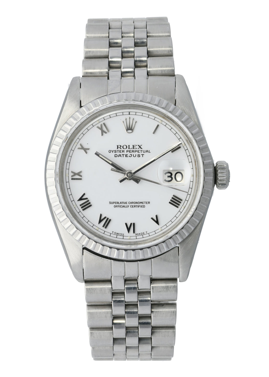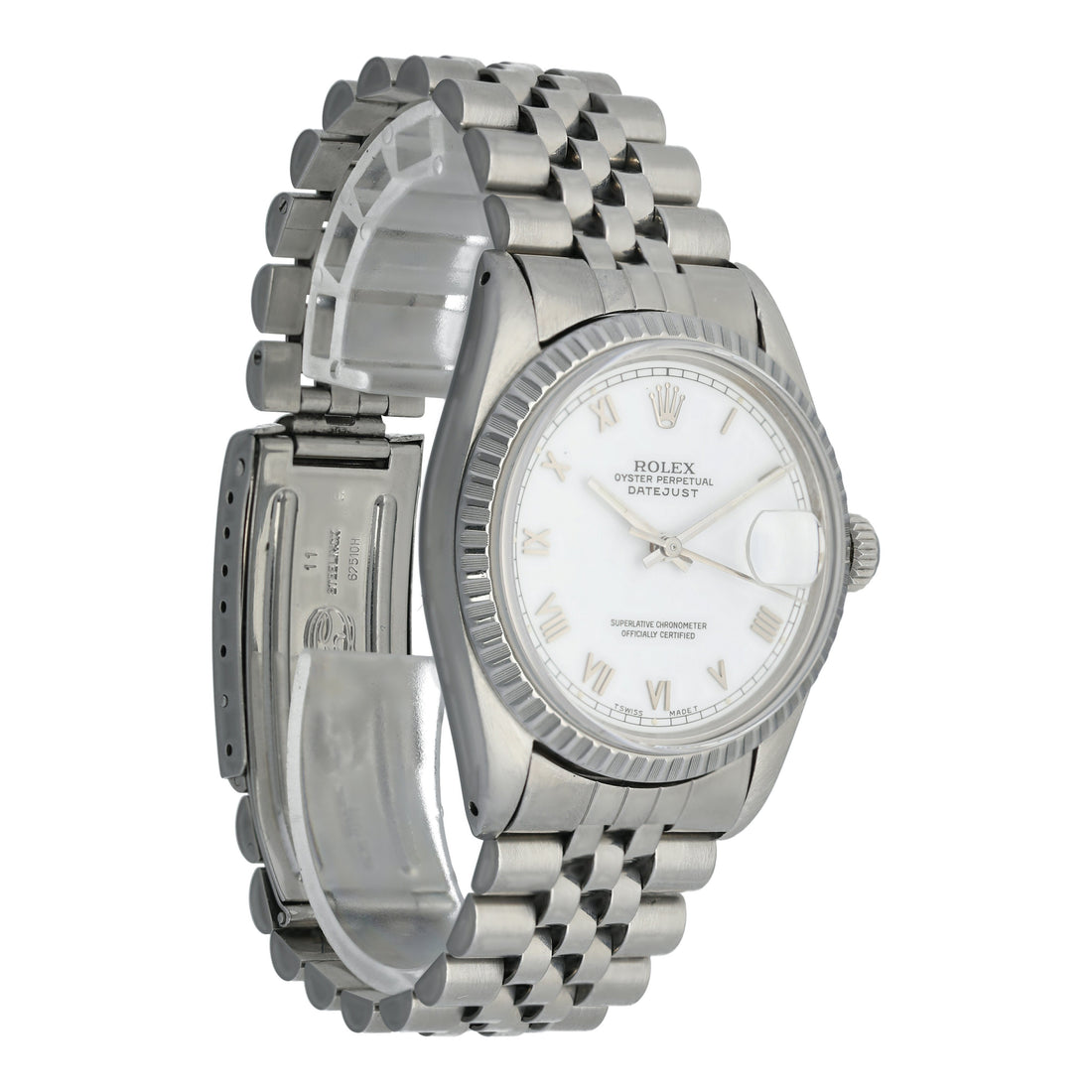 Stainless Steel bezel. White dial with Luminous Steel hands and Roman numeral hour markers. Minute markers on the outer dial. Date display at the 3 o'clock position.