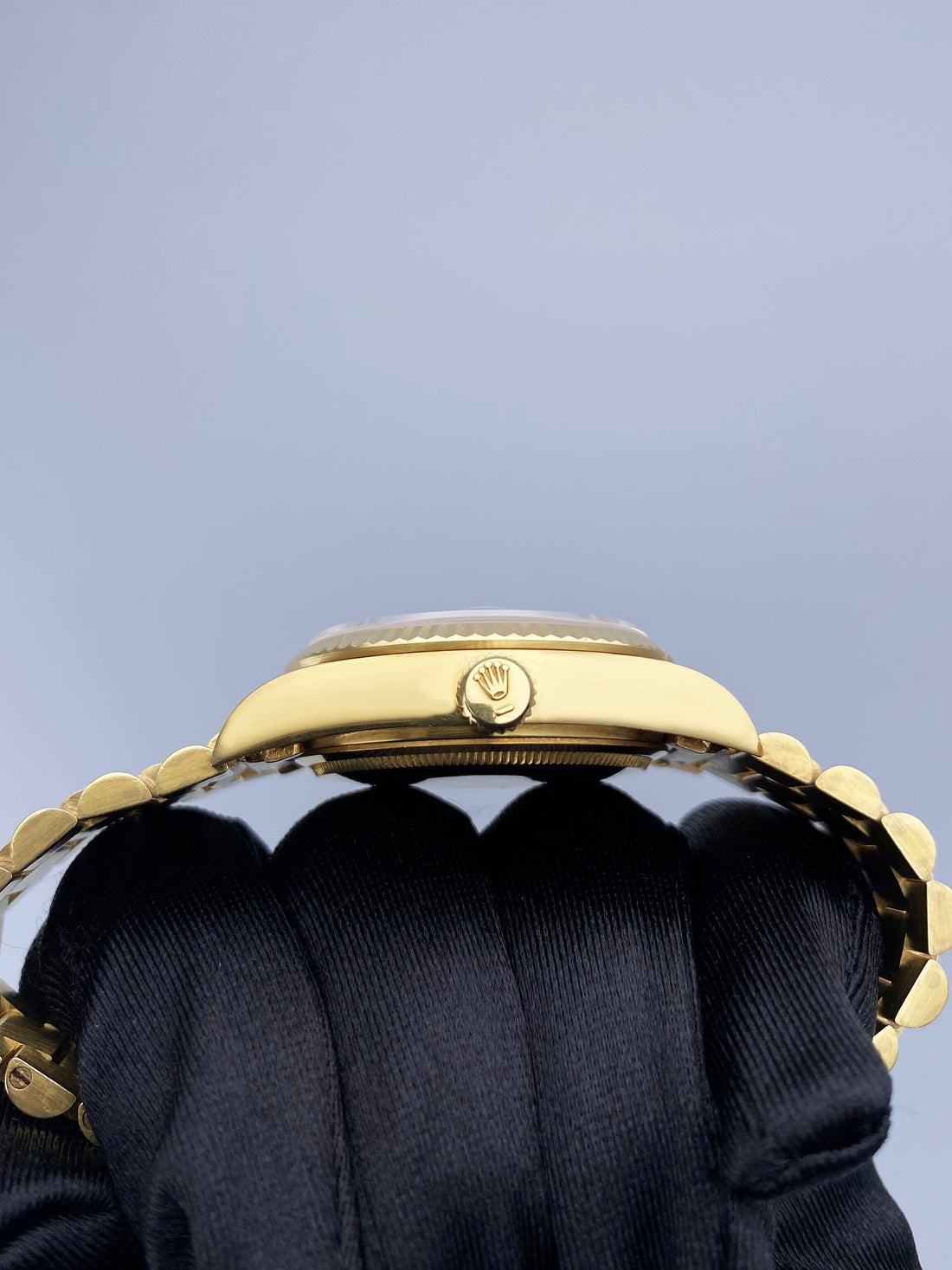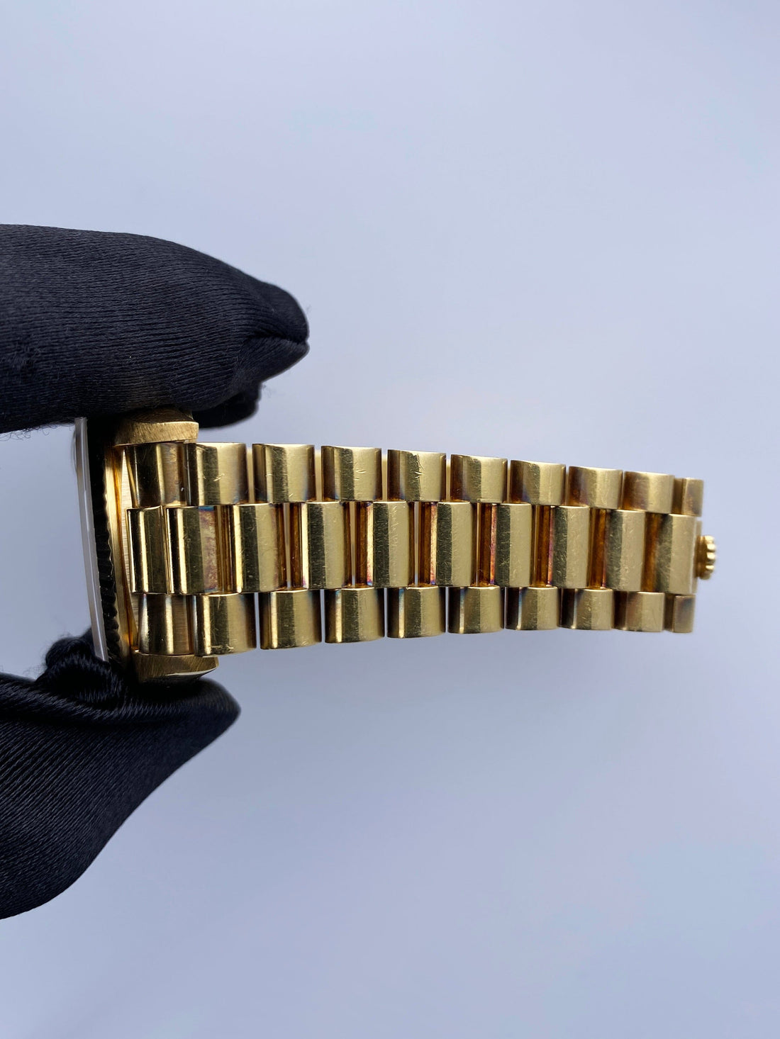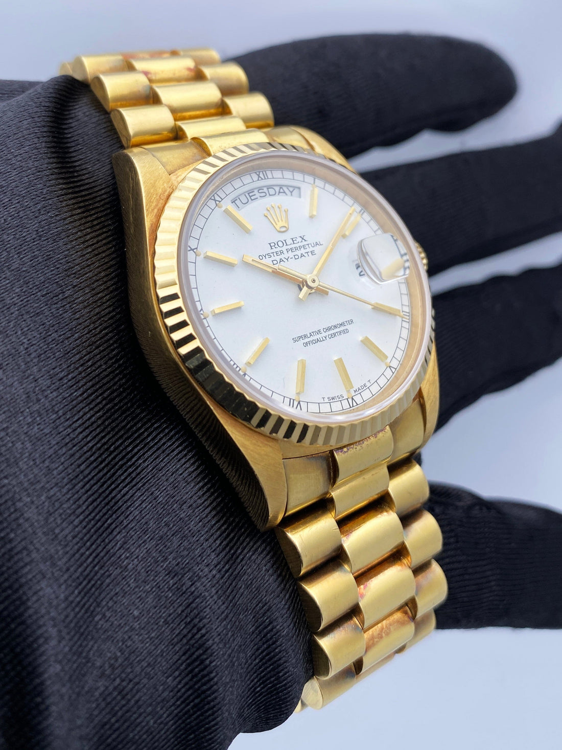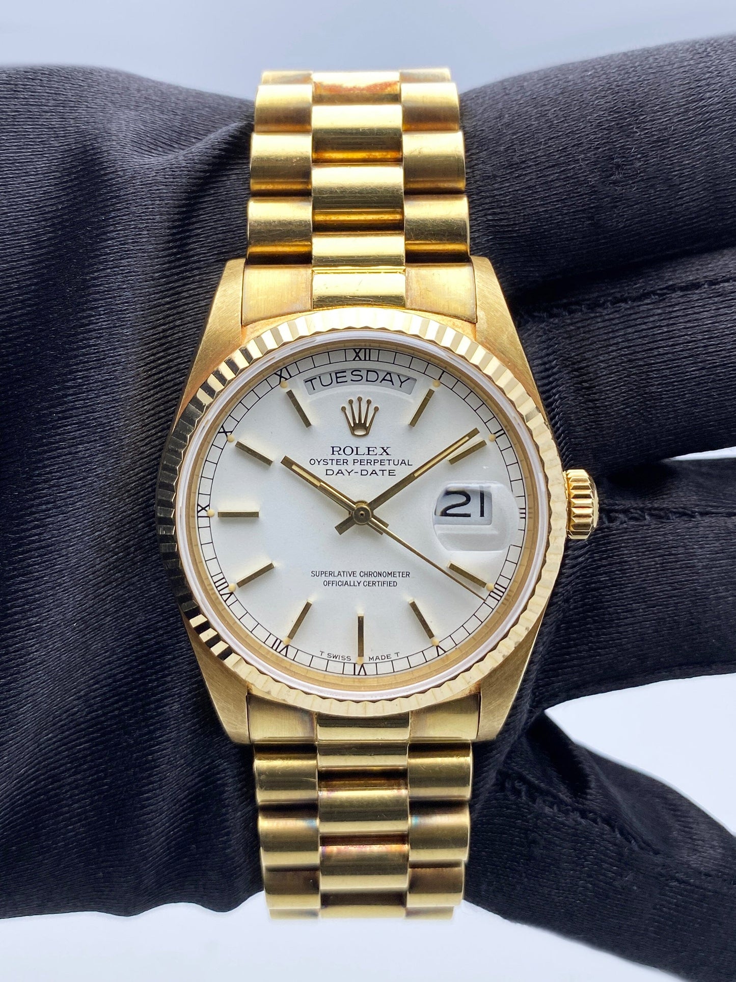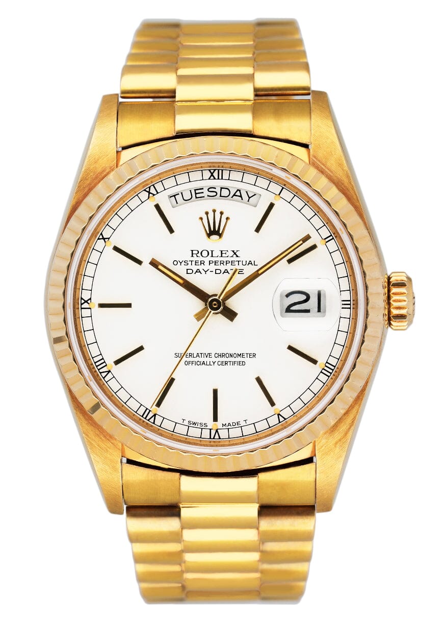 Rolex Oyster Perpetual Day-Date President 18038 Mens Watch. 36mm 18k yellow gold case. 18k yellow gold fluted bezel. White dial with luminous gold hands and index hour markers. Day display at the 12 o'clock position. 18K Yellow Gold President bracelet with hidden fold over clasp. Will fit up to a 6.75-inch wrist. Sapphire Crystal. 18K yellow gold case back. Automatic self-winding chronometer movement. This watch comes with original Box and Papers.