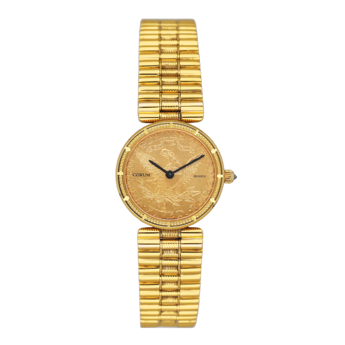 Corum $5 Coin Eagle-Liberty 4730156 Ladies Watch. 23mm 18K yellow case. 18K yellow gold bezel. Champagne dial with black hands. 18K yellow gold bracelet with 18K yellow gold hidden butterfly clasp. Will fit up to a 6.25-inch wrist. Sapphire crystal. 18K yellow gold case back. Quartz: Battery powered movement. This watch comes with original Box and Papers.