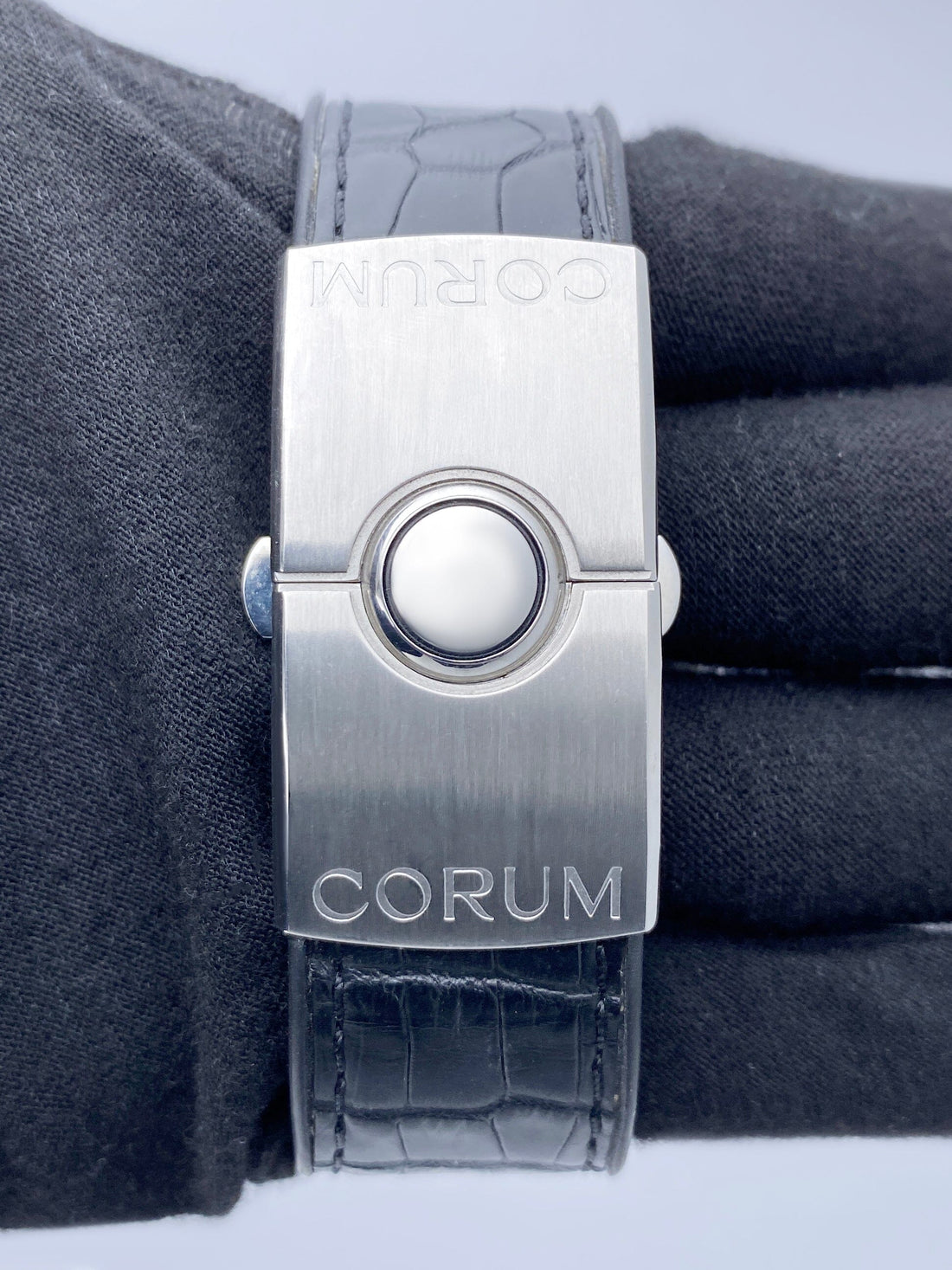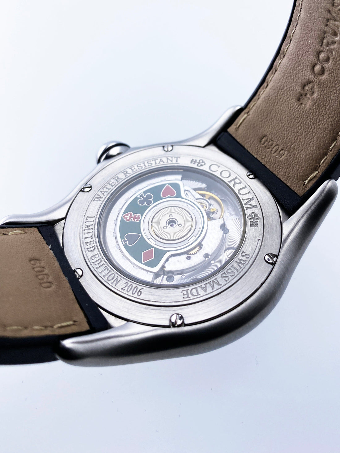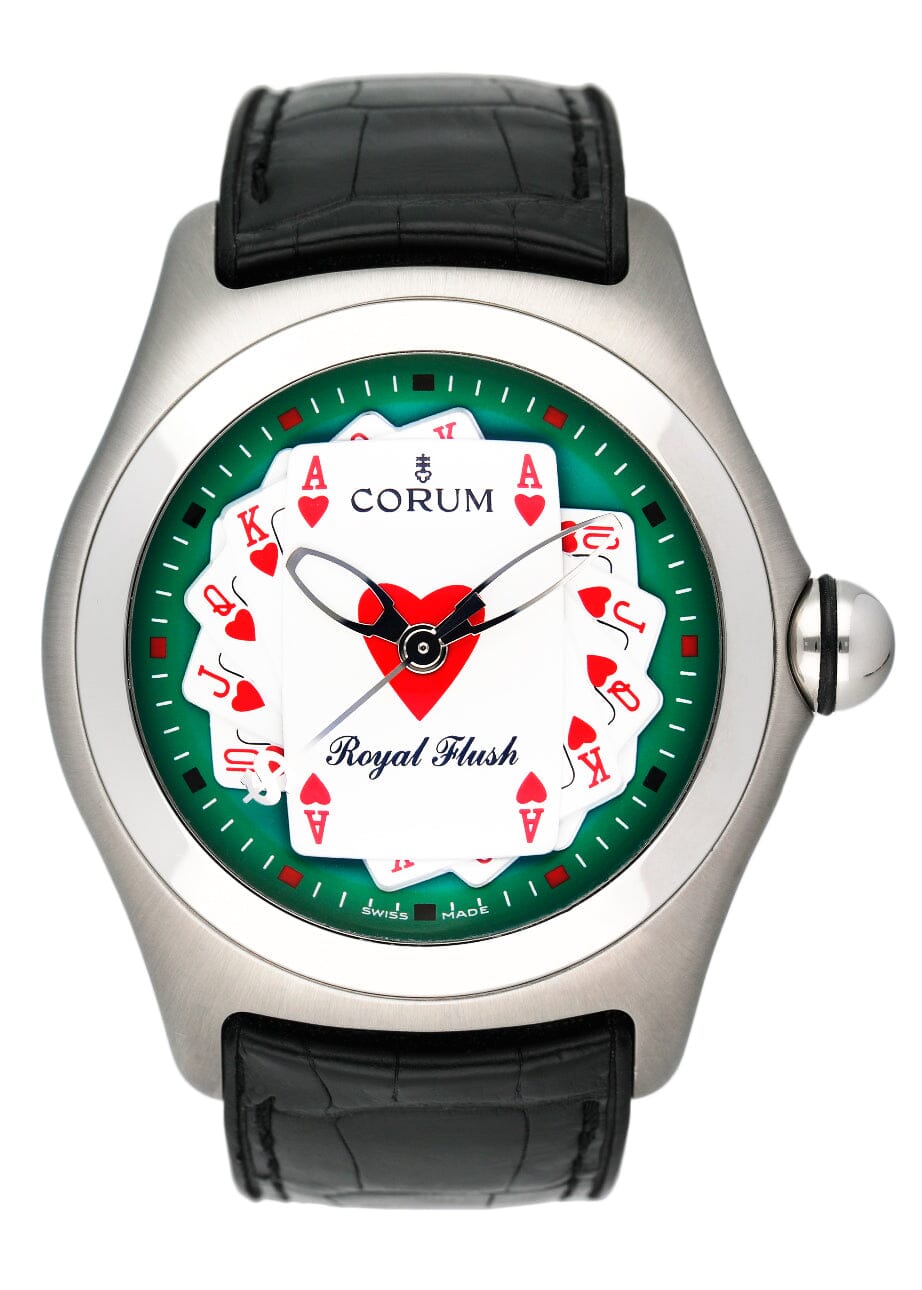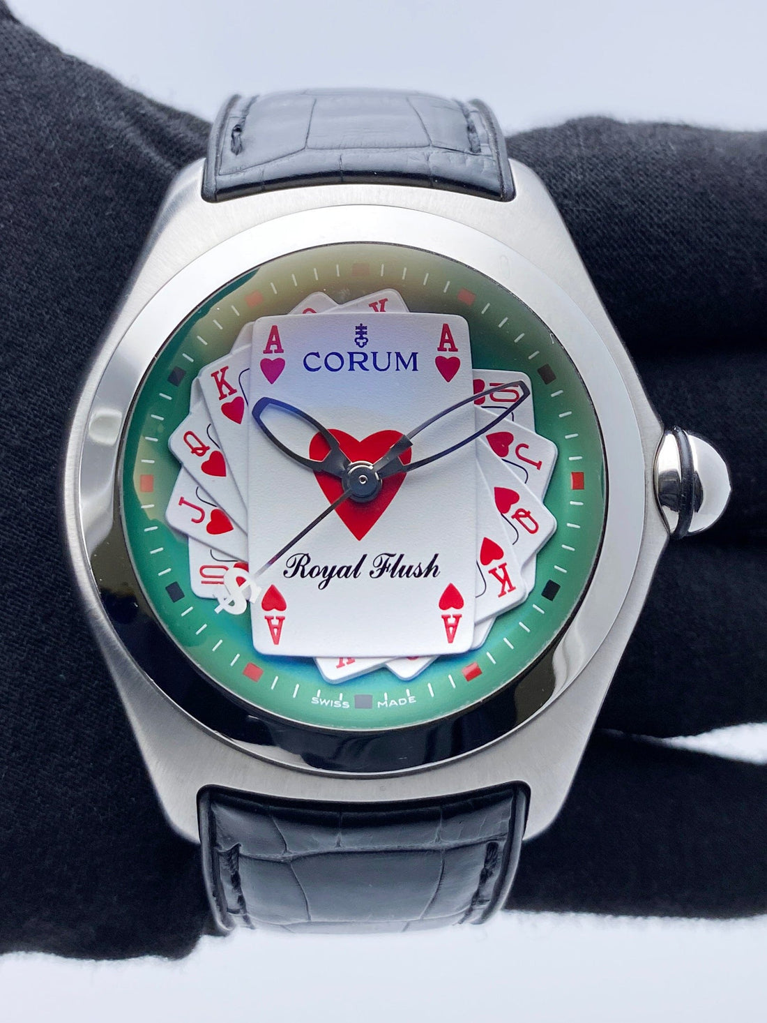 Corum Bubble Royal Flush 082.170.20/0F01 Special Edition 2006 Mens Watch. 45mm stainless steel gold case. Stainless steel bezel. Royal Flush Hearts dial with steel hands and index hour markers. Black leather strap with butterfly clasp. Will fit up to a 7-inch wrist. Sapphire crystal. Transparent sapphire crystal case back. Automatic self-winding movement.
