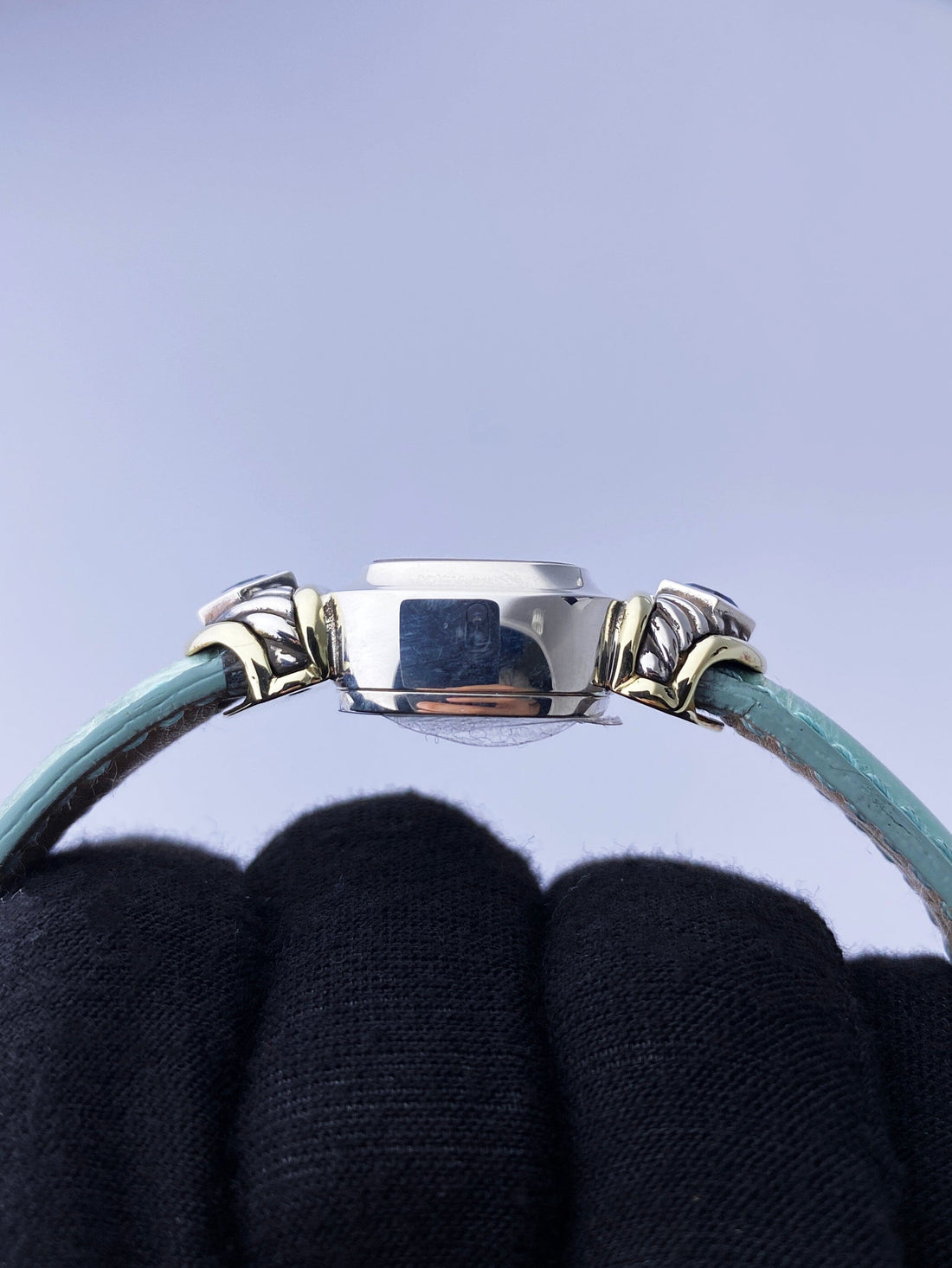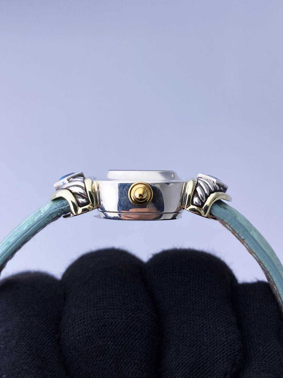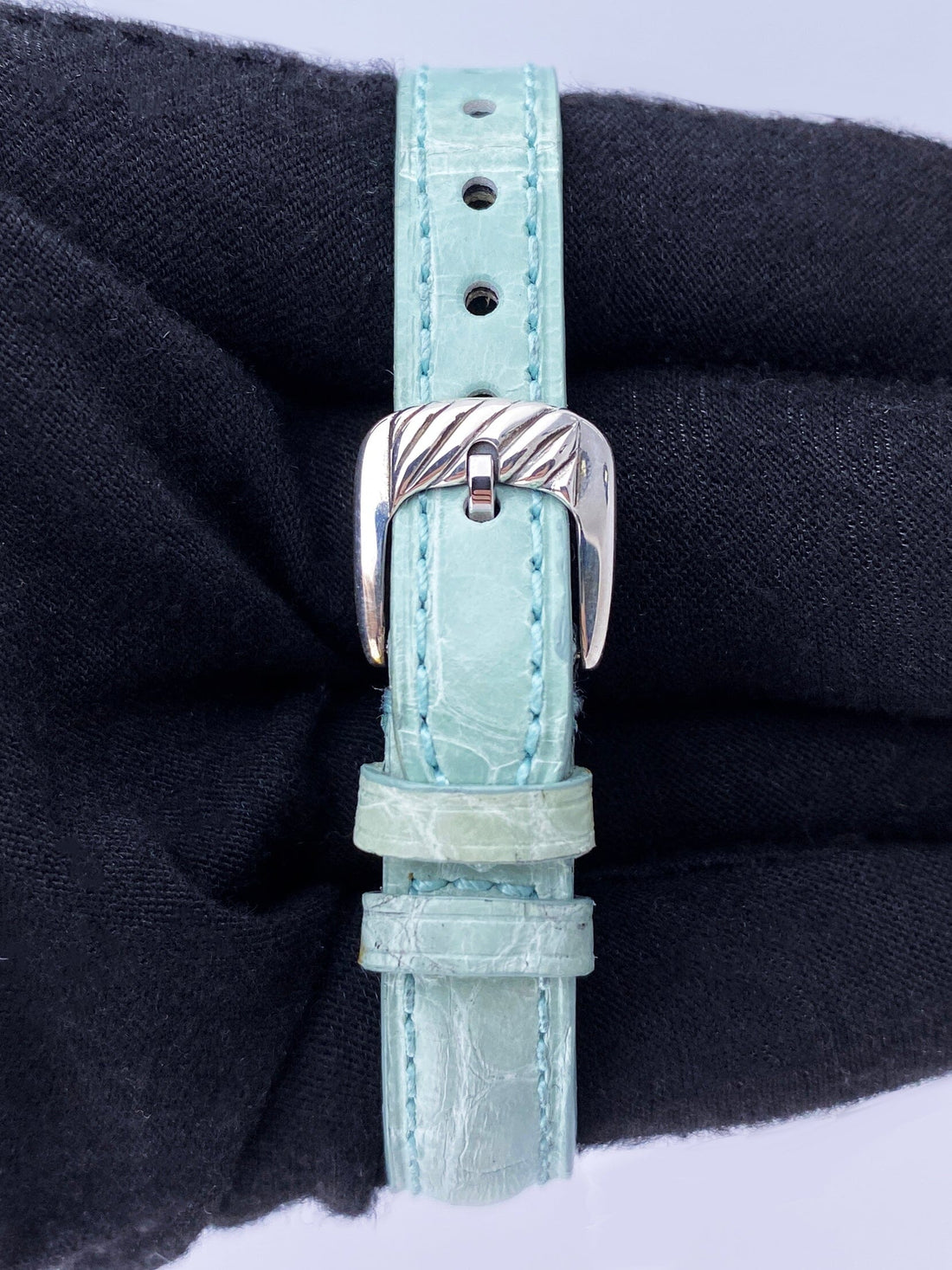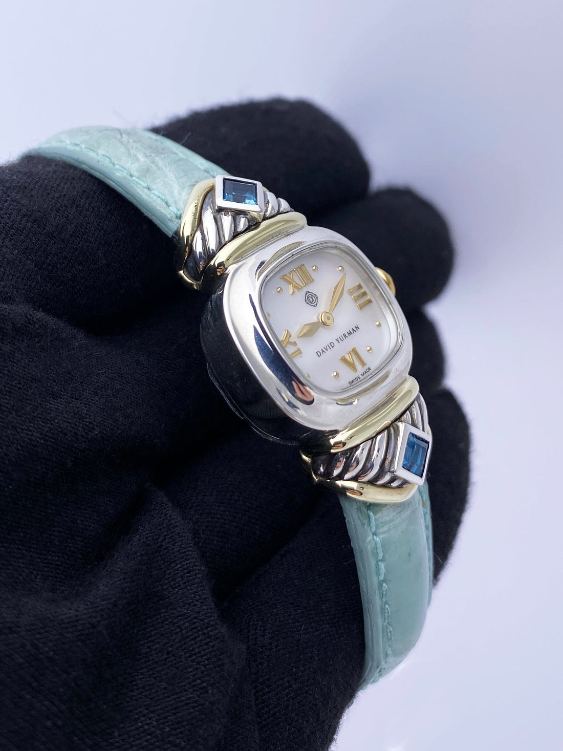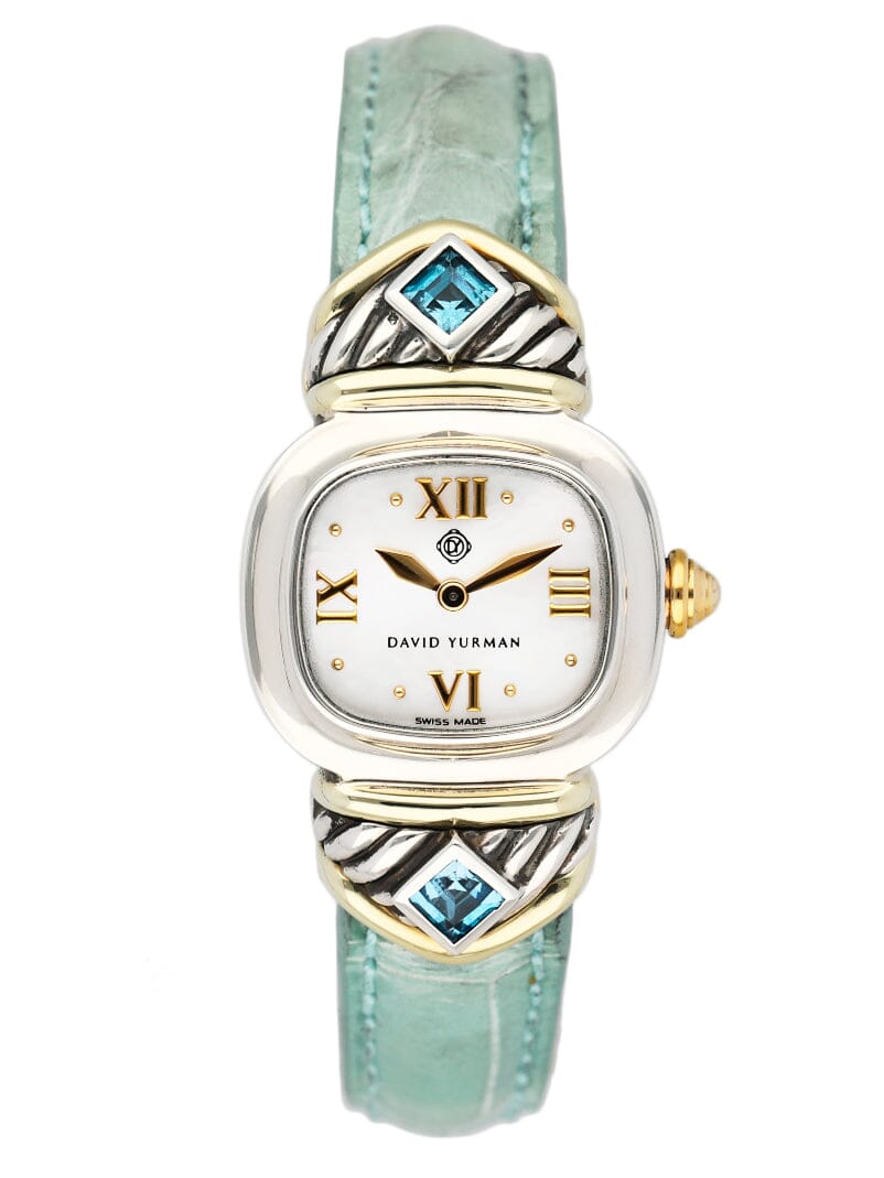 David Yurman LadiesWatch. 21mm sterling silver case. 14K yellow gold and sterling silver lugs with blue gemstones. Mother of pearl dial with gold hands and gold Roman numeral & index hour marker. Green leather strap with sterling silver buckle. Will fit up to 6-inch wrist. Acrylic crystal. Sterling silver case back.Quartz: Battery powered movement.