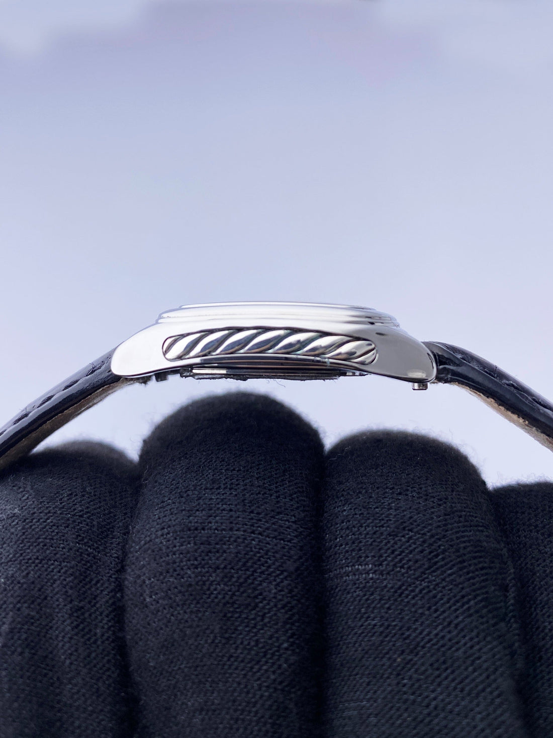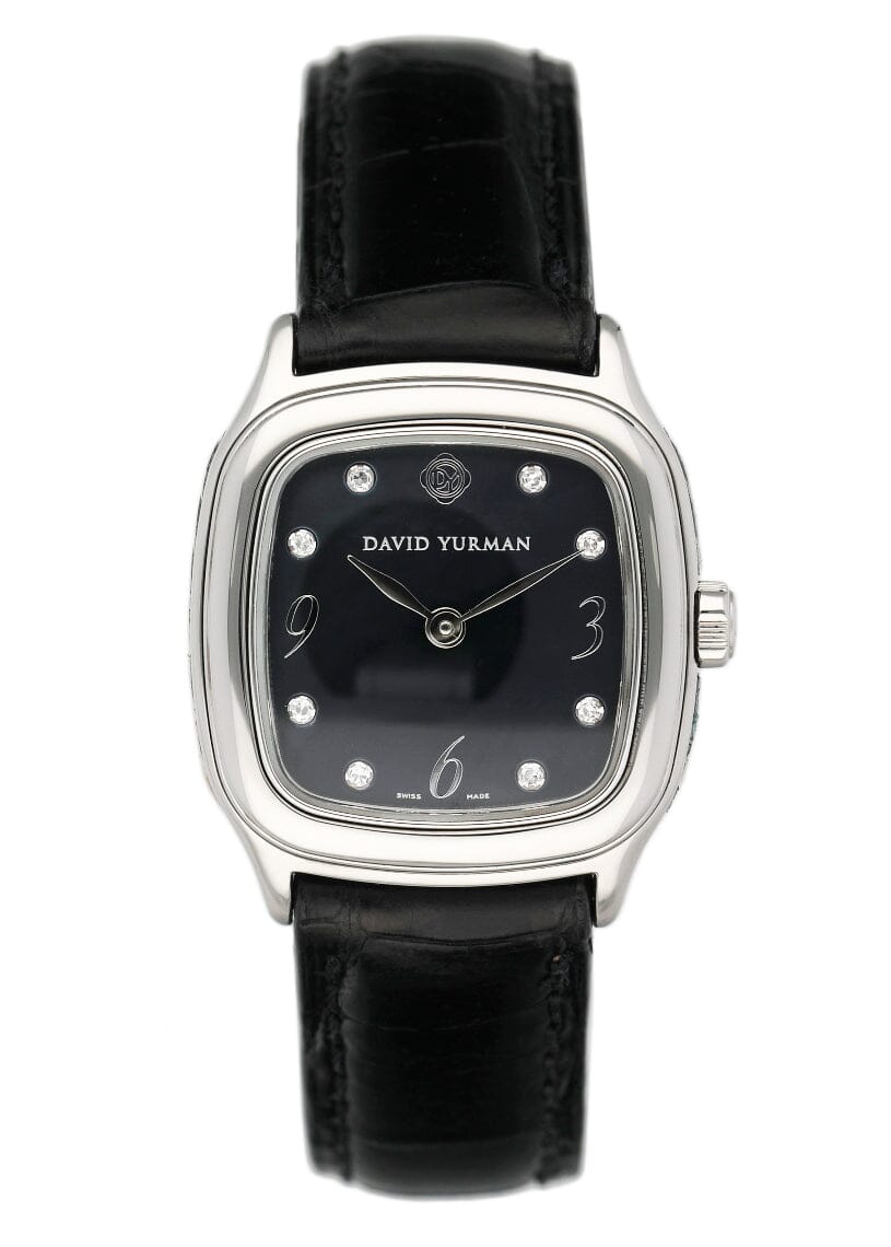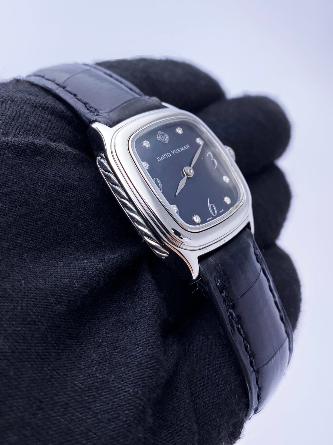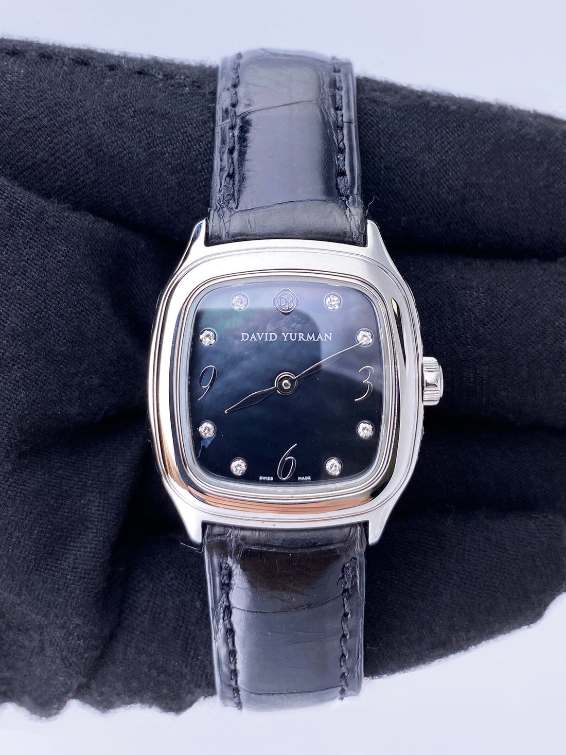 David Yurman Thoroughtbred T304-XSST Ladies Watch. 26mm Stainless steel case. Stainless steel bezel. Black Mother of Pearl dial with silver-tone hands and Arabic numeral & factory diamond hour marker. Black aftermarket leather strap with buckle. Will fit up to 6-inch wrist. Acrylic crystal. Stainless steel case back. Quartz: Battery powered movement.