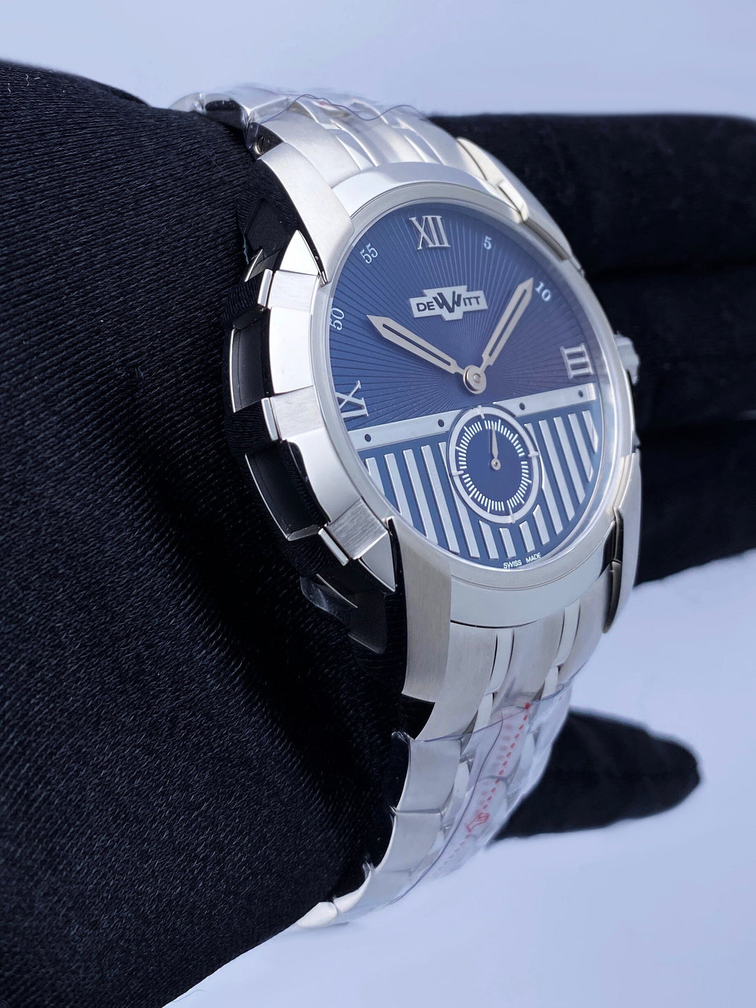 Dewitt Glorious Knight FTV.PTS.007.S Mens Watch. 42mm stainless steel case with stainless steel bezel. Blue dial with steel hands and Roman numeral hour marker. Small seconds hand at 6 o'clock. Stainless steel bracelet with hidden butterfly clasp with double push button safety. Will fit up to 7-Inch wrist. Sapphire crystal. Stainless steel case back. Automatic self-winding movement. This watch comes with original Box and Papers.