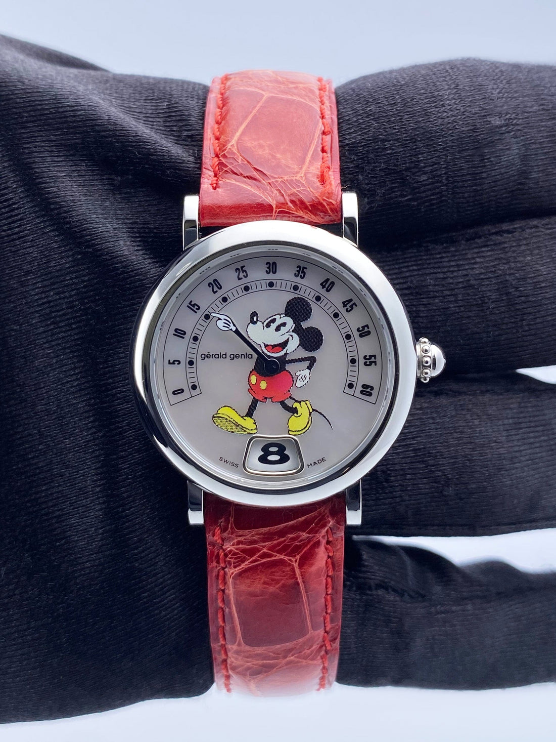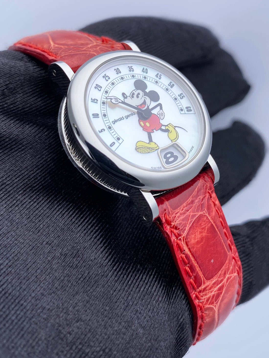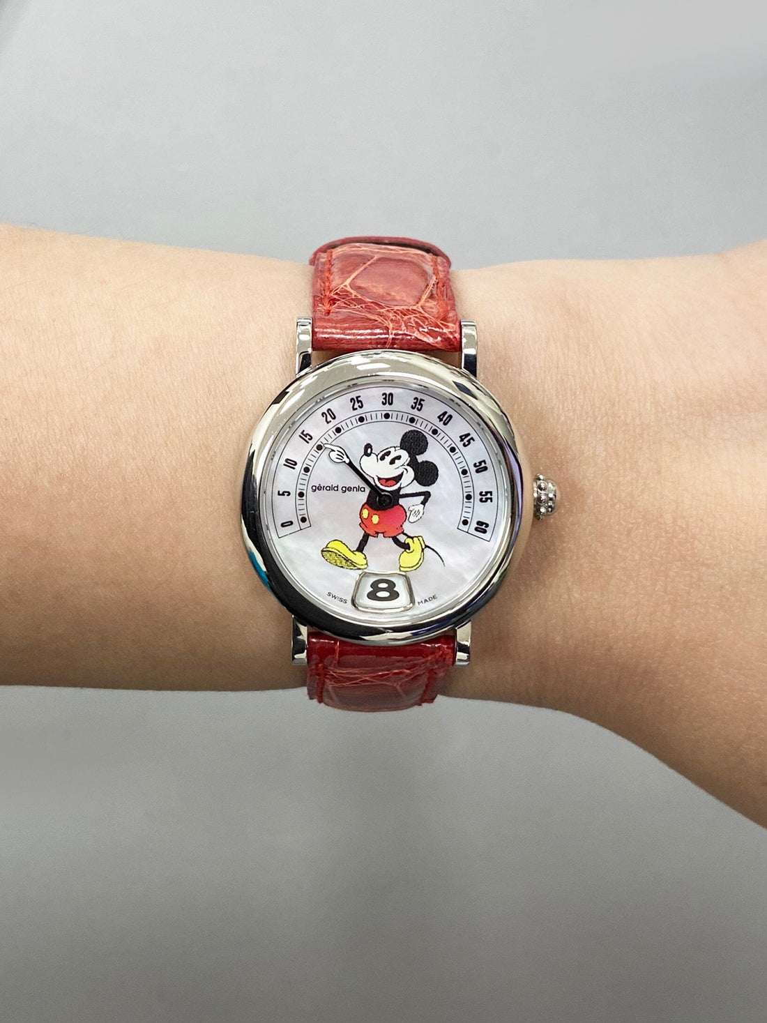 Gérald Genta Retro Disney Classic G.3622 Ladies Watch. 27mm stainless steel case. Stainless steel bezel. Mother-of-Pearl Minnie Mouse dial with Mickey Mouse's Hands hands and Arabic numeral hour markers. Feature jumping hours display at 6 o'clock position. Minutes are tracked on an arc spanning the top half of the mother-of-pearl dial. Red leather strap with stainless steel buckle. Will fit up to 6-Inch wrist. Sapphire crystal. Stainless steel case back. Quartz: Battery powered movement.