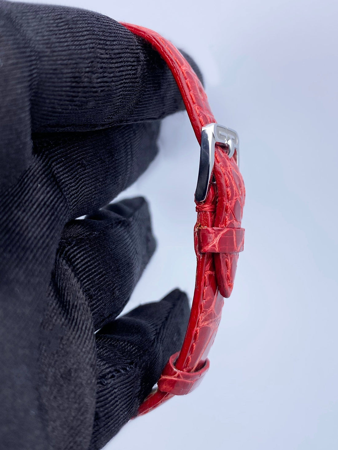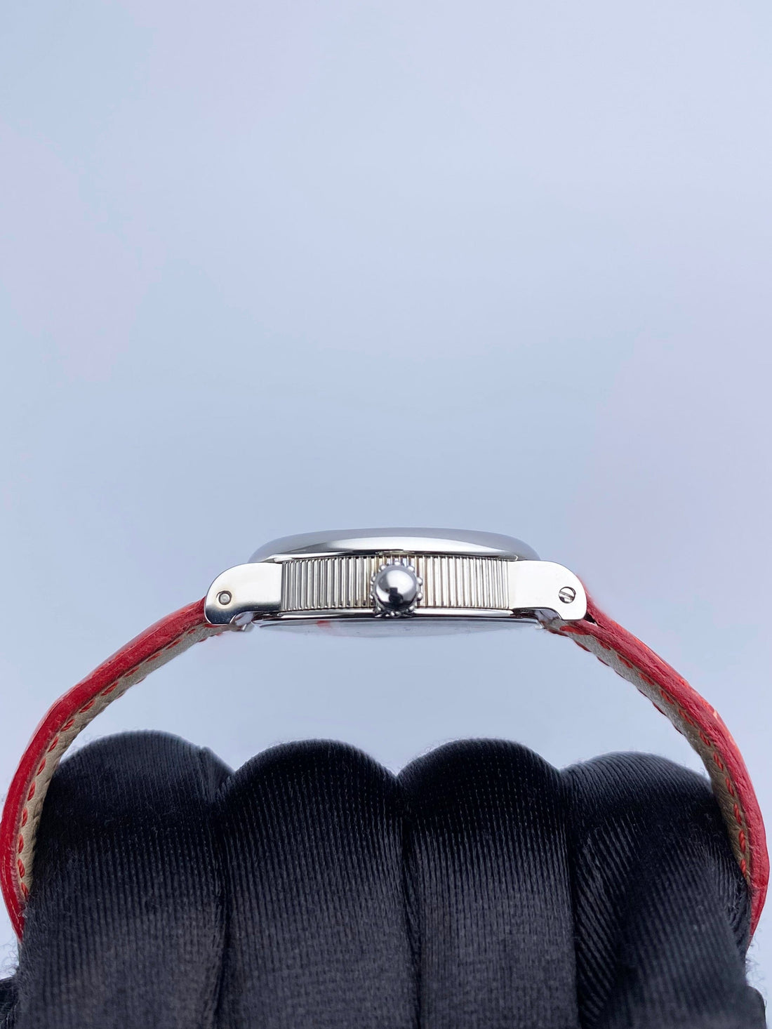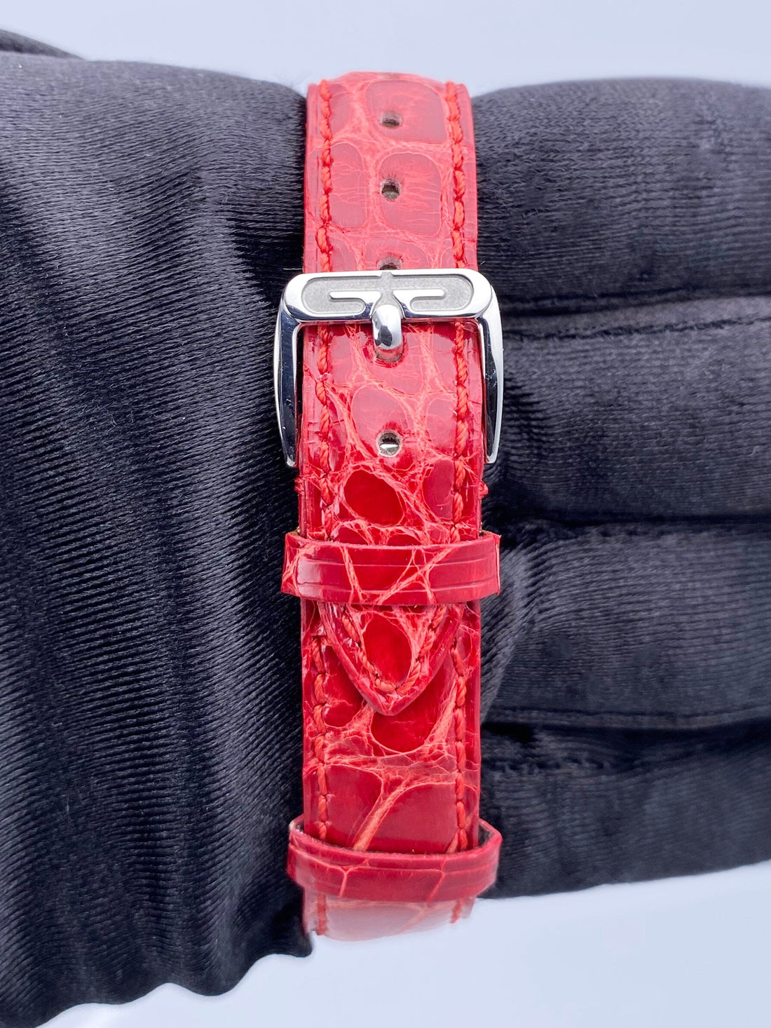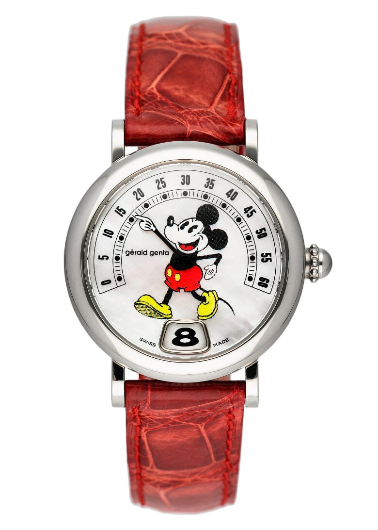Gérald Genta Retro Disney Classic G.3622 Ladies Watch. 27mm stainless steel case. Stainless steel bezel. Mother-of-Pearl Minnie Mouse dial with Mickey Mouse's Hands hands and Arabic numeral hour markers. Feature jumping hours display at 6 o'clock position. Minutes are tracked on an arc spanning the top half of the mother-of-pearl dial. Red leather strap with stainless steel buckle. Will fit up to 6-Inch wrist. Sapphire crystal. Stainless steel case back. Quartz: Battery powered movement.