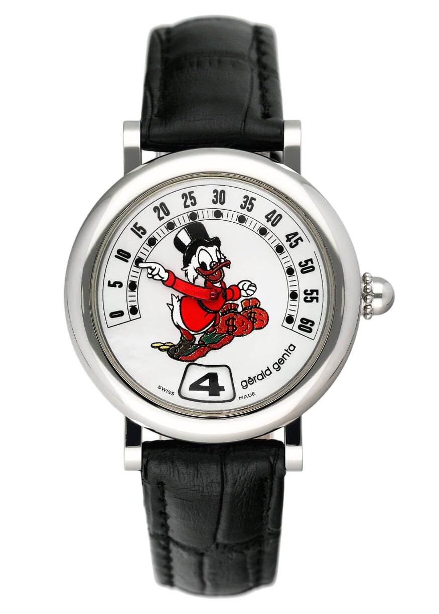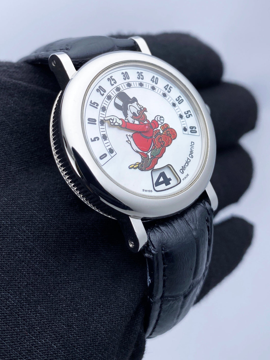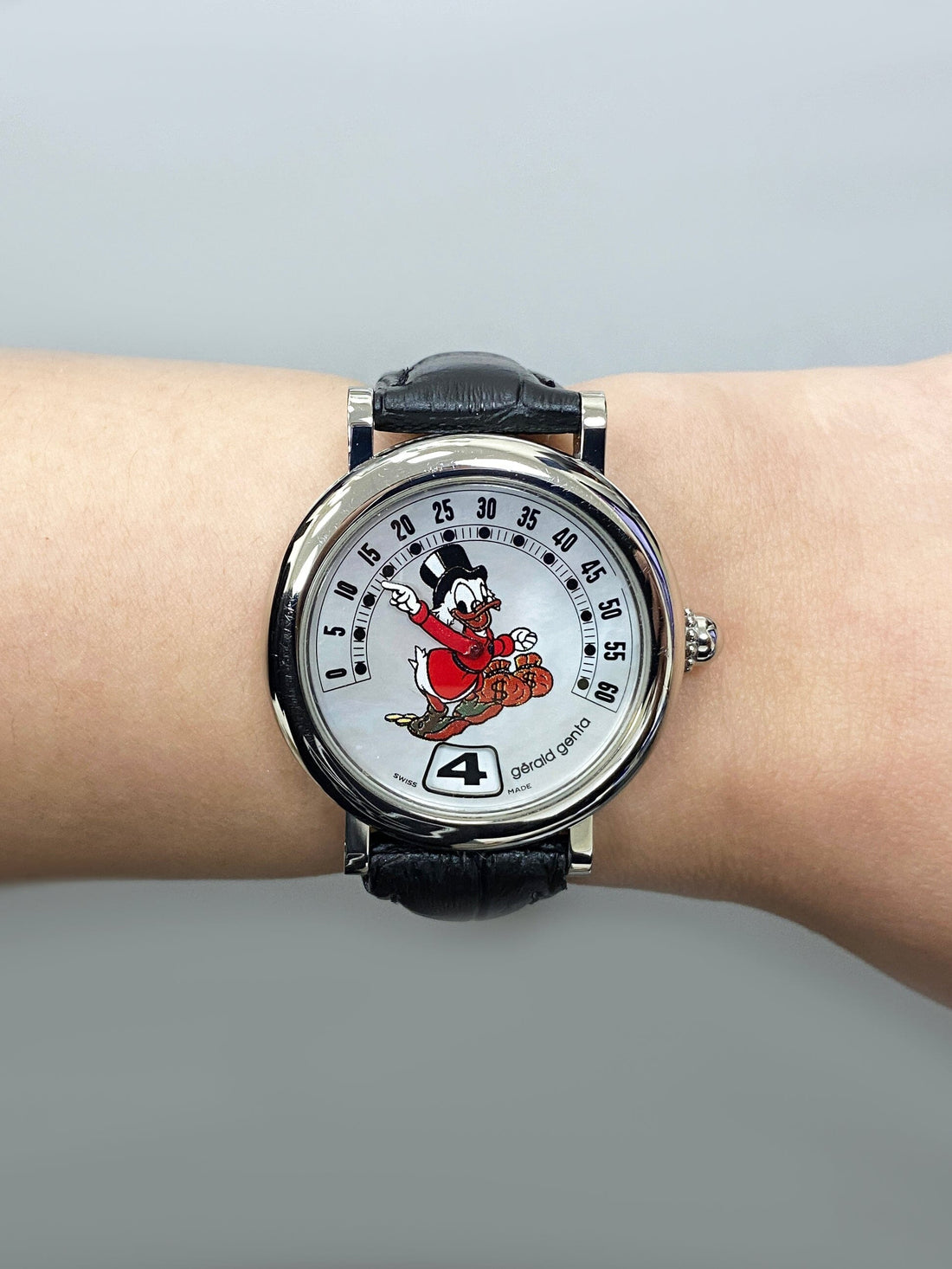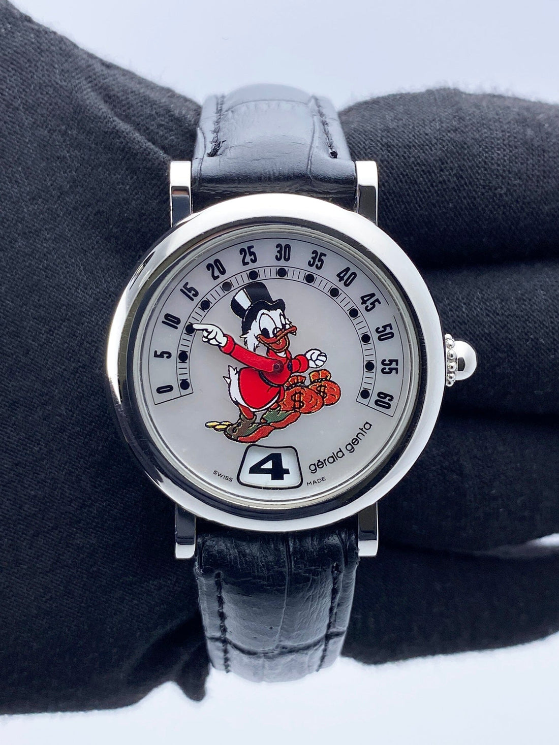 Gérald Genta Retro Disney G.3612.7 Watch. 34mm stainless steel case. Stainless steel bezel. Mother-of-Pearl Donald Duck dial with baseball bat hands and Arabic numeral hour markers. Feature jumping hours display at 6 o'clock position. Minutes are tracked on an arc spanning the top half of the mother-of-pearl dial. Black leather strap with stainless steel buckle. Will fit up to 7-Inch wrist. Sapphire crystal. Stainless steel case back. Quartz: Battery powered movement.