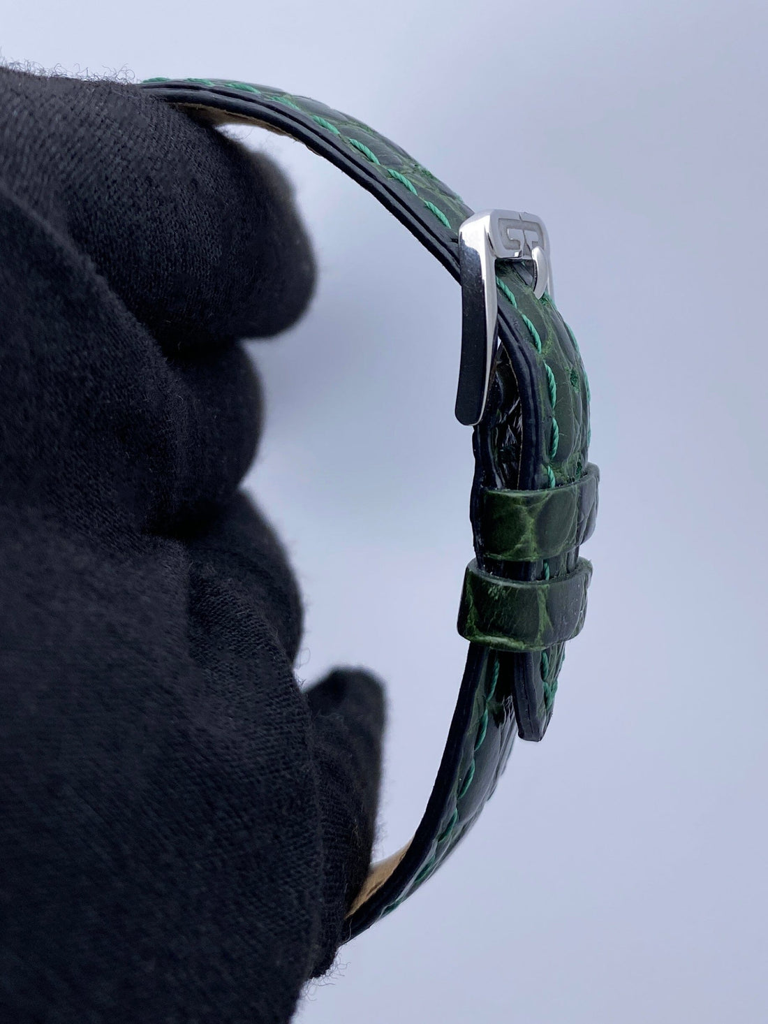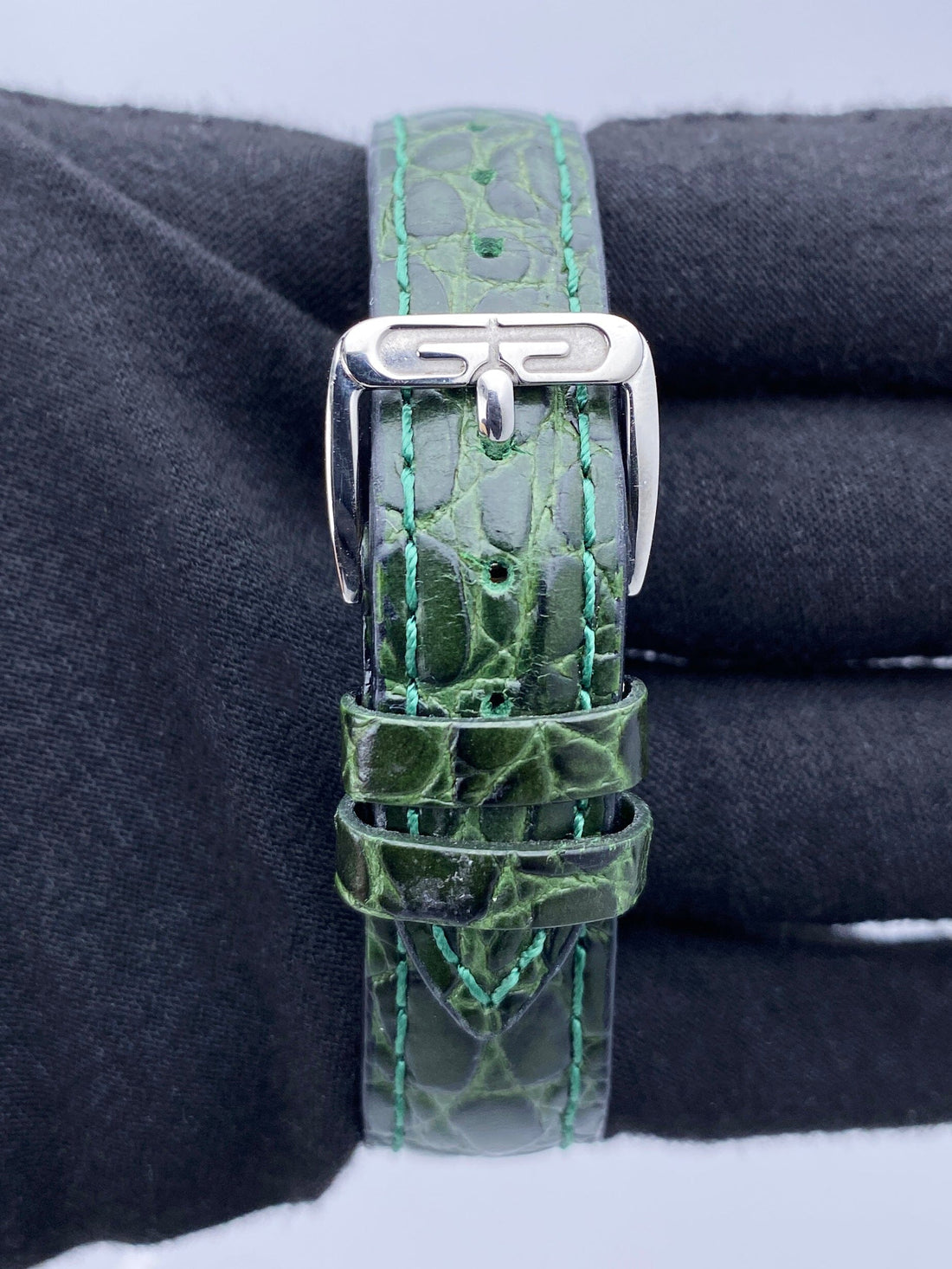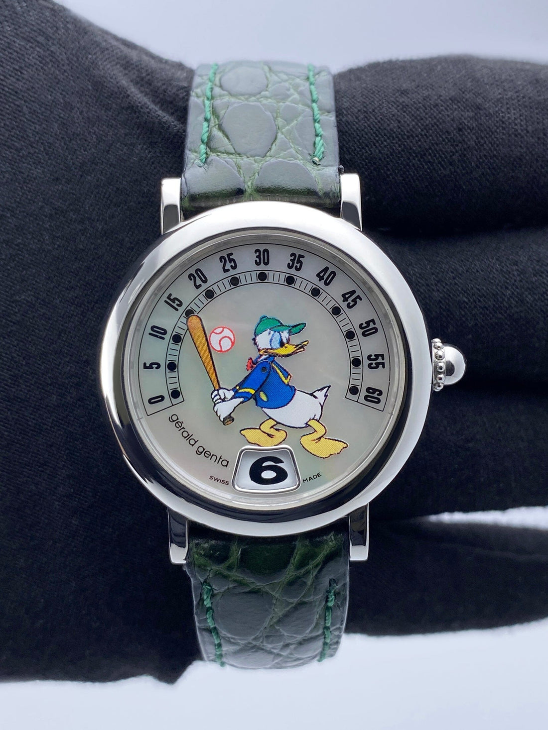 Gérald Genta Retro Disney G.3612 Ladies Watch. 27mm stainless steel case. Stainless steel bezel. Mother-of-Pearl Donald Duck dial with Baseball bat hands and Arabic numeral hour markers. Feature jumping hours display at 6 o'clock position. Minutes are tracked on an arc spanning the top half of the mother-of-pearl dial. Green aftermarket leather strap with stainless steel buckle. Will fit up to 7.5-Inch wrist. Sapphire crystal. Stainless steel case back. Quartz: Battery powered movement.
