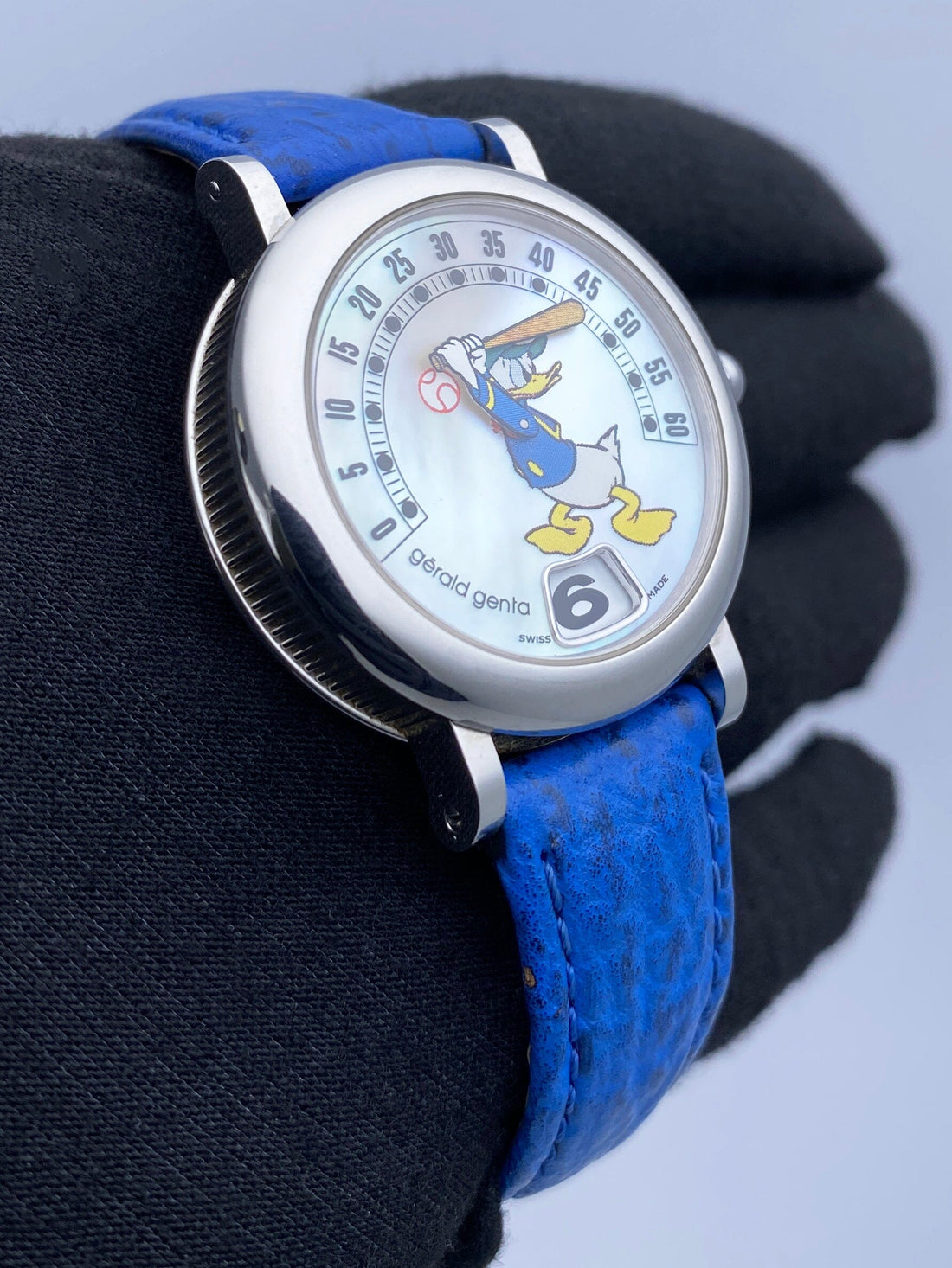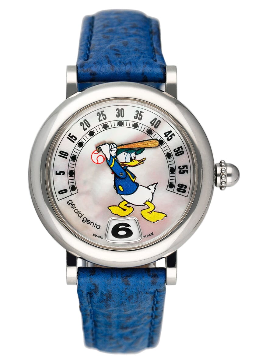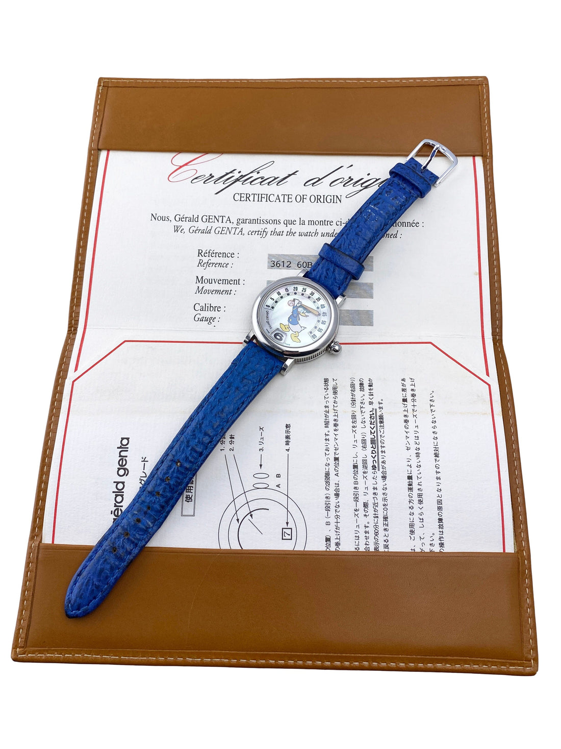Gérald Genta Retro Disney G.3612 Watch. 34mm stainless steel case. Stainless steel bezel. Mother-of-Pearl Donald Duck dial with baseball bat hands and Arabic numeral hour markers. Feature jumping hours display at 6 o'clock position. Minutes are tracked on an arc spanning the top half of the mother-of-pearl dial. Blue leather strap with stainless steel buckle. Will fit up to 7-Inch wrist. Sapphire crystal. Stainless steel case back. Quartz: Battery powered movement. This watch comes with original Papers.