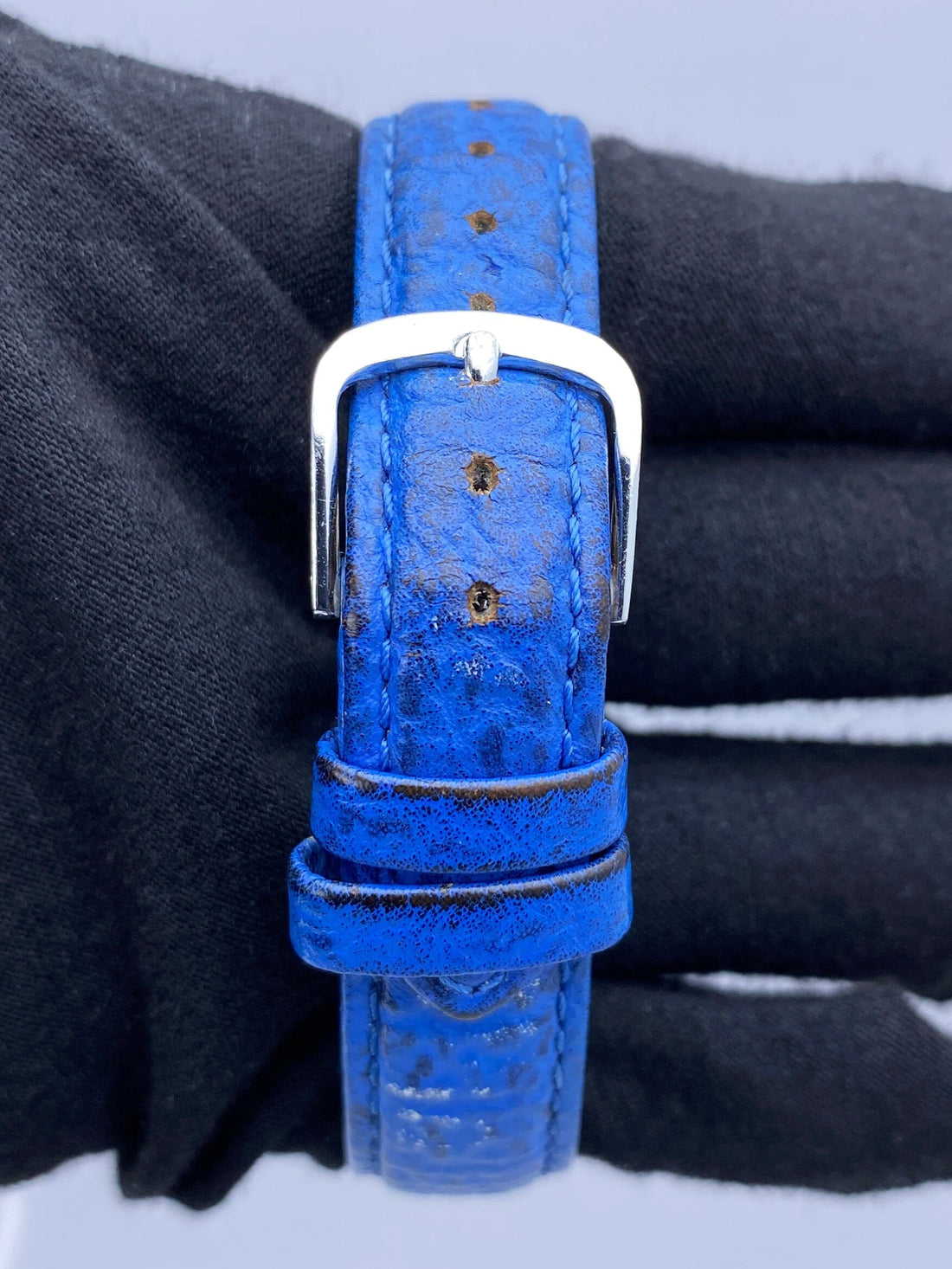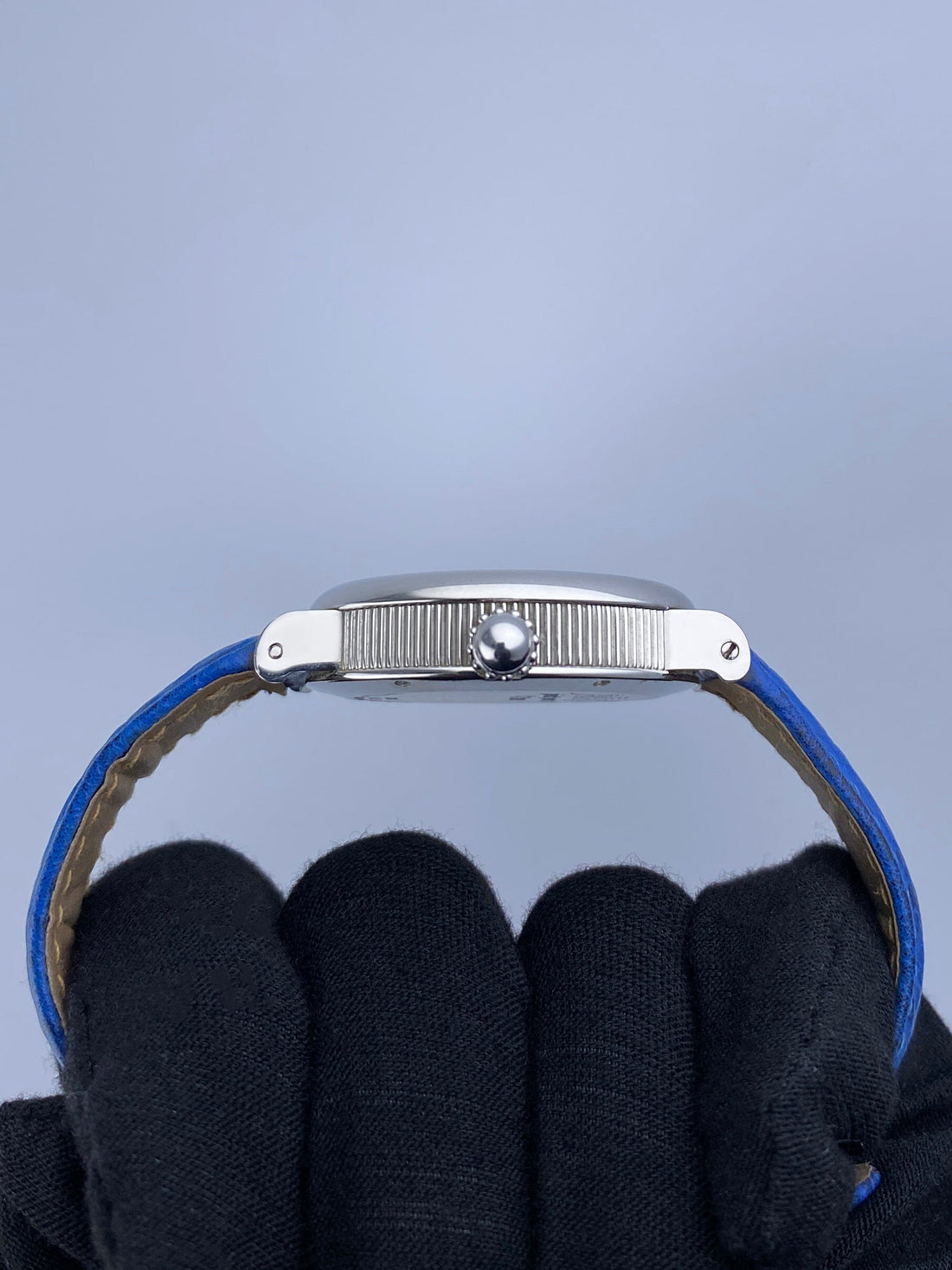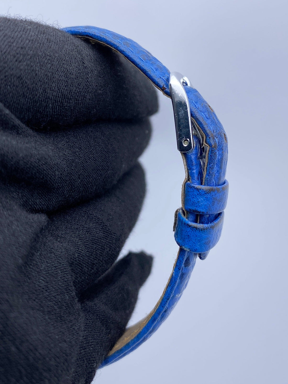Gérald Genta Retro Disney G.3612 Watch. 34mm stainless steel case. Stainless steel bezel. Mother-of-Pearl Donald Duck dial with baseball bat hands and Arabic numeral hour markers. Feature jumping hours display at 6 o'clock position. Minutes are tracked on an arc spanning the top half of the mother-of-pearl dial. Blue leather strap with stainless steel buckle. Will fit up to 7-Inch wrist. Sapphire crystal. Stainless steel case back. Quartz: Battery powered movement. This watch comes with original Papers.