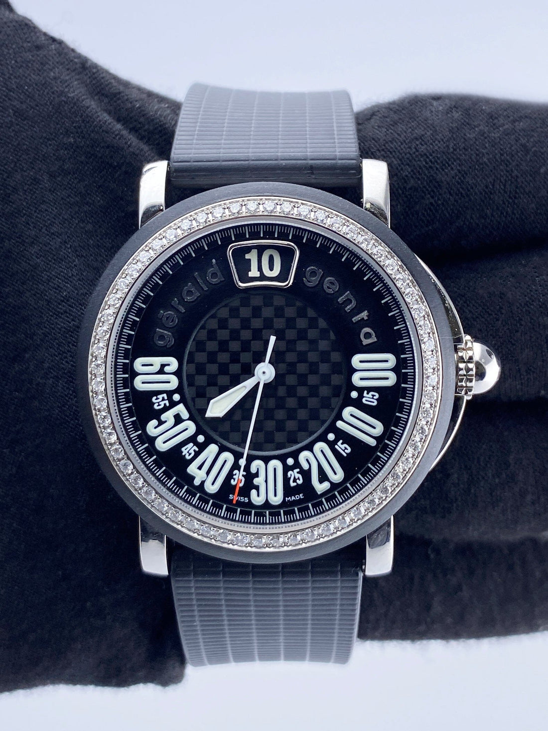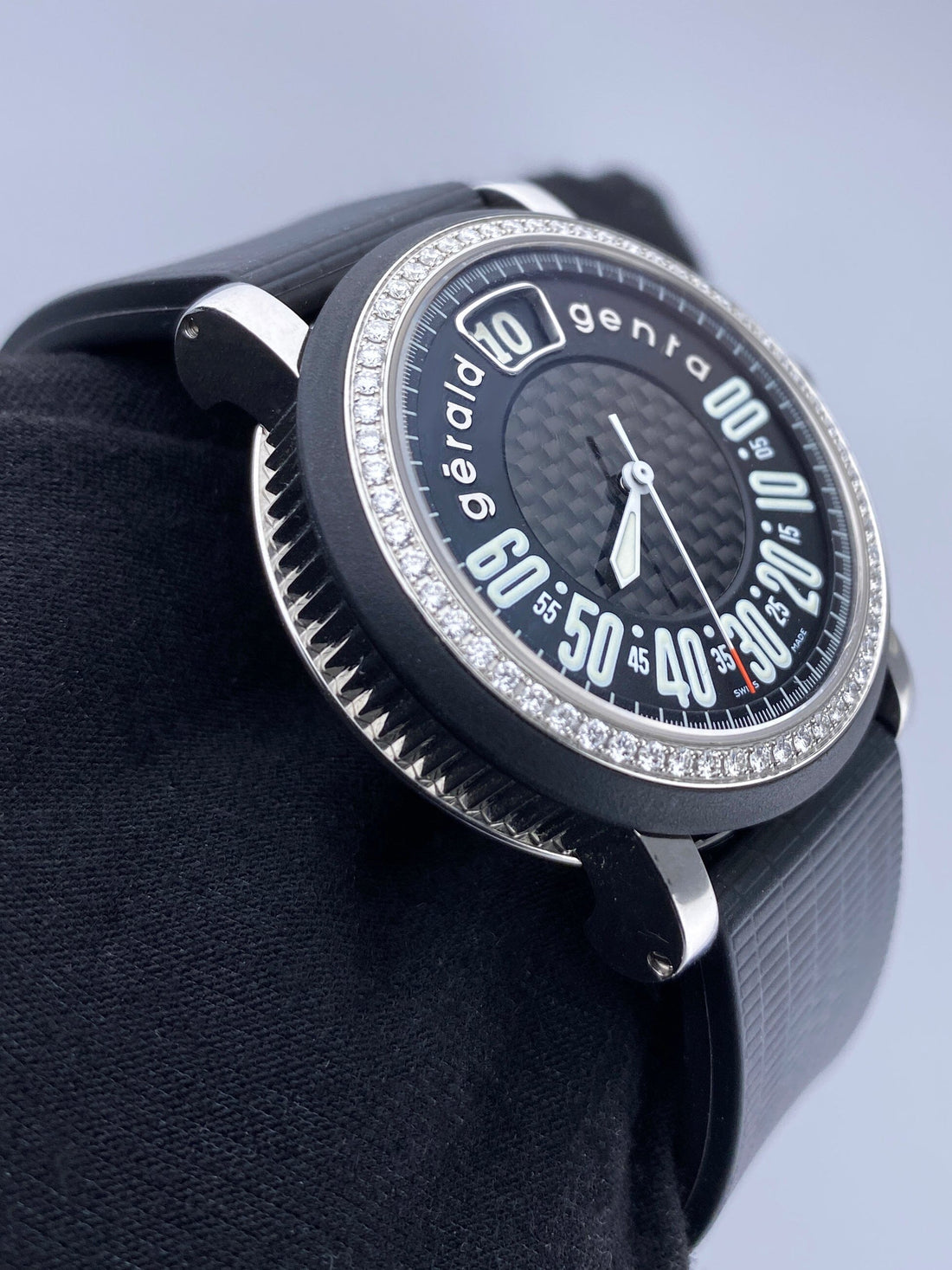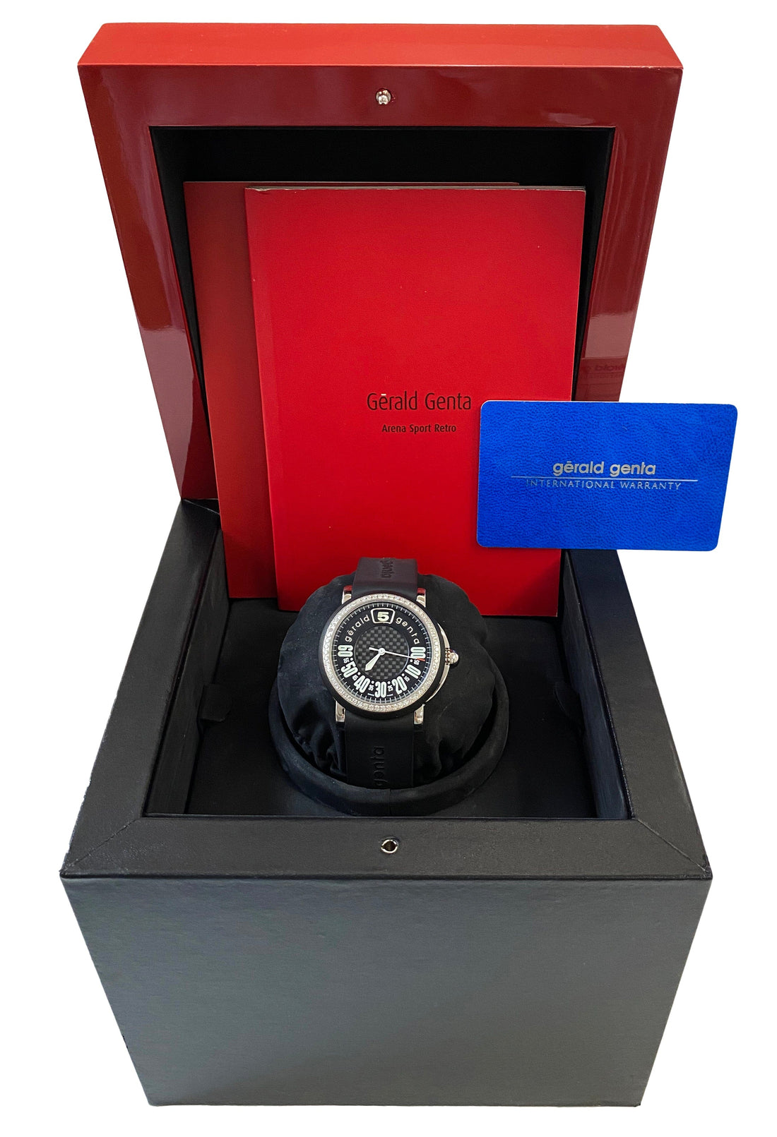 Gérald Genta Retro Sport RSP.X.10 Mens Watch. 37mm stainless steel case with original factory diamonds set bezel. Black dial with white hands and Arabic numeral hour marker. Feature jumping hours display at 12 o'clock position. Minutes are tracked between 3 and 9 o'clock position. Black aftermarket rubber strap with stainless steel buckle. Will fit up to 7.75-inch wrist. Sapphire crystal. Stainless steel case back. Automatic self-winding movement. This watch comes with Box and Papers.