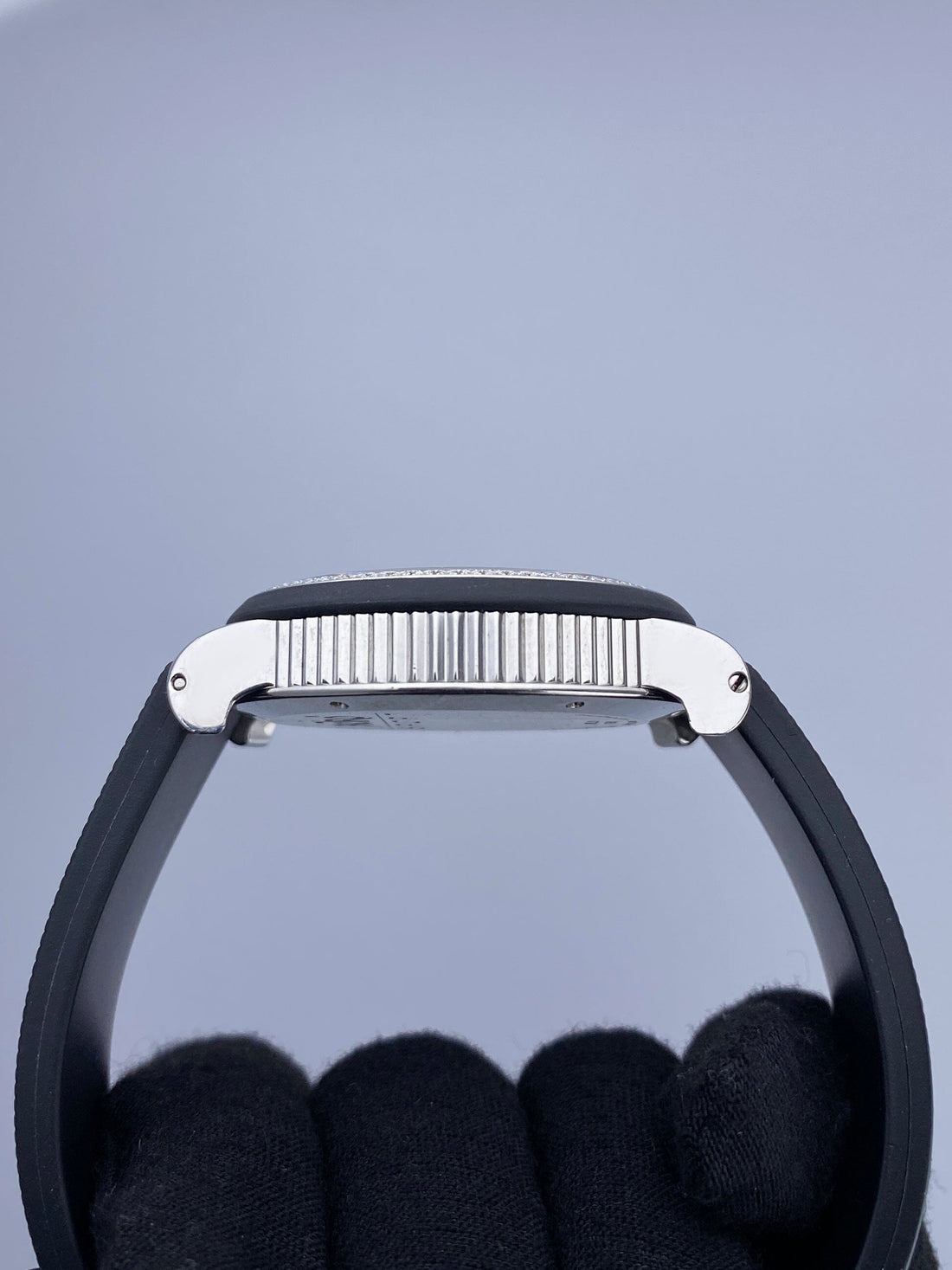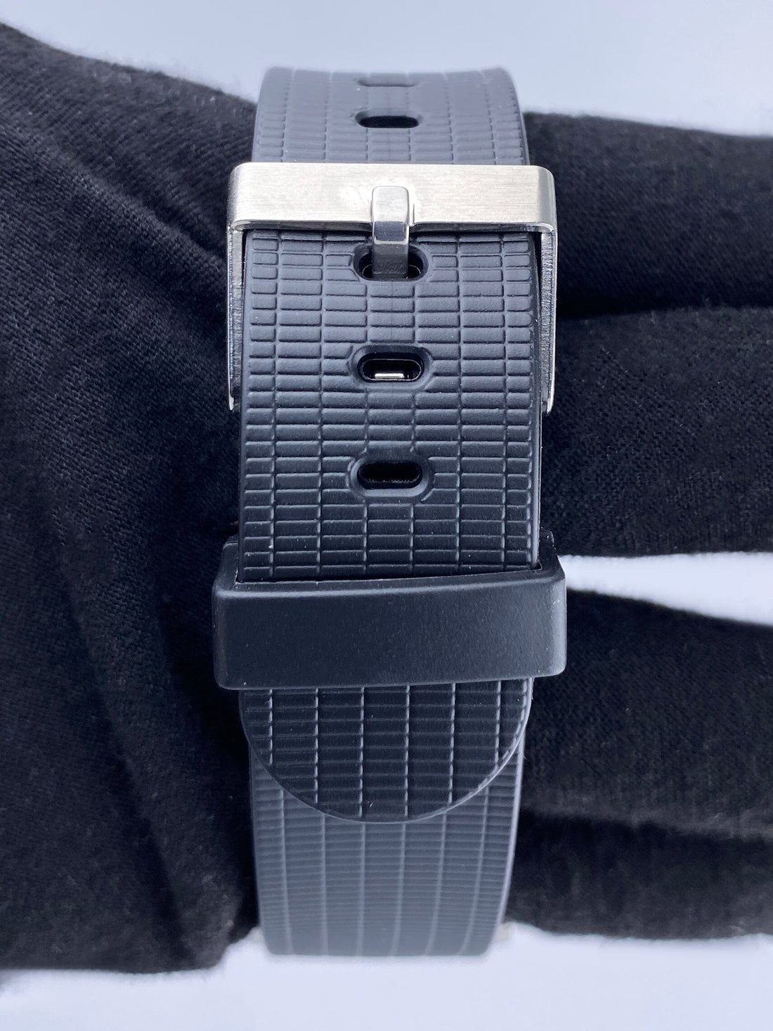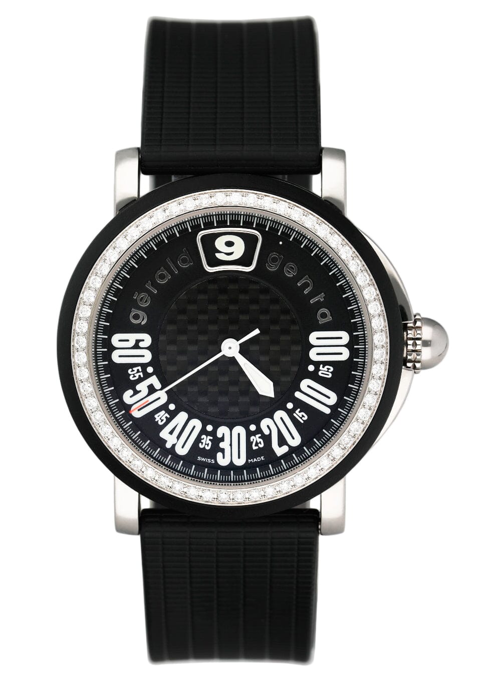 Gérald Genta Retro Sport RSP.X.10 Mens Watch. 37mm stainless steel case with original factory diamonds set bezel. Black dial with white hands and Arabic numeral hour marker. Feature jumping hours display at 12 o'clock position. Minutes are tracked between 3 and 9 o'clock position. Black aftermarket rubber strap with stainless steel buckle. Will fit up to 7.75-inch wrist. Sapphire crystal. Stainless steel case back. Automatic self-winding movement. This watch comes with Box and Papers.