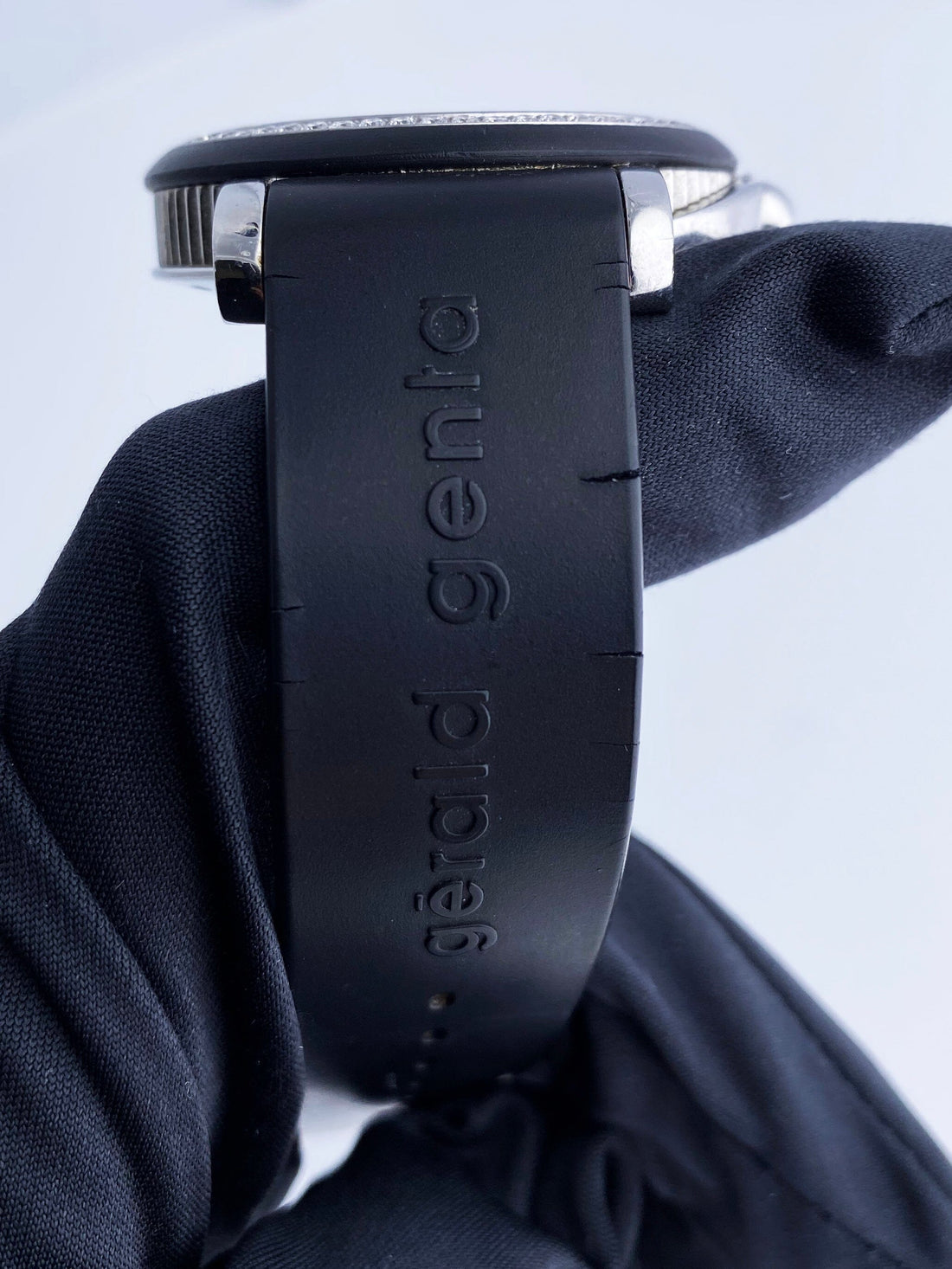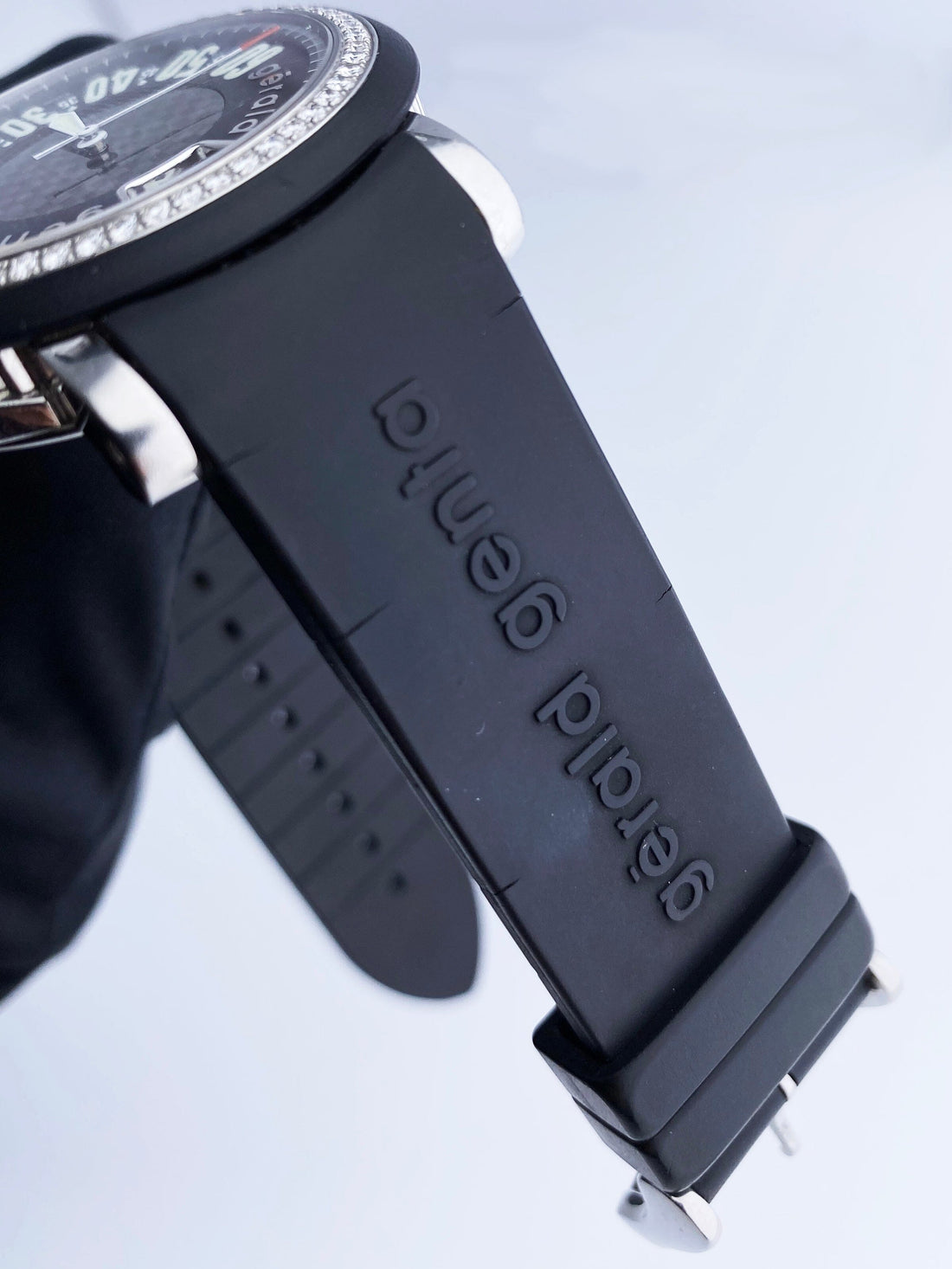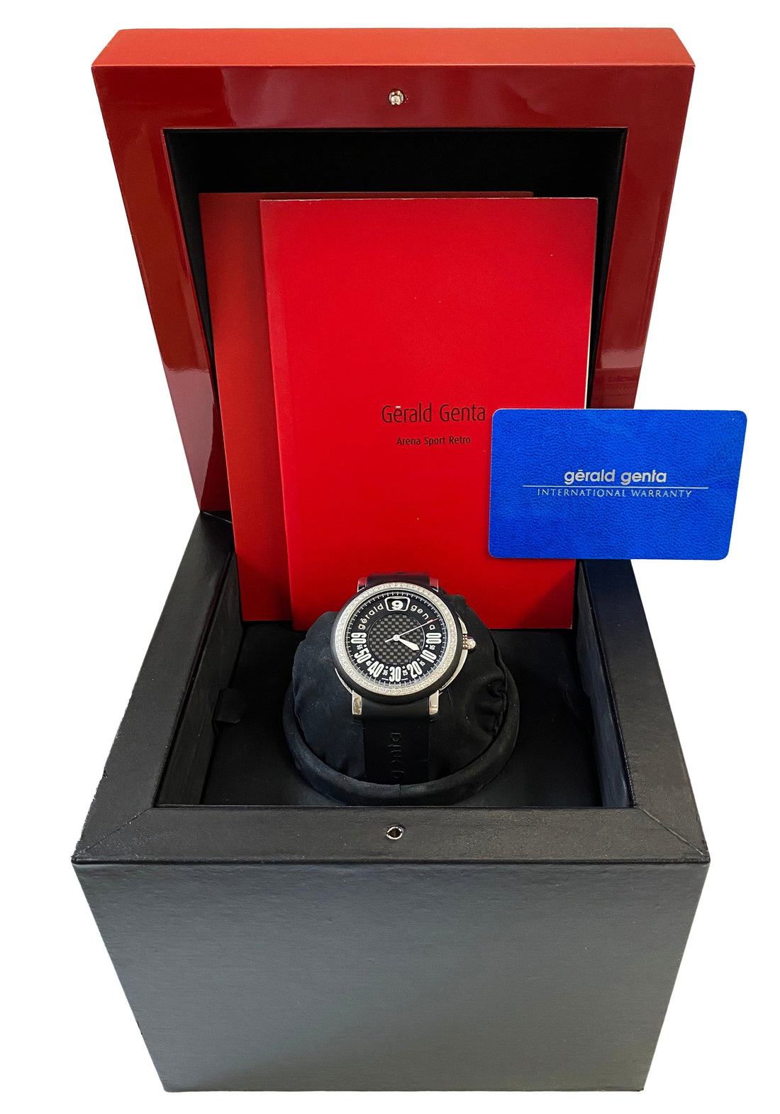 Gérald Genta Retro Sport RSP.X.10 Mens Watch. 41mm stainless steel case with original factory diamonds set bezel. Black dial with white hands and Arabic numeral hour marker. Feature jumping hours display at 12 o'clock position. Minutes are tracked between 3 and 9 o'clock position. Black rubber strap with stainless steel buckle. Strap in fair condition. Will fit up to 7.75-inch wrist. Sapphire crystal. Stainless steel case back. Automatic self-winding movement. This watch comes with Box and Papers.