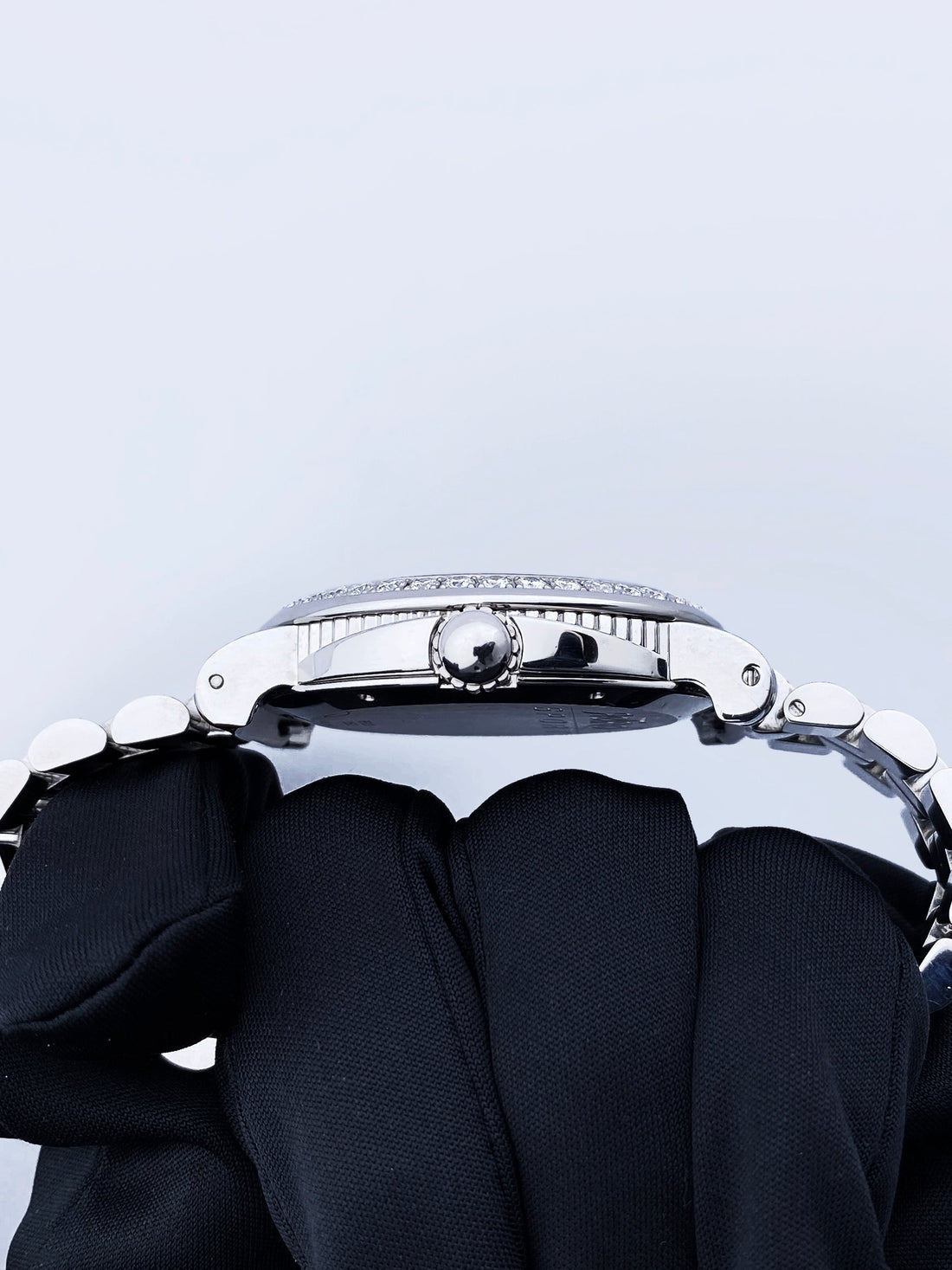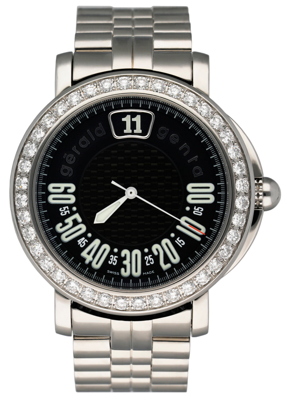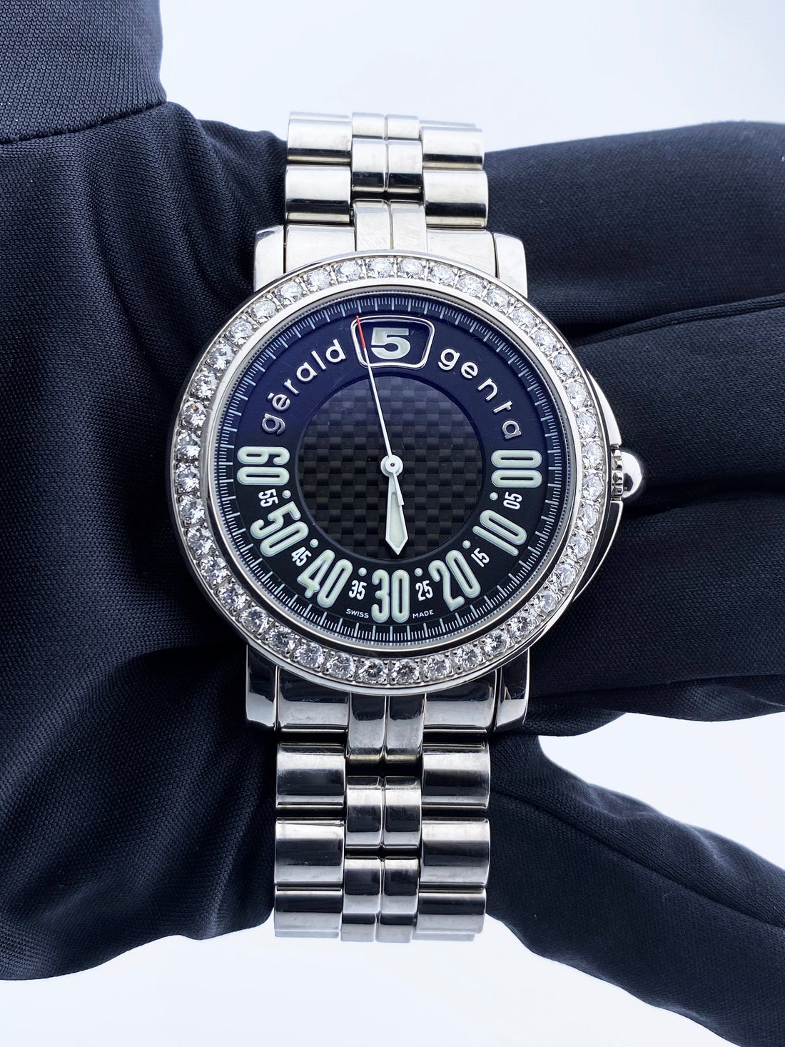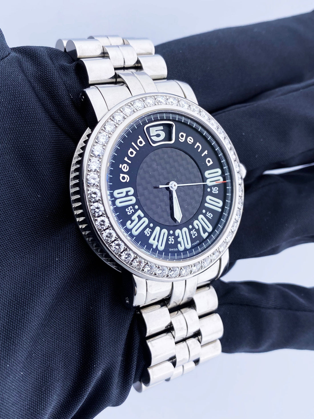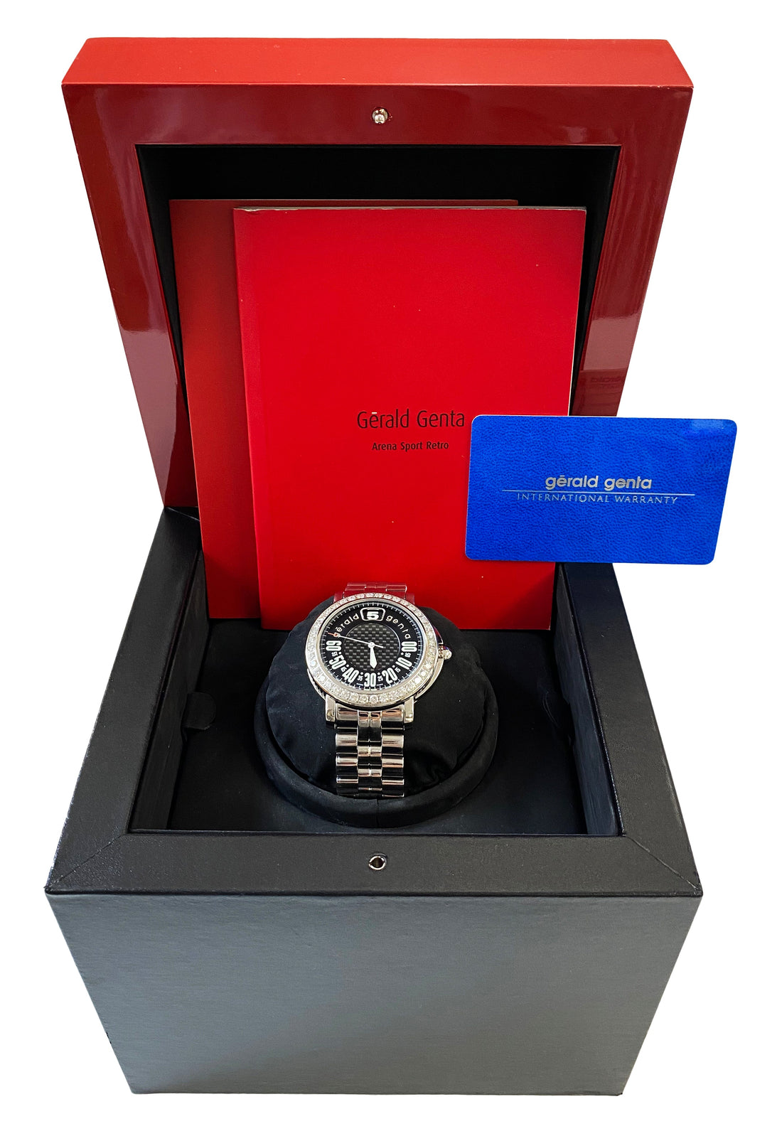 Gérald Genta Retro Sport RSP.X.10 Mens Watch. 41mm stainless steel case with original factory diamonds set bezel. Black dial with white hands and Arabic numeral hour marker. Feature jumping hours display at 12 o'clock position. Minutes are tracked between 3 and 9 o'clock position. Stainless steel bracelet with hidden butterfly clasp. Will fit up to 7-inch wrist. Sapphire crystal. Stainless steel case back. Automatic self-winding movement. This watch comes with Box and Papers.