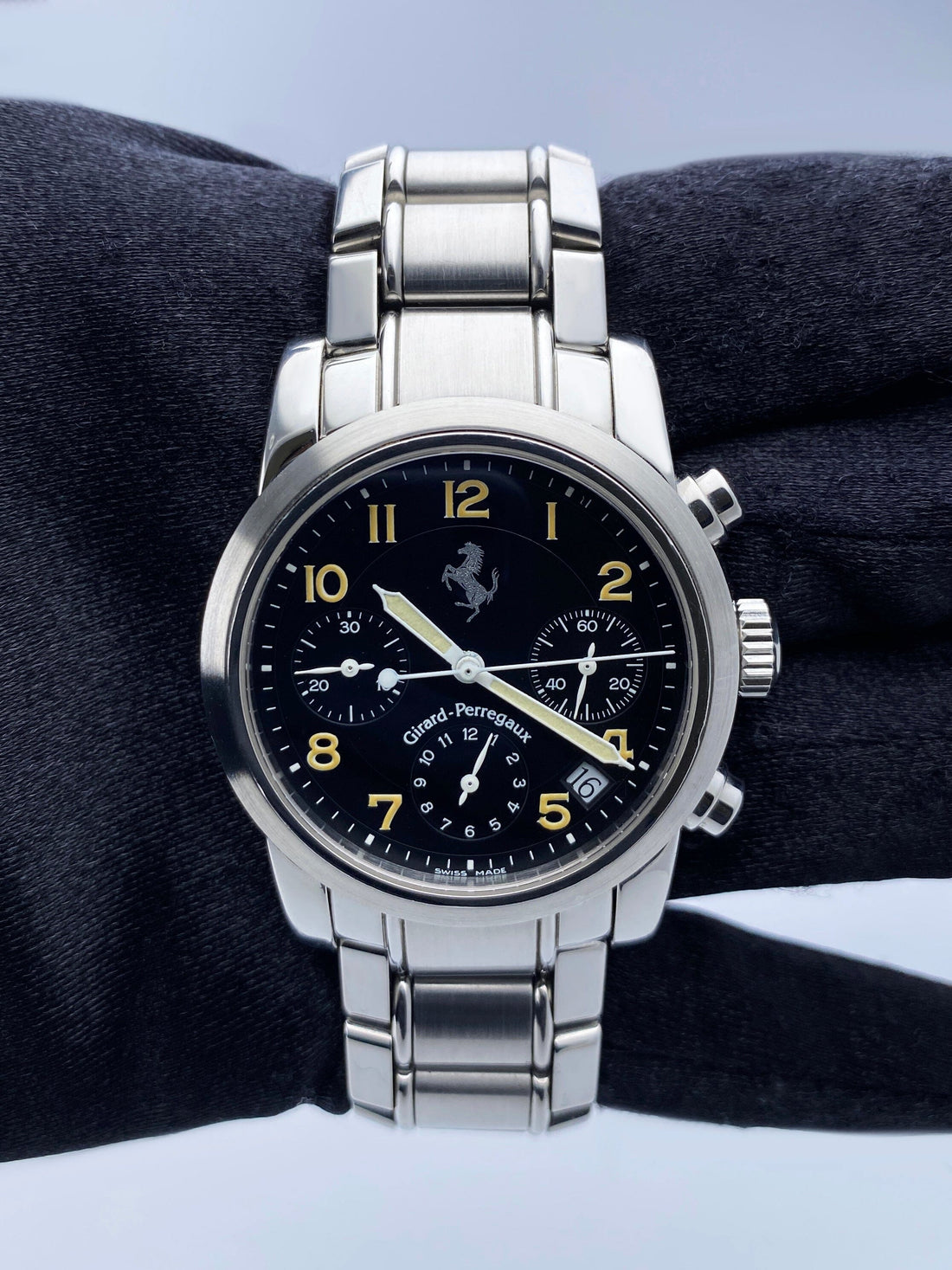 Girard Perregaux Ferrari 8020 Mens Watch. 38mm stainless steel case. Stainless steel bezel. Black dial with luminous hands and Arabic numeral hour marker. The date is display between 4 and 5 o'clock. Three sub-dials. Small seconds hand at 3 o'clock. 30-minute counter at 9 o'clock. 12-hour counter at 6 o'clock. Minute maker on the outer dial. Stainless steel bracelet with hidden butterfly clasp. Will fit up to 6.5-Inch wrist. Sapphire crystal. Stainless steel case back. Automatic self-winding movement.