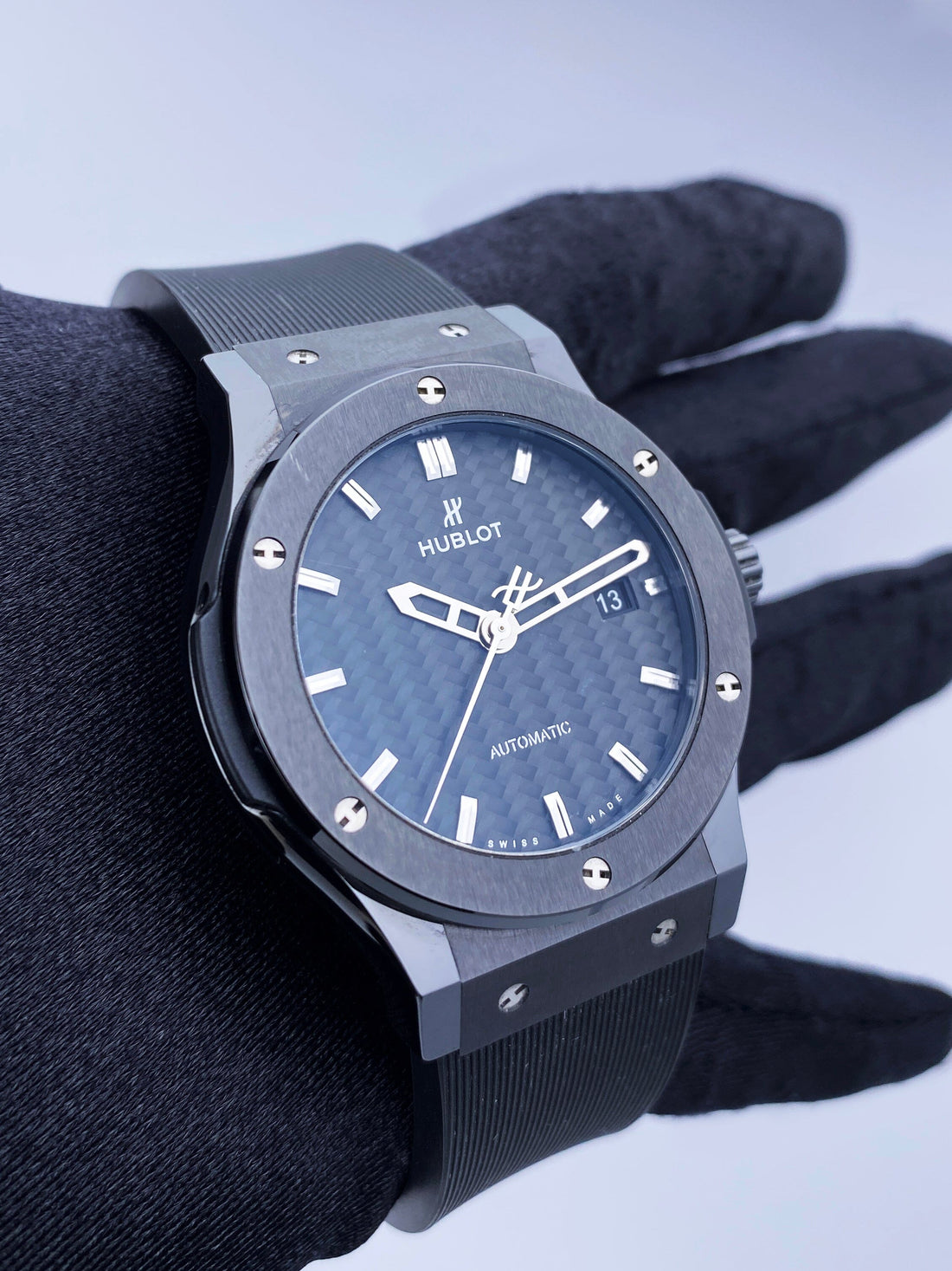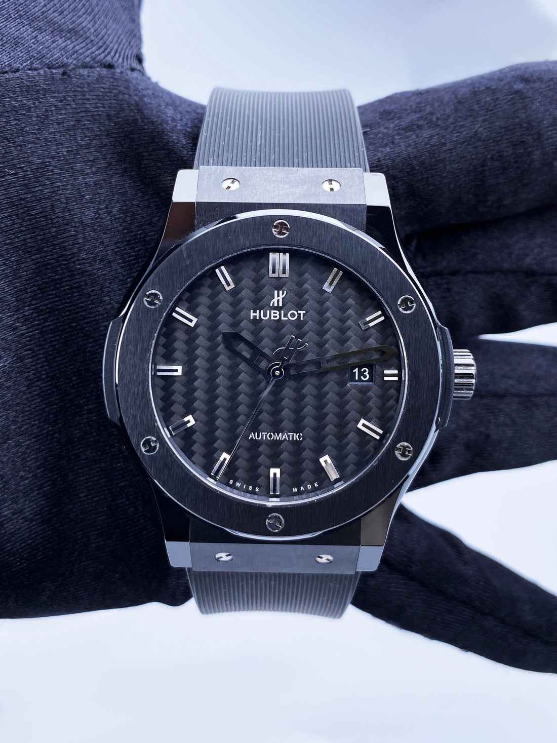 Hublot Classic Fusion 542.CM.1770.RX Mens Watch. 42mm black ceramic case. Black ceramic bezel. Black carbon fiber dial with sliver-tone hands and index hour marker. Date display at 3 o'clock position. Black rubber strap with deployment clasp with double push button. Will fit up to 7-Inch wrist. Sapphire crystal. Transparent sapphire crystal case back. Automatic self-winding movement.