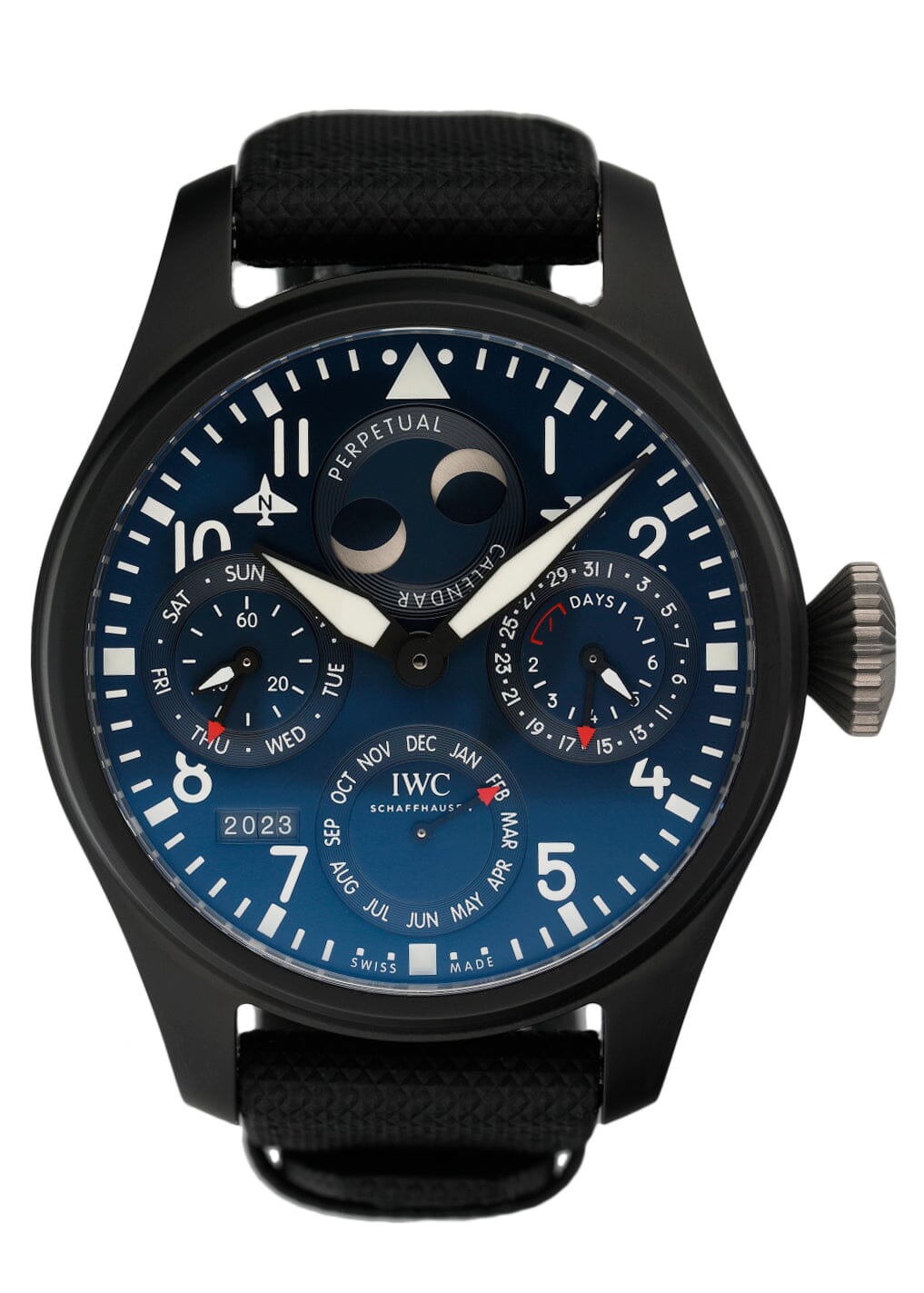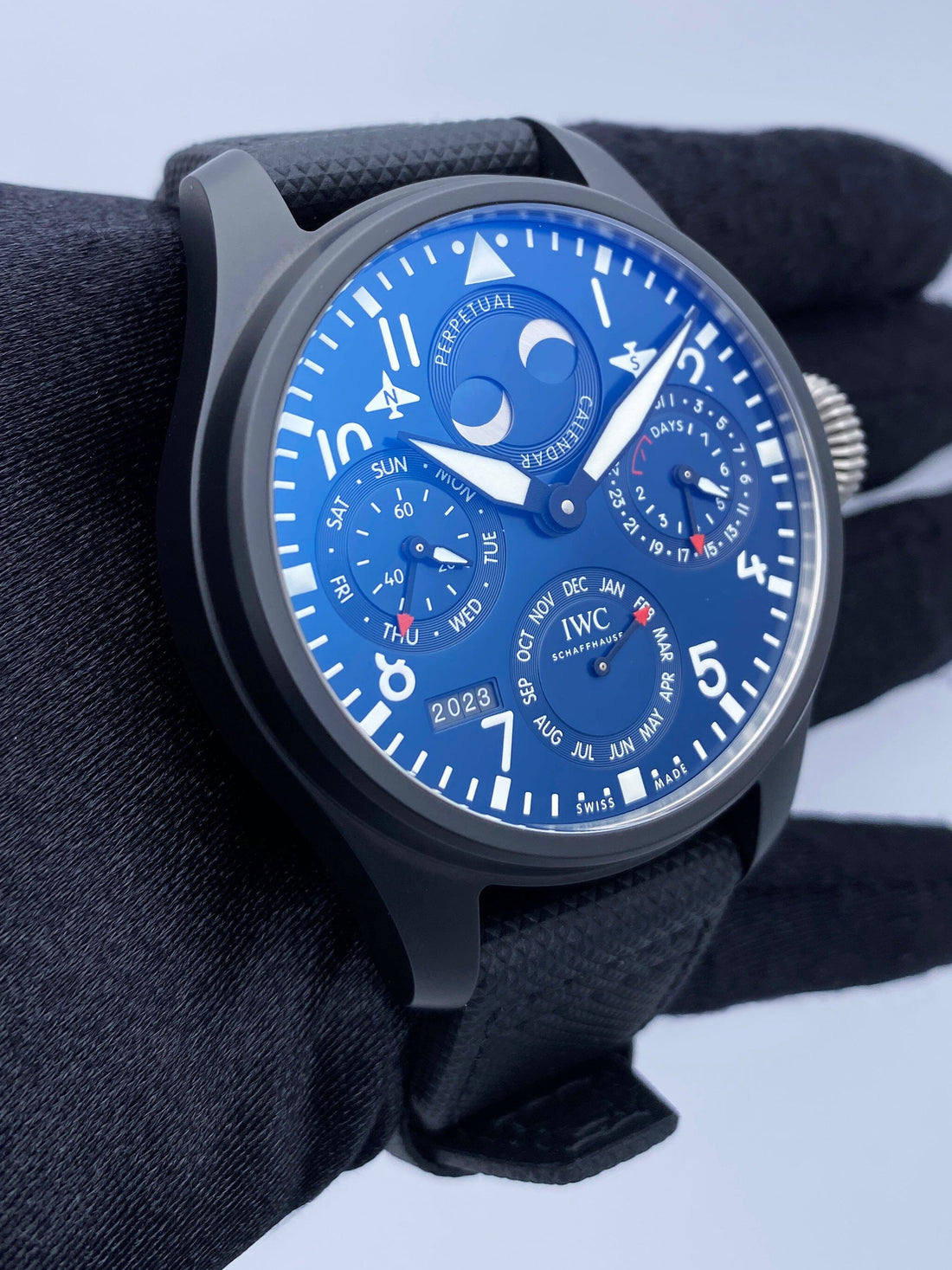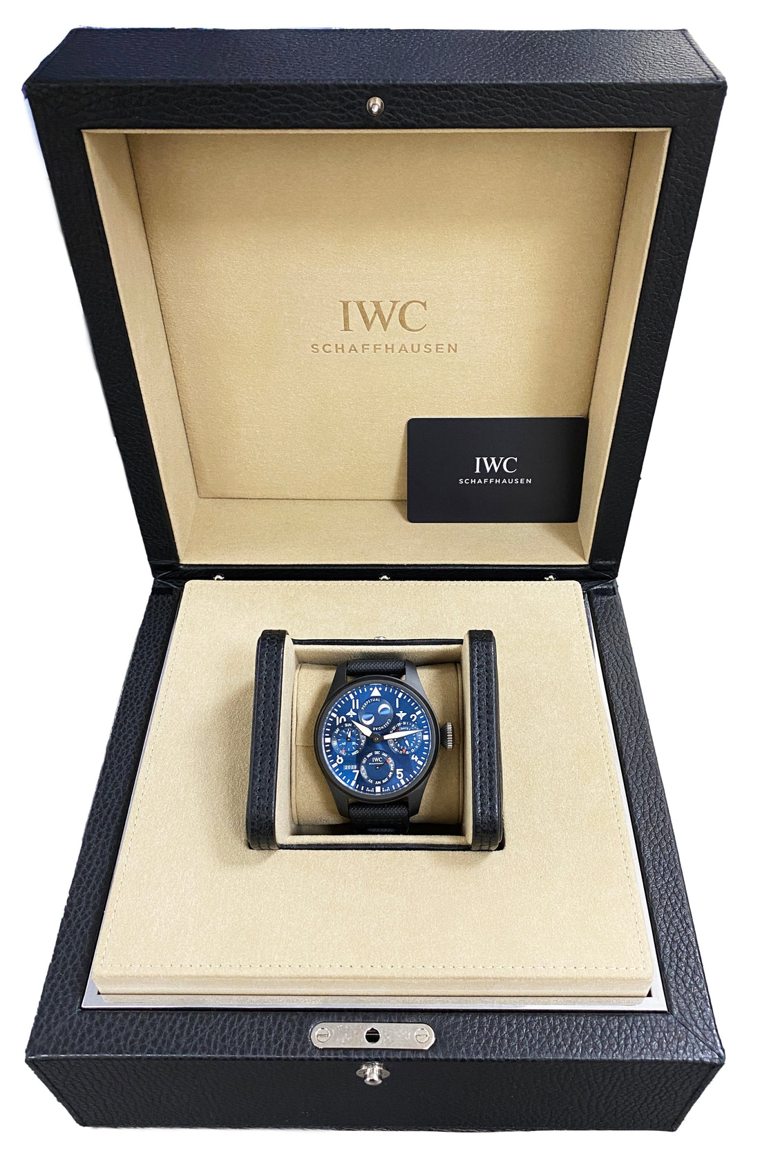 IWC Big Pilot's Perpetual Calendar Edition "Rodeo Drive" IW503001 Mens Watch. 46.5mm titanium / ceramic case. Titanium / ceramic bezel. Blue dial with black luminous hands and Arabic numeral hour markers. Perpetual calendar with displays for the date, day, month, year in four digits and perpetual moon phase for the northern and southern hemisphere. Black leather strap with stainless steel buckle. Will fit up to a 7-inch wrist. Sapphire crystal. Transparent sapphire crystal case back. Caliber 52615 Automatic self-winding movement with a 168-hour power reserve. This watch comes with original Box and Papers.