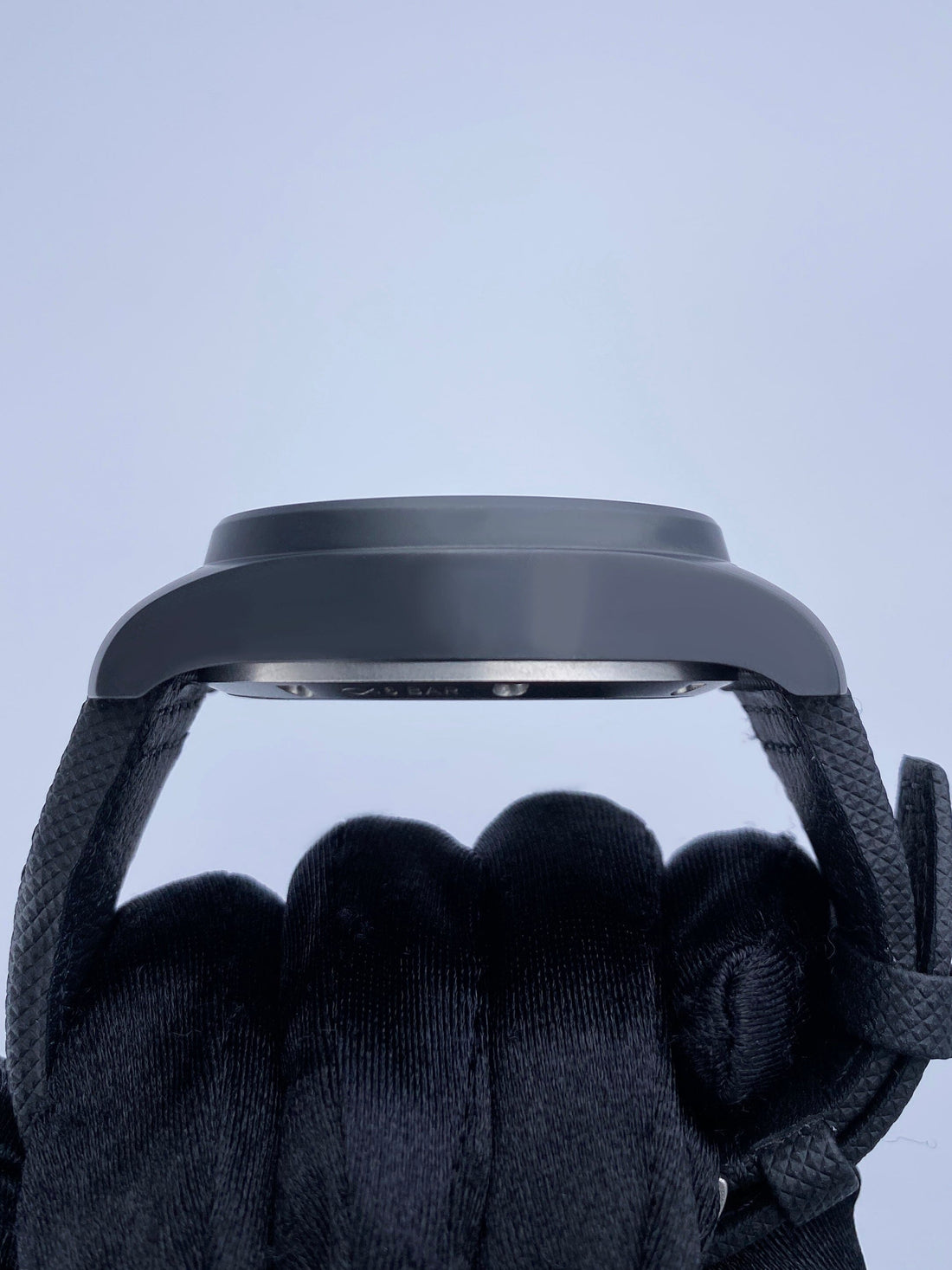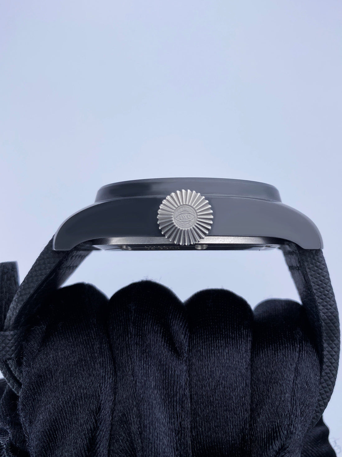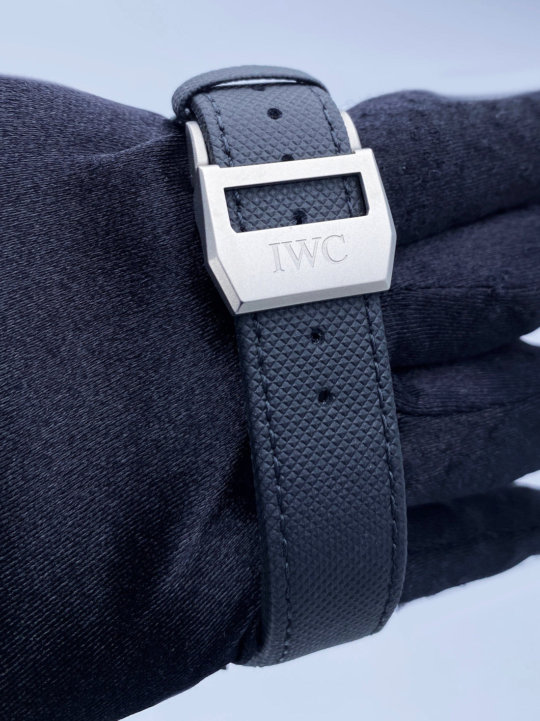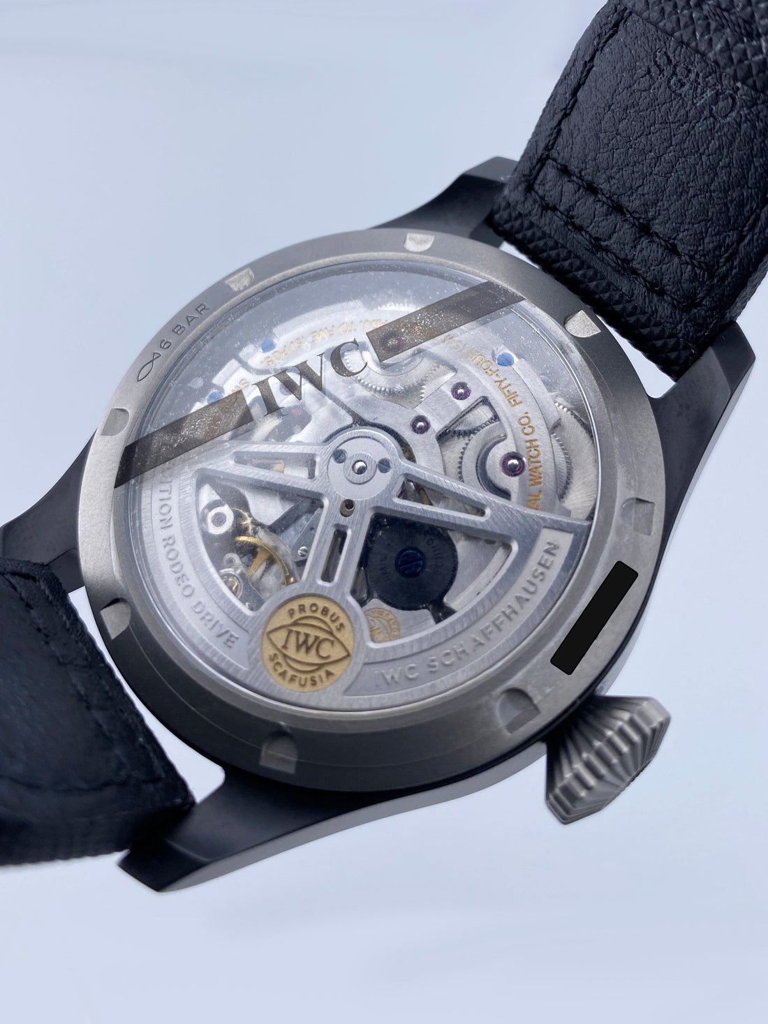 IWC Big Pilot's Perpetual Calendar Edition "Rodeo Drive" IW503001 Mens Watch. 46.5mm titanium / ceramic case. Titanium / ceramic bezel. Blue dial with black luminous hands and Arabic numeral hour markers. Perpetual calendar with displays for the date, day, month, year in four digits and perpetual moon phase for the northern and southern hemisphere. Black leather strap with stainless steel buckle. Will fit up to a 7-inch wrist. Sapphire crystal. Transparent sapphire crystal case back. Caliber 52615 Automatic self-winding movement with a 168-hour power reserve. This watch comes with original Box and Papers.