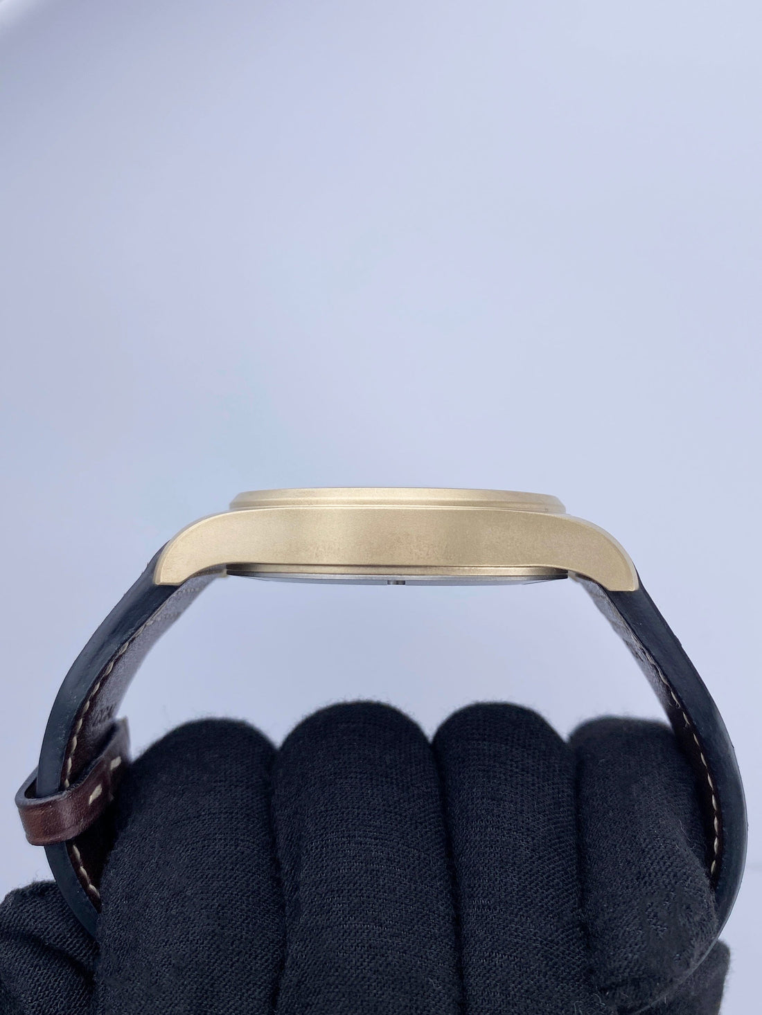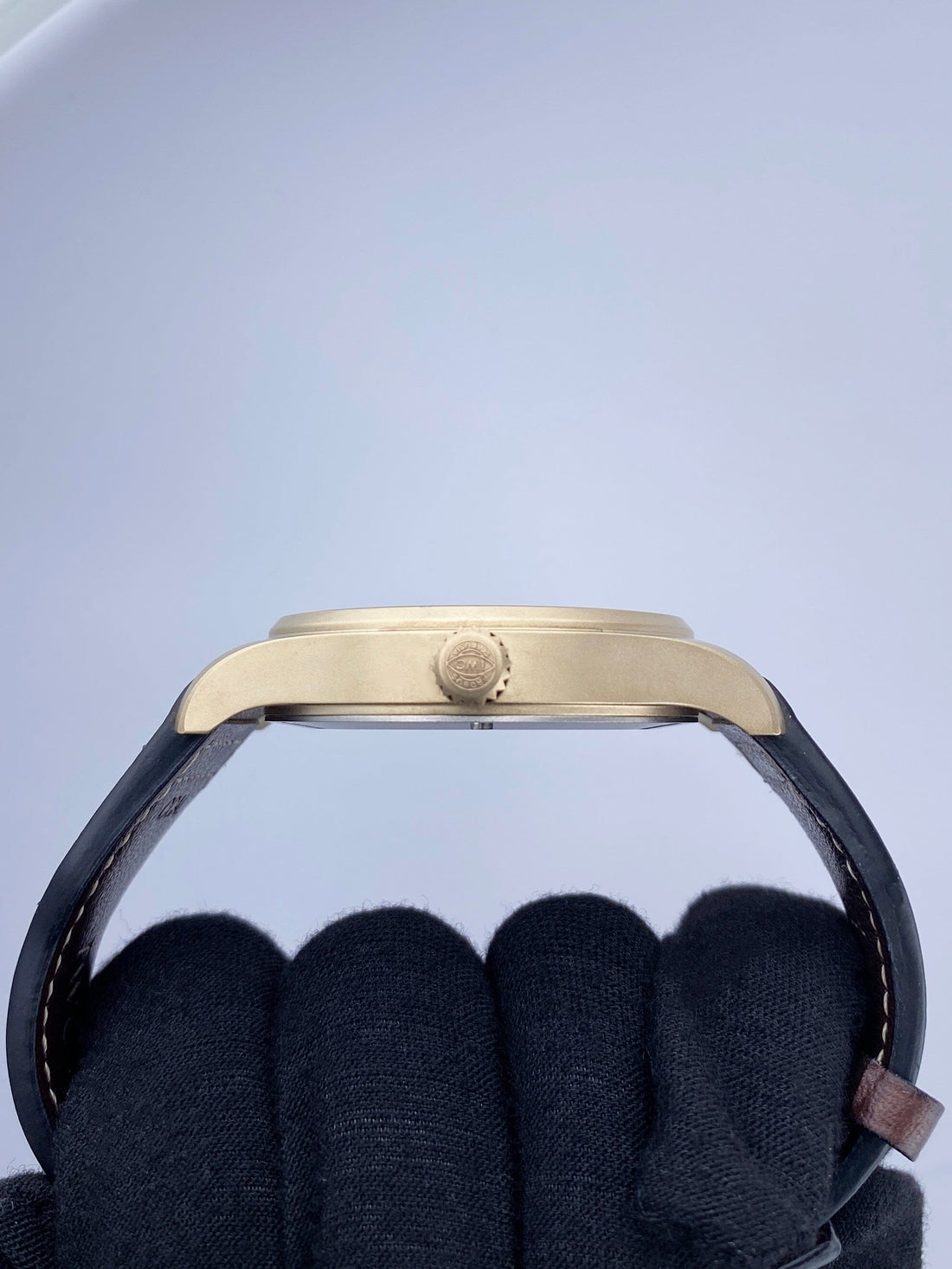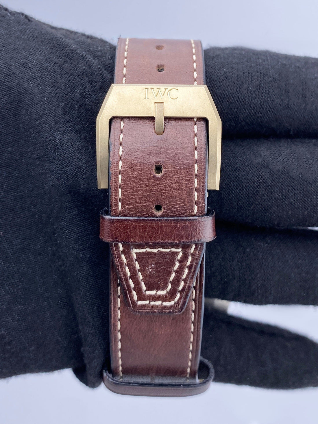 IWC Pilot Spitfire IW326802 Mens Watch. 39mm bronze case. Bronze bezel. Green dial with rose gold hands and Arabic numeral hour markers. Small second at 6 o'clock position. Minute markers on the outer dial. Brown leather strap with bronze buckle. Will fit up to a 7.5-inch wrist. Sapphire crystal. Bronze case back. Automatic self-winding movement.