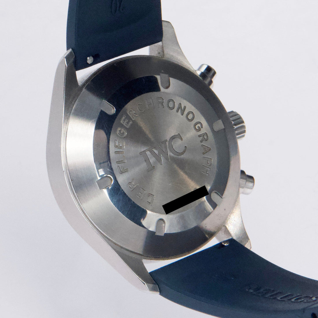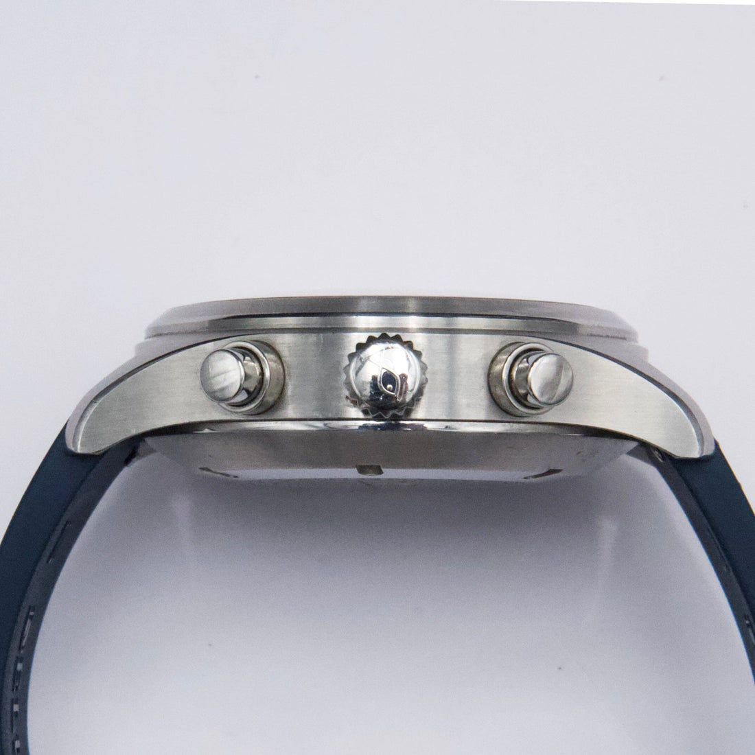 IWC Pilot Spitfire IW370623 Chronograph Mens Watch. 39mm stainless steel case. Stainless steel bezel. Silver dial with silver-tone hands and Arabic numeral hour markers. Sub-dials: Small second at 9 o'clock position, 30-minute at 12 o'clock and 12-hour counter at 6 o'clock position. Minute markers on the outer dial. Day & Date display at the 3 o'clock position. Blue rubber Delugs starp with Delugs deployment buckle. Will fit up to a 6.25-inch wrist. Sapphire crystal. Stainless steel case back. Automatic self-winding movement.