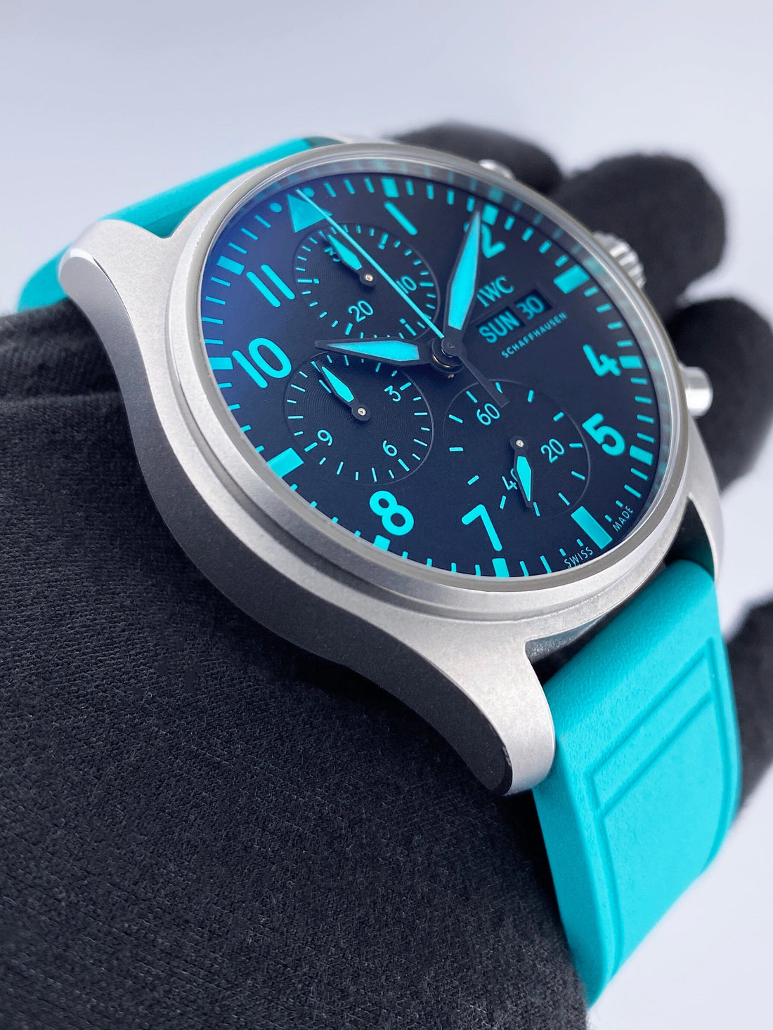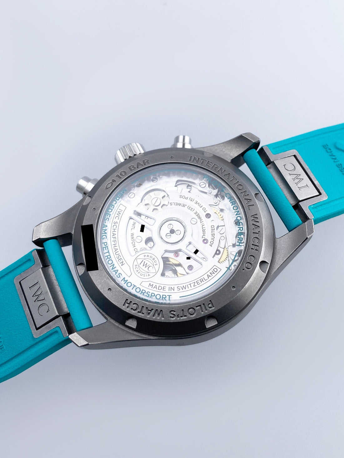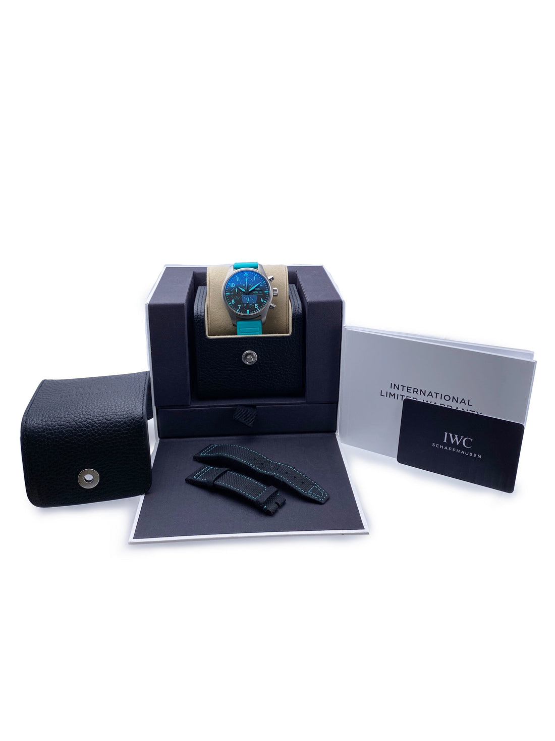 IWC Pilot's IW388108 41 Edition “Mercedes-AMG PETRONAS Formula One™ Team” Mens Watch. 41mm titanium case. Titanium bezel. Black dial with green luminous hands and Arabic numeral hour markers. Chronograph function with hours, minutes and seconds. Day and date display at 3 o'clock position. Green rubber strap with titanium buckle. Will fit up to a 7.5-inch wrist. Sapphire crystal. Transparent sapphire crystal case back. Caliber 69385 Automatic self-winding movement with a 46-hour power reserve. This watch comes with original Box and Papers.