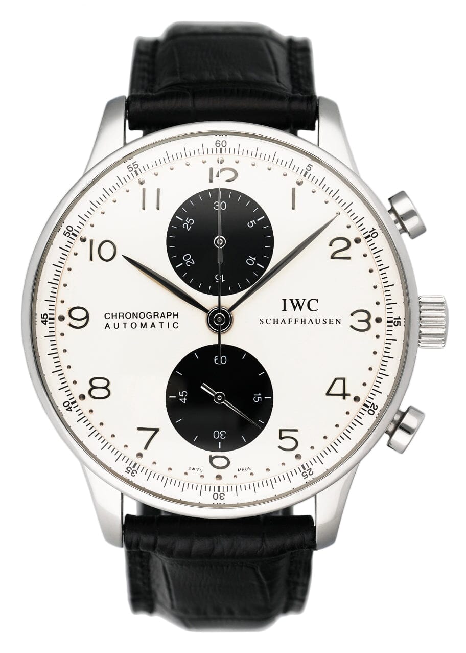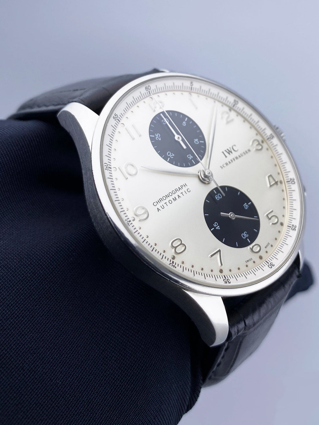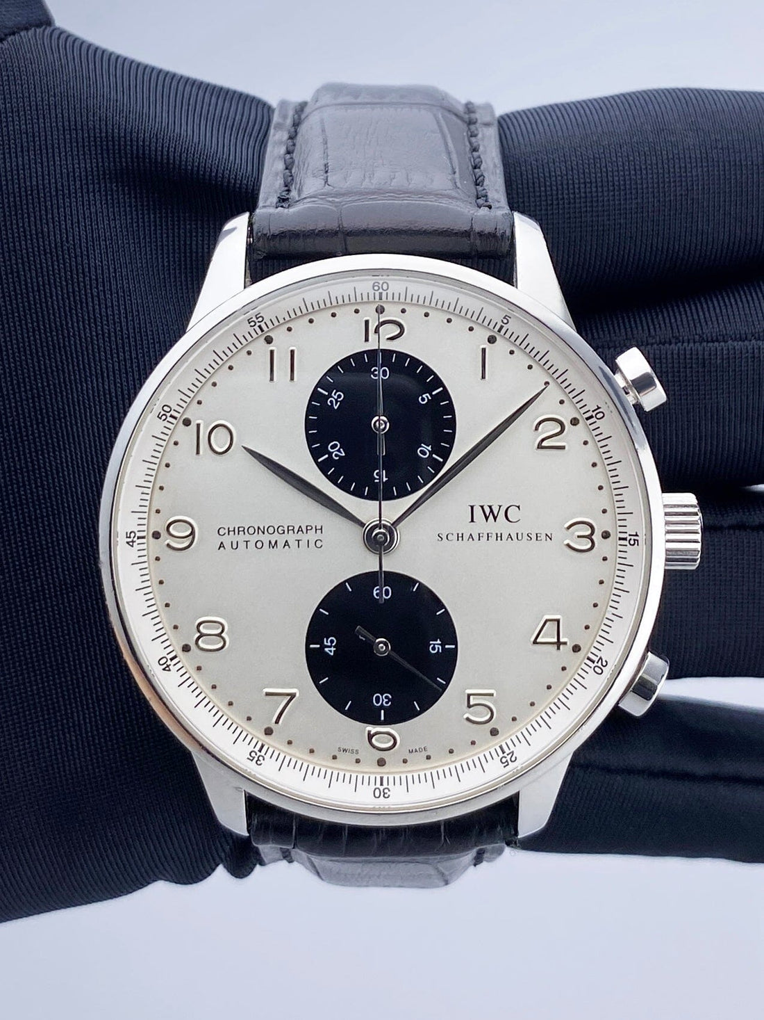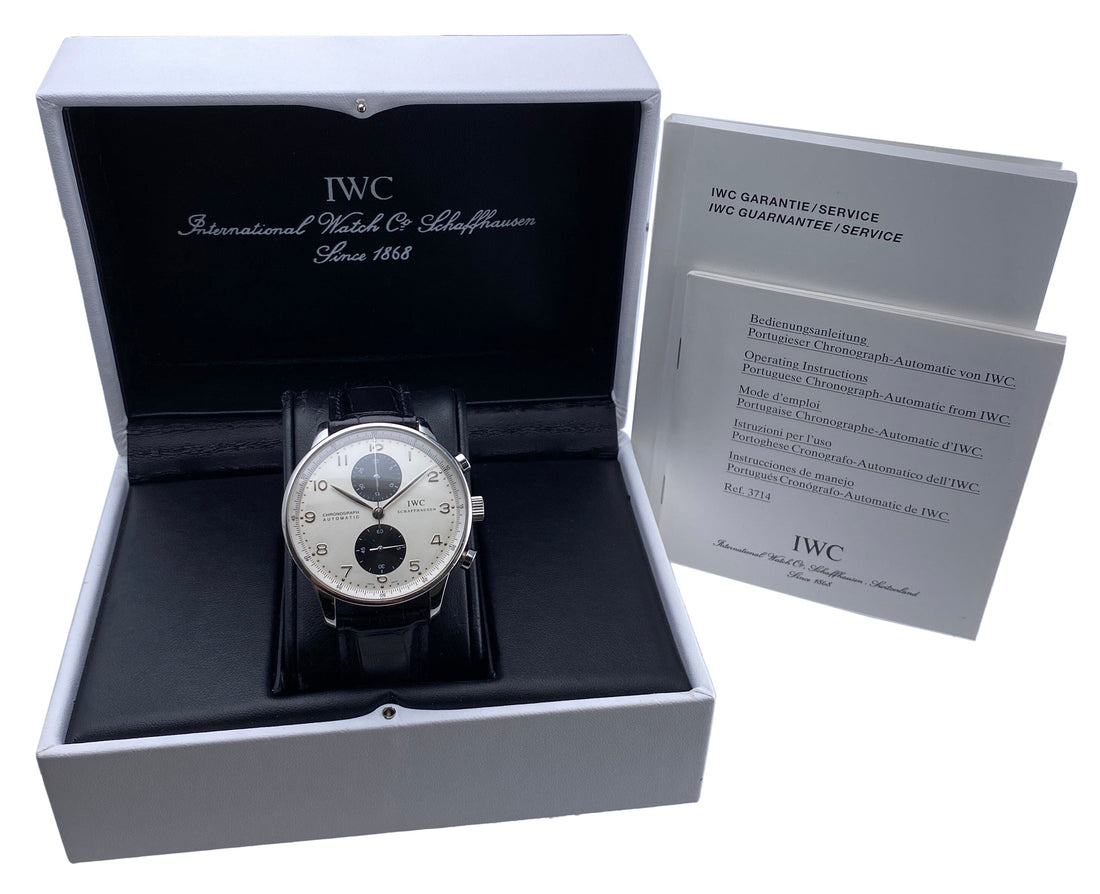 IWC Portuguese Chronograph IW371411 Mens Watch. 41mm stainless steel case. Stainless steel bezel. Silver dial with steel hands and Arabic numeral hour markers. Sub-dials: Small second at 6 o'clock position. 30 minute counter at 12 o'clock. Minute markers on the outer dial. Black aftermarket leather strap with stainless steel buckle. Will fit up to a 7.5-inch wrist. Sapphire crystal. Stainless steel case back Automatic self-winding movement. This watch comes with original Box and Papers.