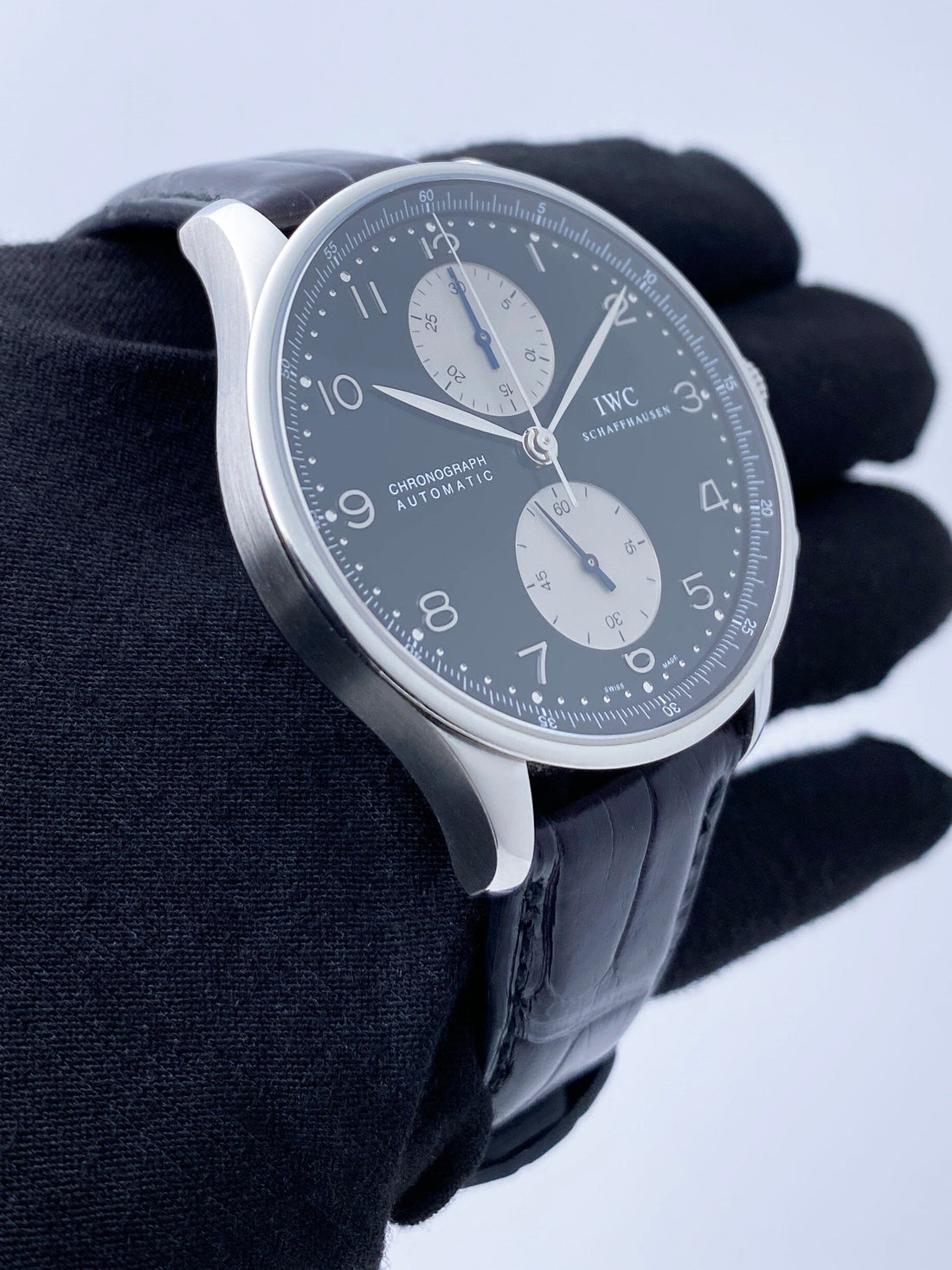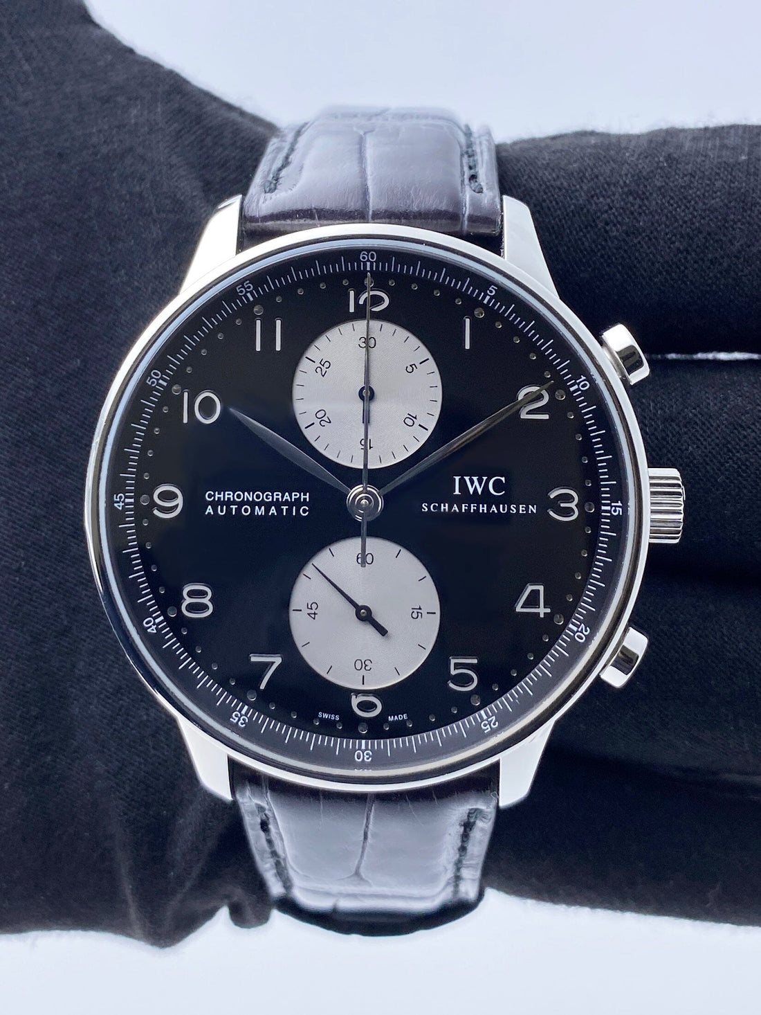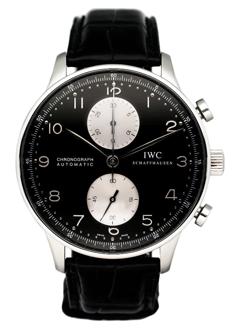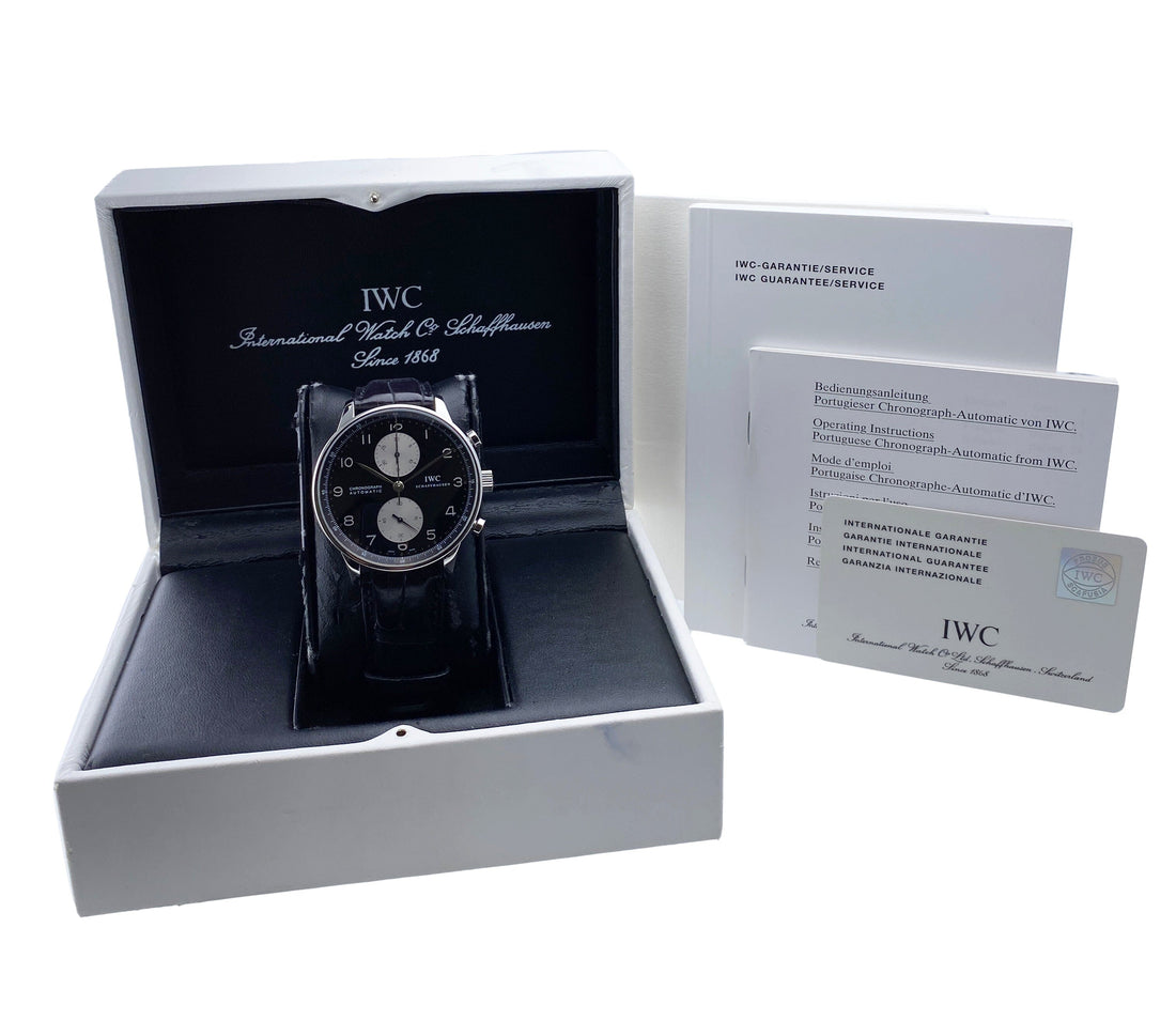 IWC Portuguese Chronograph IW371447 Mens Watch. 41mm stainless steel case. Stainless steel bezel. Black dial with steel hands and Arabic numeral hour markers. Sub-dials: Small second at 6 o'clock position. 30 minute counter at 12 o'clock. Minute markers on the outer dial. Black leather strap with deployment buckle. Will fit up to a 7-inch wrist. Sapphire crystal. Stainless steel case back Automatic self-winding movement. This watch comes with original Box and Papers.