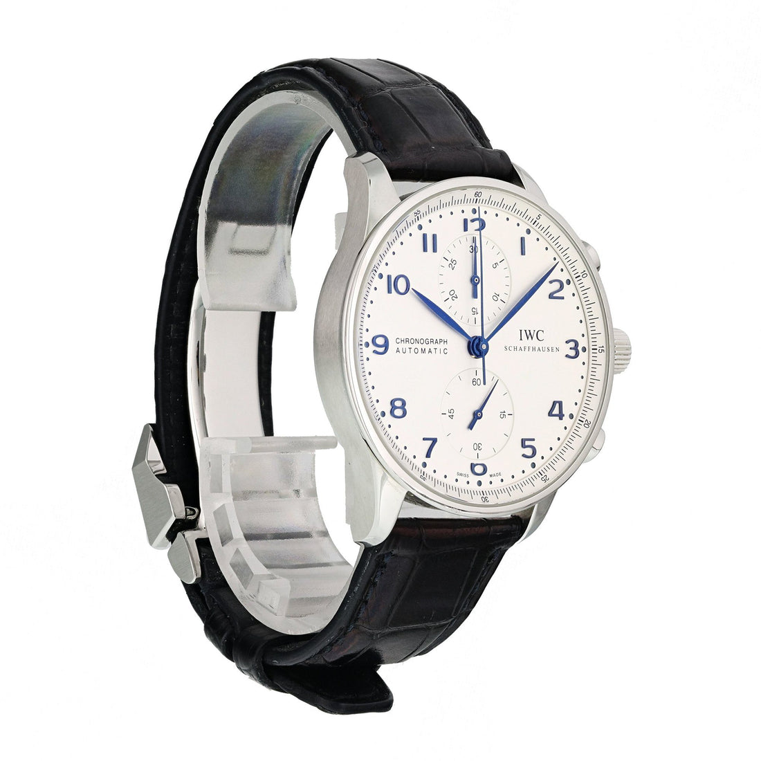 Silver dial with blue steel hands and Arabic numeral hour markers.
