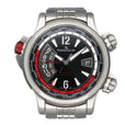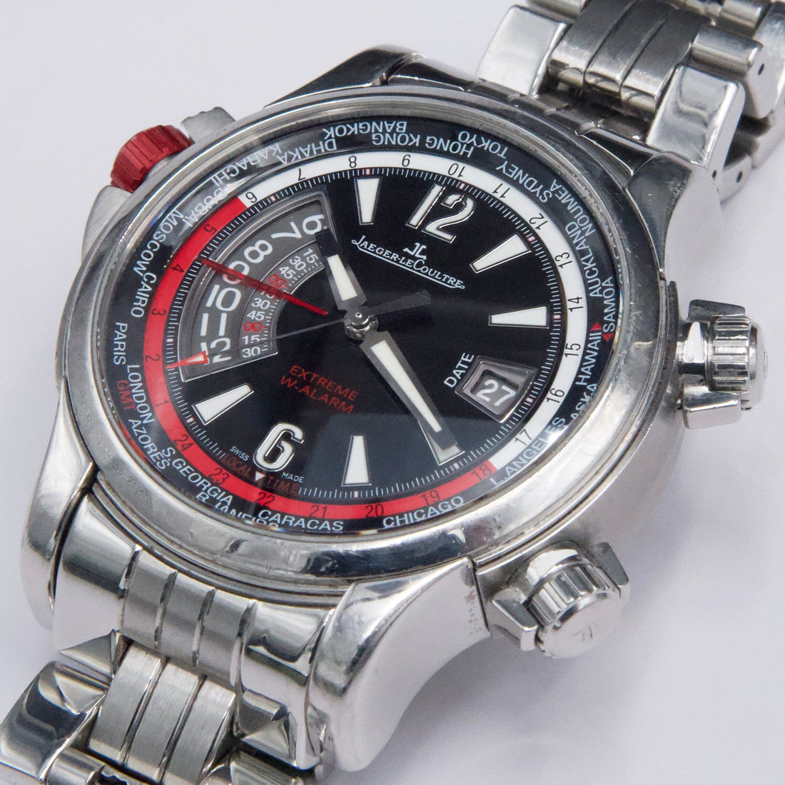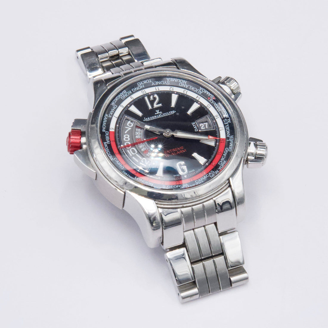 Jaeger-LeCoultre Master Compressor Extreme World Alarm 150.8.42 Mens Watch. 46mm stainless steel case. Stainless steel smooth bezel. Black dial with luminous steel hands and Arabic numeral & index hour marker. Date display at the 3 o'clock position. World time. Alarm clock. Stainless steel bracelet with butterfly clasp with safety. Will fit up to 7-Inch wrist. Sapphire crystal. Stainless steel case back. Automatic self-winding movement. This watch comes with original Box and Papers.