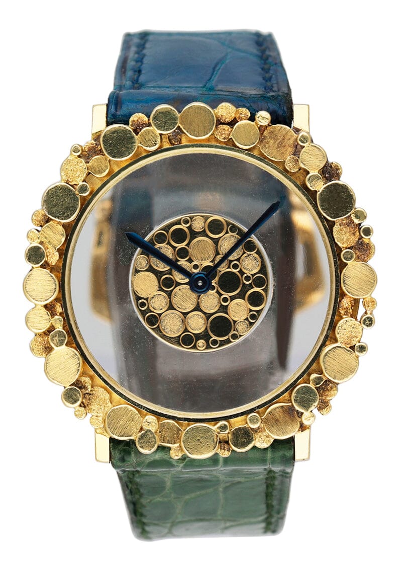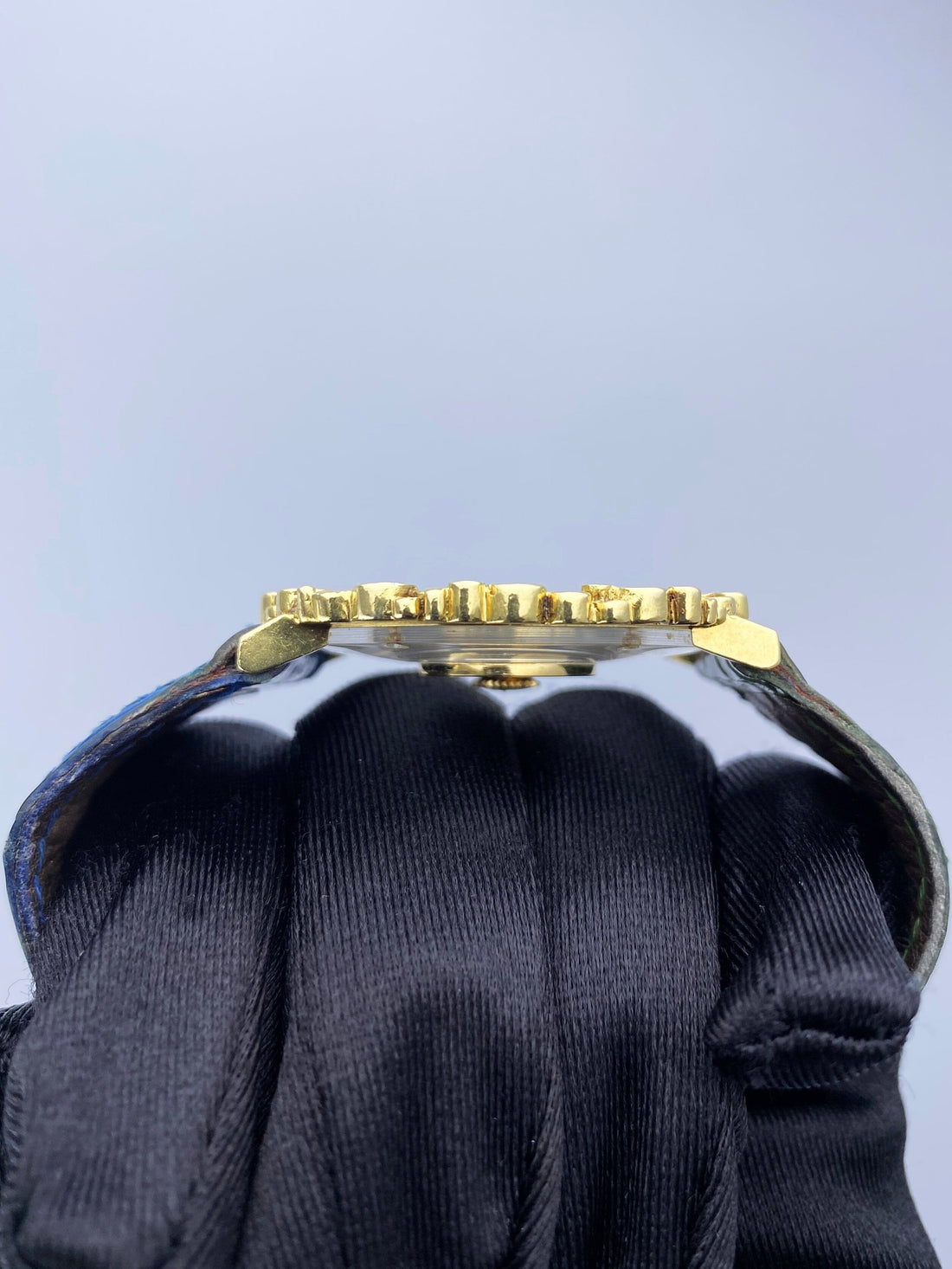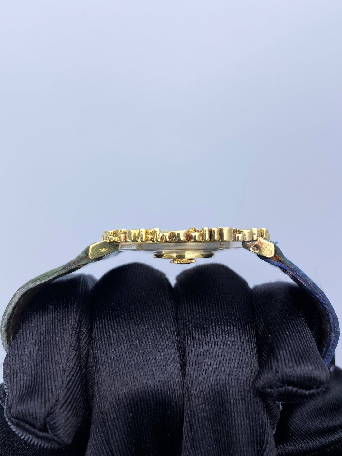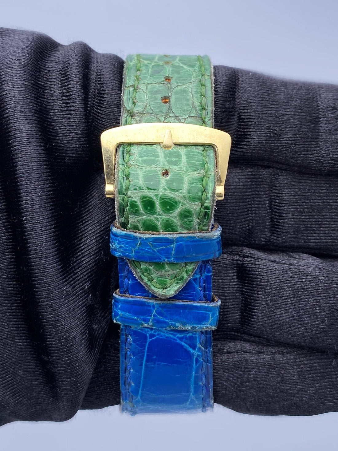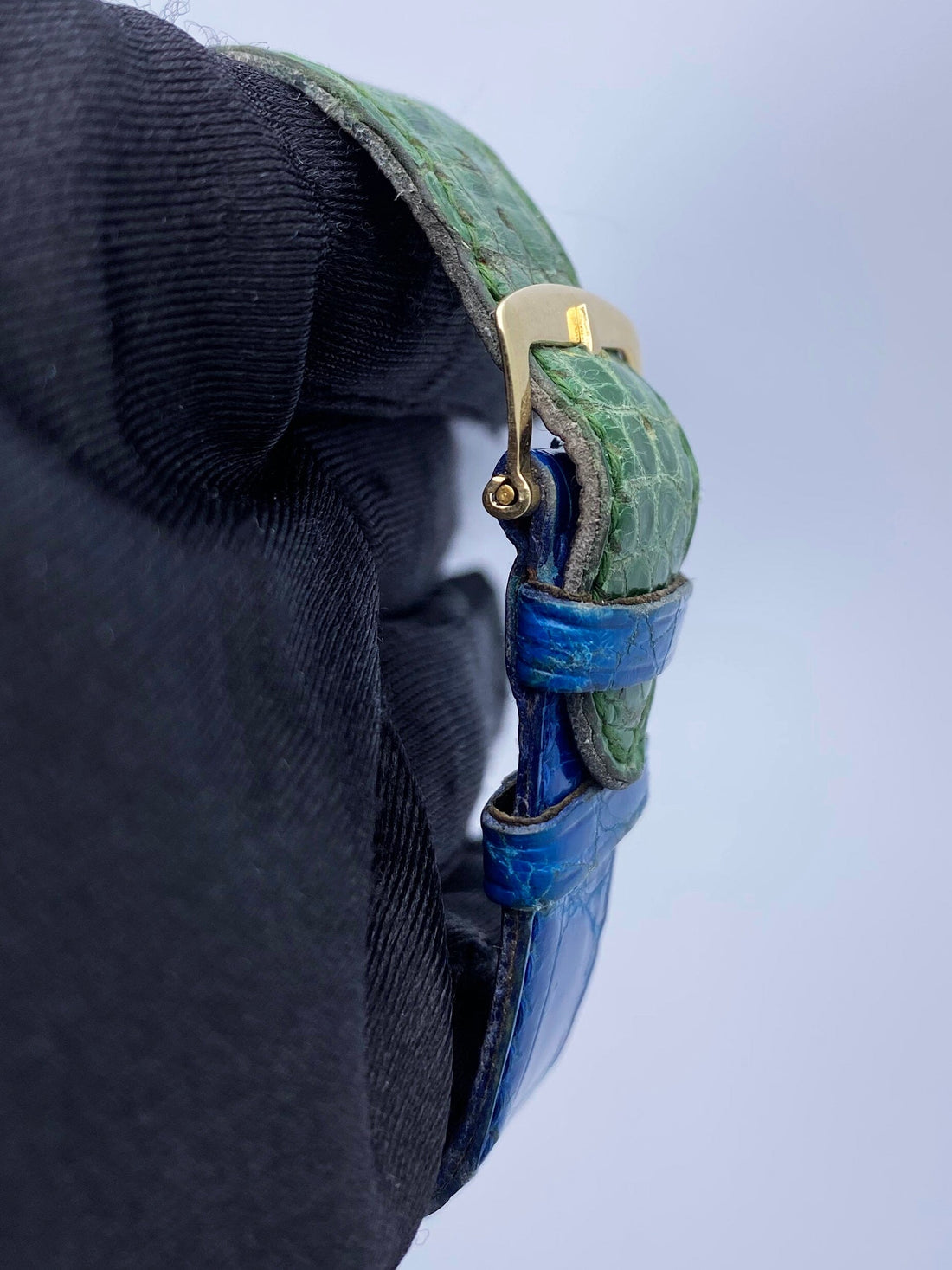 Jaeger-LeCoulture Mystery Dial 18K Yellow Gold Nuggest Watch. 37mm 18K yellow gold Nuggest case. Mystery dial with blue hands. Blue & green leather aftermarket strap with 14K yellow gold buckle. Will fit up to a 6-inch wrist. Acrylic crystal. 18K yellow gold case back. Mechanical hand-winding movement.
