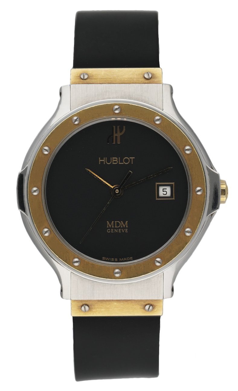 Hublot 1391.2 MDM ladies watch. 28mm stainless steel case. 18k yellow gold bezel and lugs. Black dial with gold hands. Date display at 3 o'clock position. Black rubber strap with stainless steel & 18K yellow gold hidden double folding clasp; will fit up to a 6 inch wrist. Quartz battery movement. Sapphire crystal, stainless steel case back.