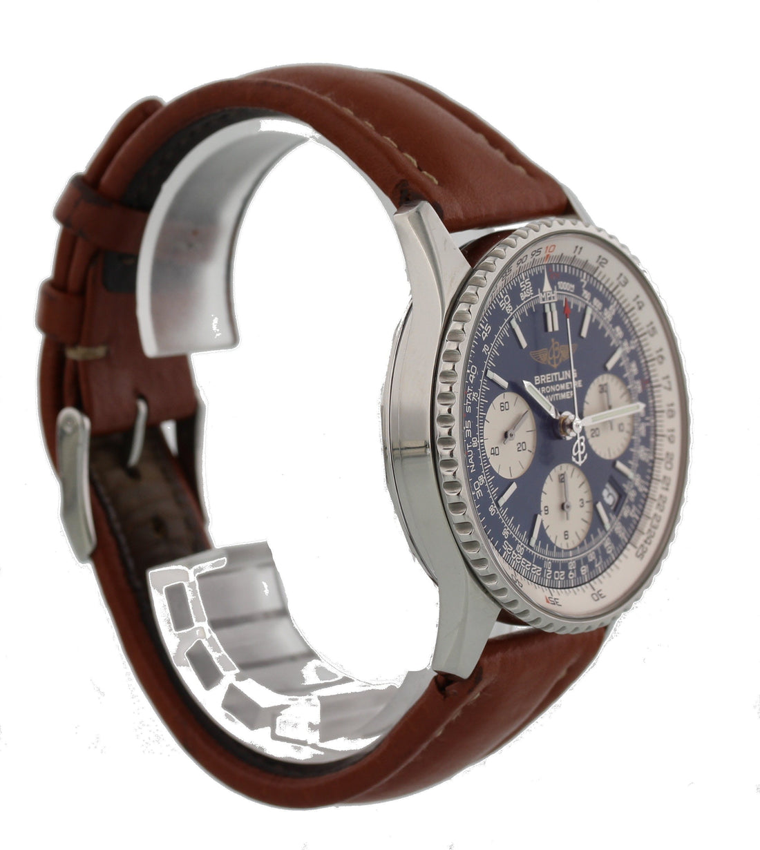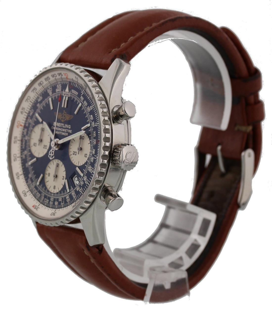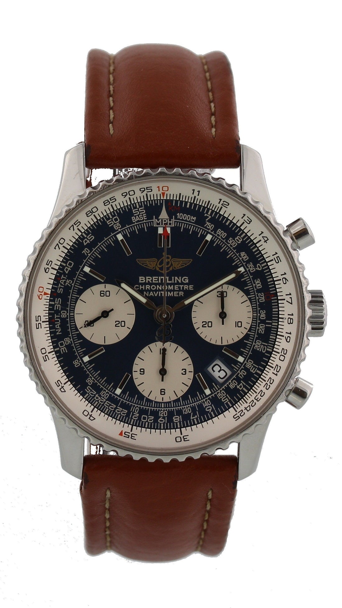 Breitling Navitimer A23322. 42mm stainless steel case and steel bezel. Triple register blue dial with tachymeter and date display. Luminous hands and markers. Original Breitling brown leather band with a stainless steel buckle. Water resistant. Automatic movement. Sapphire crystal glass; Comes with an original box and an additional blue strap. This watch is backed by our two year warranty.