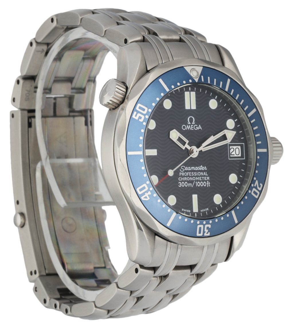 Omega Seamaster professional Chronometer Mid-Size 2551.80.00 Mens Watch. 36mm stainless steel case. Unidirectional stainless steel bezel with blue bezel insert. Blue dial with luminous steel hands and index hour marker. Date display at 3 o'clock position. Stainless steel bracelet with fold over push button safety clasp. Will fit up to a 7-inch wrist. Water resistant 300 meters. Quartz battery powered movement.