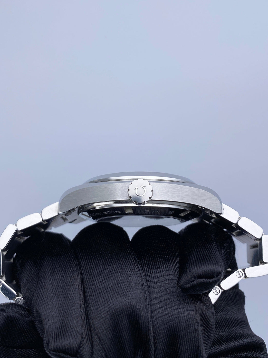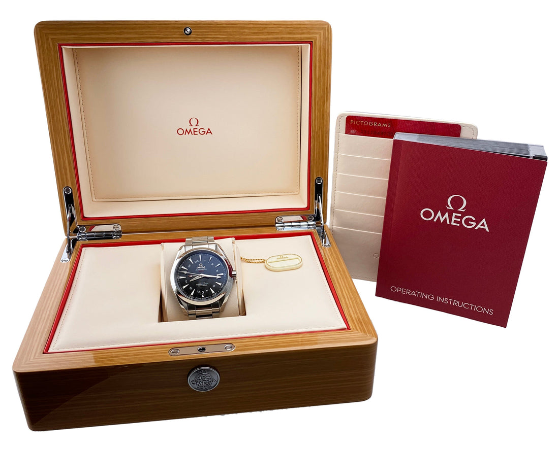 Omega Seamaster Aqua Terra GMT 231.10.43.22.01.001 Mens Watch. 43mm stainless steel case. Stainless steel bezel. Black dial with luminous steel hands and index hour markers. Minute markers on the outer dial. The date is displayed at the 6 o'clock position. Stainless steel bracelet with hidden butterfly clasp. Will fit up to a 7.5-inch wrist. Sapphire crystal. Stainless steel case back. Automatic self-winding movement. This watch comes with original Box and Papers.